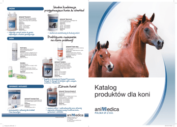 Idealna kombinacja przygotowująca konia do startów! MIĘŚNIE derbymed® Orysanol E Płynna mieszanka paszowa uzupełniająca dla koni, wspomagająca budowę układu mięśniowego oraz uzupełniająca witaminy Dawkowanie: Konie o m.c.: 150 kg – 2,5-20 ml/dzień, 300 kg – 5-40 ml/dzień, 600 kg – 10-80 ml/dzień Opakowanie: Butelka 1000 ml stymuluje wzrost mięśni do granic zapisanych w kodzie genetycznym SKÓRA derbymed® Myocrescat Mieszanka paszowa uzupełniająca dla koni w postaci granulatu Dawkowanie: Konie o m.c.: 150 kg – 10-20 g/dzień, 300 kg – 20-40 g/dzień, 600 kg – 40-80 g/dzień Opakowanie: 1300 g dostarcza aminokwasy do budowy mięśni Praktyczne rowiązania na różne problemy! derbymed® Puder-spray Alumi-Spray Puder do rozpylania na skórę narażoną na uszkodzenia Tlenek cynku i olejki eteryczne z roślin Dawkowanie: Zmienione partie skóry ostrożnie oczyścić i pokrywać 2-3 × dziennie z odległości 10-20 cm. Opakowanie: Pojemnik 200 ml Spray pielęgnacyjno-ochronny Zmikronizowane aluminium Dawkowanie: Rozpylać na skórę z odległości 20 cm przez 1-2 sekundy. W razie potrzeby zabieg powtarzać kilka razy dziennie. Opakowanie: Pojemnik 200 ml Chenidine Żel hydroaktywny Algi, olejki eteryczne i wyciągi z roślin Dawkowanie: Do użytku zewnętrznego. Zranione miejsce smarować grubą warstwą żelu 2 × dziennie Opakowanie: Tubka 20 g, dozownik 100 g derbymed® Keraderm Płynna mieszanka paszowa uzupełniająca dla koni, do dodatkowego i szybkiego zaopatrzenia w witaminy, mikroelementy, substancje odżywcze. Wzmocnienie kopyt, skóry, sierści. Dawkowanie: Konie o m.c.: 200 kg – 3,5-5,5 ml/dzień, 400 kg – 6,5-10 ml/dzień, 600 kg – 10-15 ml/dzień Opakowanie: Butelka 1000 ml b ogaty w nienasycone kwasy tłuszczowe Omega-3, Omega-6, biotynę, cynk, mangan, metioninę i fitosterole ODPORNOŚĆ I WITALNOŚĆ Zdrowie konia! derbymed® Viverosan Komplex B derbymed® Imunogen Paste Mieszanka paszowa uzupełniająca dla koni, wzmacniająca system immunologiczny Dawkowanie: 5-30 ml dziennie/zwierzę Opakowanie: 12 strzykawek po 30 ml przeciwciała i witaminy dla źrebiąt i koni dorosłych Płynna mieszanka paszowa uzupełniająca dla koni Dawkowanie: Źrebięta – 10-15 ml/dzień przez 3-5 dni, Klacze zarodowe – 15 ml/dzień, Konie/konie wyczynowe o m.c.: 200 kg – 5-7,5 ml/dzień, 400 kg – 10-15 ml/dzień, 600 kg – 15-25 ml/dzień Opakowanie: Butelka 1000 ml zawiera mikro- i makroelementy oraz witaminy zapewnia właściwy rozwój, krwiotworzenie, sprawność i witalność skuteczne leczenie Katalog_konie_092014.indd 1-2 Katalog produktów dla koni aniMedica Polska Sp. z o.o. ul. Chwaszczyńska 198 a 81-571 Gdynia, tel.: 58/572 24 38, fax: 58/572 24 39 www.animedica.pl 2014-10-02 08:48:22 Idealne trio przy RAO! UKŁAD ODDECHOWY Koń nie kuleje! PRZECIWZAPALNE Animeloxan 20 mg/ml derbymed® Bronchopulmin Dilaterol 25 mikrogramów/ml Płynna mieszanka paszowa uzupełniająca dla koni stymulująca fizjologiczną odporność układu oddechowego Dawkowanie: Konie o m.c.: 200 kg – 5-10 ml, 400 kg – 10-20 ml, 600 kg – 15-30 ml 1-4 × dziennie Opakowanie: Butelka 1000 ml Syrop dla koni Klenbuterolu chlorowodorek 25 mikrogramów/ml Dawkowanie: 4 ml/125 kg m.c. 2 × dziennie p.o. Okres karencji: Tkanki jadalne – 28 dni Opakowanie: Butelka 355 ml z pompką dozującą agonista receptorów β2-adrenergicznych rozszerza oskrzela Roztwór do wstrzykiwań dla bydła, świń i koni Meloksykam 20 mg/ml Dawkowanie: 3 ml/100 kg m.c. i.v. Okres karencji: Tkanki jadalne - 5 dni Opakowania: Fiolki 50 ml i 100 ml upłynnia śluz i wspomaga jego wydalanie działa przeciwzapalnie, przeciwgrzybiczo oraz stymuluje układ odpornościowy do długotrwałego podawania s kuteczny w schorzeniach układu ruchu w jednej iniekcji do ograniczania bólu związanego z kolką Roztwór do wstrzykiwań dla bydła, koni i królików Octan busereliny 0,0042 (co odpowiada 0,004 mg busereliny) Dawkowanie: 10 ml/zwierzę i.m., i.v., s.c. Okres karencji: Brak Opakowanie: 5 fiolek po 10 ml ANESTEZJOLOGICZNE I PRZECIWBÓLOWE Ulga w dolegliwościach trawiennych! UKŁAD POKARMOWY Nerfasin vet. 20 mg/ml Roztwór do wstrzykiwań dla bydła, koni, psów i kotów Ksylazyna 20 mg/ml Dawkowanie: 3-5 ml/100 kg m.c. i.v. Okres karencji: Tkanki jadalne – 1 dzień Opakowanie: Fiolka 50 ml Nowość! Menbutil® 100 mg/ml derbymed® Ulcosan Roztwór do wstrzykiwań dla bydła, świń, koni, owiec i kóz Menbuton 100 mg/ml Dawkowanie: 1 ml/20-40 kg m.c. i.v. podanie można powtórzyć po 24 godzinach Okres karencji: Brak Opakowanie: Fiolka 100 ml wspomaga trawienie poprawia apetyt Mieszanka paszowa uzupełniająca dla koni zmniejszająca reakcje stresowe i wspomagająca regenerację błony śluzowej żołądka Dawkowanie: Konie o m.c.: 200 kg – 20 g/2-3 × dzień, 400 kg – 30 g/2-3 × dzień, 600 kg – 50 g/2-3 × dzień Opakowanie: 2500 g Mieszanka paszowa uzupełniająca dla źrebiąt stabilizująca gospodarkę wodno-elektrolitową Dawkowanie: Źrebięta do 2 miesięcy 2 x 15 ml dziennie, starsze źrebięta i konie dorosłe 4 x 15 ml dziennie przez 1-7 dni Opakowanie: 8 strzykawek po 60 ml przy biegunce u źrebiąt i koni dorosłych z awiera taninę, elektrolity, witaminy z grupy B, witaminę E, pro- i prebiotyki Katalog_konie_092014.indd 3-4 Genestran® 75 mikrogramów/ml Roztwór do wstrzykiwań dla bydła, koni i świń R(+)-kloprostenol 75 mikrogramów Dawkowanie: 0,3-0,5 ml/zwierzę i.m. Okres karencji: Tkanki jadalne – 1 dzień Opakowanie: Fiolka 20 ml wywołanie luteolizy Bez stresu i bólu! Nerfasin vet. 100 mg/ml Roztwór do wstrzykiwań dla bydła i koni Ksylazyna 100 mg/ml Dawkowanie: 0,6-1 ml/100 kg m.c. i.v. Okres karencji: Tkanki jadalne – 1 dzień Opakowanie: Fiolka 25 ml mała objętość, duża skuteczność Detonervin 10 mg/ml Roztwór do wstrzykiwań dla bydła i koni Detomidyny chlorowodorek 10,0 mg/ml (co odpowiada 8,36 mg detomidyny) Dawkowanie: 0,1-0,4 ml/100 k