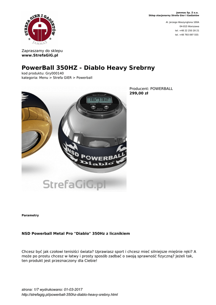 Jammas Sp. Z o.o. Sklep stacjonarny Strefa Gier i Gadżetów Al. Jerzego Waszyngtona 100A 04-015 Warszawa tel. +48 22 250 20 21 tel. +48 793 097 555 Zapraszamy do sklepu www.StrefaGiG.pl PowerBall 350HZ - Diablo Heavy Srebrny kod produktu: Gry000140 kategoria: Menu > Strefa GIER > Powerball Producent: POWERBALL 299,00 zł Parametry NSD Powerball Metal Pro "Diablo" 350Hz z licznikiem Chcesz być jak czołowi tenisiści świata? Uprawiasz sport i chcesz mieć silniejsze mięśnie ręki? A może po prostu chcesz w łatwy i prosty sposób zadbać o swoją sprawność fizyczną? Jeżeli tak, ten produkt jest przeznaczony dla Ciebie! strona: 1/7 wydrukowano: 01-03-2017 http://strefagig.pl/powerball-350hz-diablo-heavy-srebny.html Powerball Metal Pro Diablo S pochodzi z nowej, prestiżowej serii Premium. Model ten jest prawie dwukrotnie cięższy niż inne modele oferowane w serii Powerball NSD. Ten Powerball należy do serii Pro, co oznacza, że ma wbudowany licznik. Ten model to pozycja obowiązkowa dla wszystkich wielbicieli serii Powerball i wisienka na torcie w Twojej kolekcji! Powerball udowodnił swoją użyteczność jako dodatek treningowy w wielu sportach. W Stanach Zjednoczonych Powerball jest używany przez profesjonalistów w wielu branżach sportowych. JEŚLI ZASTANAWIASZ SIĘ NAD WYBOREM ODPOWIEDNIEGO MODELU POWERBALLA PRZECZYTAJ ARTYKUŁ HISTORIA, ZASADA DZIAŁANIA, OPIS I CHARAKTERYSTYKA KAŻDEJ KATEGORII strona: 2/7 wydrukowano: 01-03-2017 http://strefagig.pl/powerball-350hz-diablo-heavy-srebny.html Gadżet w pigułce: Oddziałuje siłą do 47kg Maksymalna moc już od 10 000 obrotów/min Wymiary: 7,5cm x 6,5cm Kolor: srebrno-czarny Zestaw zawiera: Powerball NSD 350 Hz Metal Pro "Diablo" z licznikiem 2 sznurki startow Instrukcja w j. polskim W zestawie znajdziesz także elegancką, przezroczystą kulę do przechowywania Powerballa! strona: 3/7 wydrukowano: 01-03-2017 http://strefagig.pl/powerball-350hz-diablo-heavy-srebny.html Funkcje Powerball jest nadzwyczajnie efektywnym dodatkiem treningowym do zwiększania siły mięśni w swoich palcach, dłoniach, nadgarstkach oraz ramionach. Powerball także wzmaga cyrkulację krwi, wzmacnia więzadła oraz redukuje kontuzje wywołane sportem. Efekty Regularny trening z Powerballem przyniesie korzyści w wielu sportach. To bezcenny dodatek treningowy w sportach wymagających mocnego uścisku i/lub dobrej koordynacji. Zalety Powerball jest wielkości piłki do tenisa i dzięki temu łatwo go transportować. Zmieści się w kieszeni Twojej kurtki lub w schowku w Twoim samochodzie. Oczywiście używanie Powerballa w strona: 4/7 wydrukowano: 01-03-2017 http://strefagig.pl/powerball-350hz-diablo-heavy-srebny.html czasie jazdy nie jest dobrym pomysłem, ale w korku Powerball może być ciekawym urozmaiceniem. Może być także użyty w trakcie spaceru, oglądania telewizji lub podczas jazdy komunikacją miejska. Ponieważ może być używany prawie wszędzie i o każdej porze, szybko rozwiniesz swoje umiejętności. Prawie każdy może trenować z Powerballem niezależnie od wieku czy kondycji fizycznej. Powerball Metal opakowany jest w eleganckie etui , w której trzymany jest w miejscu za pomocą magnesów. Do zestawu dołączone zostały także części zamienne tak, by Twój Powerball mógł jak najdłużej służyć Ci bez zarzutu. Specyfikacja produktu Cały metalowy pokryty nieskazitelnym lustrzanym chromem Oddziaływuje siłą do 47 kg strona: 5/7 wydrukowano: 01-03-2017 http://strefagig.pl/powerball-350hz-diablo-heavy-srebny.html Dwa razy cięższy od innych Powerballi, stanowi wyzwanie nawet dla najbardziej doświadczonych użytkowników Możliwość osiągnięcia 20 000 obrotów Waga: około 0,5 kg Wbudowany licznik Ekran LCD wyświetlający aktualną ilość obrotów oraz rekord osiągniętych obrotów Gumowy pasek ułatwiający uchwyt Powerball działa bezszelestnie dzięki wbudowanemu metalowemu obrotnikowi wysokiej klasy Powerball daje Ci mocny chwyt dłoni nieodzowny w wielu dyscyplinach sportu np. tenis, (kite-)surfing, koszykówka czy wspinaczka. Powerball wzmacnia także koordynację dłoni z ręką, co jest przydatne w niektórych sportach jak np. rzutki czy bilard. Pierwsza pomoc w schorzeniach nadgarstka – RSI. Mrowienie w palcach, bolesne ramiona, dokuczliwe uczucie w ręku? Prawie wszyscy, którzy okazjonalnie pracują z komputerem, mają te problemy. RSI (ang. Repetitive Strain Injury) jest coraz częściej spotykanym schorzeniem, ale nadal trudnym do wyleczenia. Znacznie łatwiej jest zapobiegać RSI niż leczyć, prewencja zasługuje na dodatkową uwagę. Amerykańscy fizjoterapeuci często stosują Powerballa w terapii rekonwalescencyjnej pourazowej i są bardzo zadowoleni z wyników. Powerball zwiększa krążenie krwi i dlatego jest bardzo skuteczny jako prewencja przy RSI (ang. Repetetive Strain Injury), CTS (zespół urazowy nadgarstka) oraz Rotator Cuff Syndrome (syndrom pierścienia rotatora). Powerball jest nadzwyczajnie efektywnym dodatkiem treningowym do zwiększania siły mięśni palców, dłoni, nadgarstków oraz ramion. Powerball wzmaga także cyrkulację krwi, wzmacnia więzadła oraz pomaga w redukcji kontuzji sportowych. Zapewnia Ci mocny chwyt dłoni, nieodzowny w wielu dyscyplinach sportu np. tenis, (kite-)surfing, koszykówka czy wspinaczka. Wzmacnia także koordynację kończyny górnej w sportach wymagających precyzji jak np. rzutki czy bilard. strona: 6/7 wydrukowano: 01-03-2017 http://strefagig.pl/powerball-350hz-diablo-heavy-srebny.html strona: 7/7 wydrukowano: 01-03-2017 http://strefagig.pl/powerball-350hz-diablo-heavy-srebny.html