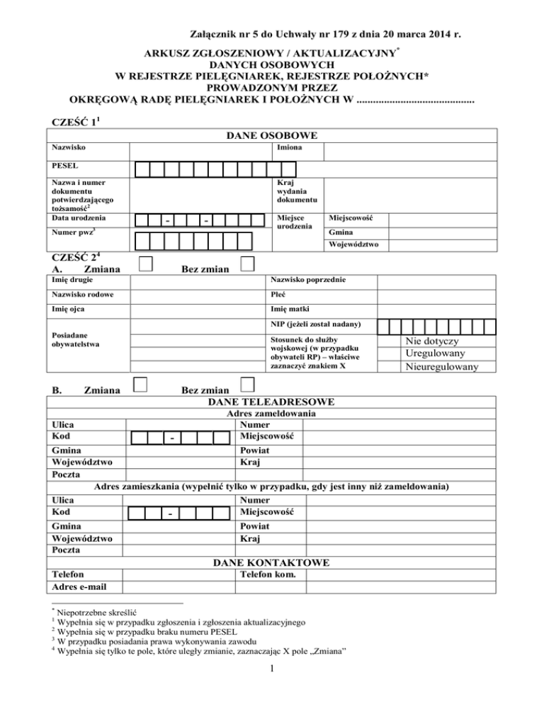 Załącznik nr 5 do Uchwały nr 179 z dnia 20 marca 2014 r. ARKUSZ ZGŁOSZENIOWY / AKTUALIZACYJNY* DANYCH OSOBOWYCH W REJESTRZE PIELĘGNIAREK, REJESTRZE POŁOŻNYCH* PROWADZONYM PRZEZ OKRĘGOWĄ RADĘ PIELĘGNIAREK I POŁOŻNYCH W ........................................... CZEŚĆ 11 DANE OSOBOWE Nazwisko Imiona PESEL Nazwa i numer dokumentu potwierdzającego tożsamość2 Data urodzenia Kraj wydania dokumentu - Miejsce urodzenia - Numer pwz3 Miejscowość Gmina Województwo 4 CZEŚĆ 2 A. Zmiana Bez zmian Imię drugie Nazwisko poprzednie Nazwisko rodowe Płeć Imię ojca Imię matki NIP (jeżeli został nadany) Posiadane obywatelstwa B. Stosunek do służby wojskowej (w przypadku obywateli RP) – właściwe zaznaczyć znakiem X Zmiana Ulica Kod Nie dotyczy Uregulowany Nieuregulowany Bez zmian DANE TELEADRESOWE - Adres zameldowania Numer Miejscowość Gmina Powiat Województwo Kraj Poczta Adres zamieszkania (wypełnić tylko w przypadku, gdy jest inny niż zameldowania) Ulica Numer Kod Miejscowość Gmina Województwo Poczta Powiat Kraj DANE KONTAKTOWE Telefon Adres e-mail Telefon kom. * Niepotrzebne skreślić Wypełnia się w przypadku zgłoszenia i zgłoszenia aktualizacyjnego 2 Wypełnia się w przypadku braku numeru PESEL 3 W przypadku posiadania prawa wykonywania zawodu 4 Wypełnia się tylko te pole, które uległy zmianie, zaznaczając X pole „Zmiana” 1 1 C. Zmiana Bez zmian DANE ZAWODOWE Numery poprzednich zaświadczeń o prawie wykonywania zawodu z określeniem organu wydającego zaświadczenie i daty wydania Zagraniczne prawo wykonywania zawodu Kraj zagranicznego prawa: Symbol zagranicznego dokumentu: Data rozpoczęcia wykonywania zawodu D. Zmiana Bez zmian DANE O STAŻU PODYPLOMOWYM Nazwa firmy/podmiotu pełna NIP ul. / nr Miejscowość kod pocztowy - Data rozpoczęcia E. Regon lokal Województwo Poczta - Zmiana Data zakończenia - Bez zmian DANE O ZATRUDNIENIU Stanowisko Data zatrudnienia, od: Nazwa firmy pełna: do: Typ zakładu Publiczny Numer telefonu NIP Podtyp firmy (szpital, dps, itp.) ul. / nr / nr lokalu Miejscowość kod pocztowy - Niepubliczny Inny Fax Regon Województwo Poczta - DANE O ZATRUDNIENIU Stanowisko Data zatrudnienia, od: Nazwa firmy pełna: do: Typ zakładu Publiczny Numer telefonu NIP Podtyp firmy (szpital, dps, itp.) ul. / nr / nr lokalu Miejscowość kod pocztowy - Niepubliczny Fax Regon Województwo Poczta 2 Inny - F. Zmiana Bez zmian DANE O UKOŃCZENIU SZKOŁY PIELĘGNIARSKIEJ, POŁOŻNICZEJ Uzyskany tytuł zawodowy pielęgniarka / położna pielęgniarka / położna dyplomowana licencjat magister Nazwa szkoły Ulica, nr domu, nr lokalu Miejscowość kod pocztowy Województwo Poczta - Kraj Rok ukończenia szkoły Numer dyplomu Data wydania dyplomu Miejsce ukończenia szkoły Inne tytuły zawodowe (np. mgr prawa) G. Zmiana - - - - - - Bez zmian DANE O SPECJALIZACJI Dziedzina specjalizacji Nazwa organizatora Data ukończenia - - Numer dyplomu Dziedzina specjalizacji Nazwa organizatora Data ukończenia Data wystawienia - - Numer dyplomu H. Data wystawienia Zmiana Bez zmian DANE O KURSACH Kwalifikacyjny Specjalistyczny Data rozpoczęcia i ukończenia: Organizator: Zakres / uwagi: Kwalifikacyjny Data rozpoczęcia i ukończenia: - - Specjalistyczny - - - - - - Organizator: Zakres / uwagi: Kwalifikacyjny Data rozpoczęcia i ukończenia: Specjalistyczny - - Organizator: Zakres / uwagi: 3 I. Zmiana Bez zmian Uzyskany stopień naukowy (np. doktor, doktor habilitowany): Dziedzina stopnia naukowego: Data uzyskania: Nazwa organu nadającego stopień: J. Zmiana Bez zmian Uzyskany tytuł naukowy (np. profesor): Dziedzina stopnia naukowego: Data uzyskania: Nazwa organu nadającego tytuł: K. Zmiana Bez zmian DANE O ZAPRZESTANIU WYKONYWANIA ZAWODU Data rozpoczęcia: Data zakończenia: L. Zmiana Bez zmian DANE ZAWIESZENIU PRAWA WYKONYWANIA ZAWODU Data zakończenia: - Data rozpoczęcia: M. Zmiana - - Bez zmian INFORMACJA O UZYSKANYM WPISIE DO REJESTRU PODMIOTÓW PROWADZĄCYCH DZIAŁALNOŚĆ LECZNICZĄ Data uzyskania Numer księgi wpisu Informacja o administratorze danych 1. 2. 3. Podstawa prawna przetwarzania danych osobowych – Ustawa z dnia 15 lipca 2011 r. o zawodach pielęgniarki i położnej (Dz. U. z 2011 r. Nr 174, poz. 1039, ze zm.) Administratorem danych osobowych jest Przewodnicząca Okręgowej Rady Pielęgniarek i Położnych w …………………… Adres siedziby administratora danych ................................................................................................................................. Jednocześnie oświadczam, że zgodnie z art. 11 ust. 2 pkt 1 - 5 ustawy o samorządzie pielęgniarek i położnych z dnia 1 lipca 2011 roku (Dz. U. Nr 178 poz. 1038, ze zm.), zobowiązuję się do: postępowania zgodnie z zasadami etyki zawodowej oraz zasadami wykonywania zawodu, sumiennie wykonywać obowiązki zawodowe i przestrzegać uchwał organów izby, regularnie opłacać składkę członkowską (nie dotyczy osób: zarejestrowanych jako bezrobotne, przebywających na urlopach wychowawczych, pobierających zasiłek rehabilitacyjny, niewykonujących zawodu od daty złożenia wniosku o zaprzestanie wykonywania zawodu lub wniosku o zrzeczenie się prawa wykonywania zawodu). z chwilą wpisania do rejestru zobowiązuje się do zawiadomienia właściwej okręgowej rady pielęgniarek i położnych o wszelkich zmianach danych zawartych w rejestrze, nie później niż w terminie 14 dni od dnia ich powstania. Data ........................................... ......................................................... Podpis wnioskodawcy Pouczenie: Nieopłacone w terminie składki członkowskie podlegają ściągnięciu w trybie przepisów o postępowaniu egzekucyjnym w administracji art. 92 Ustawy z dnia 1 lipca 2011 roku o samorządzie pielęgniarek i położnych (Dz. U. Nr 174 poz. 1038 ze zm.). Załączniki: 1. 2. 3. 4. Ksero dowodu osobistego - oryginał do wglądu. Ksero zaświadczenia o odbytym stażu podyplomowym - oryginał do wglądu.