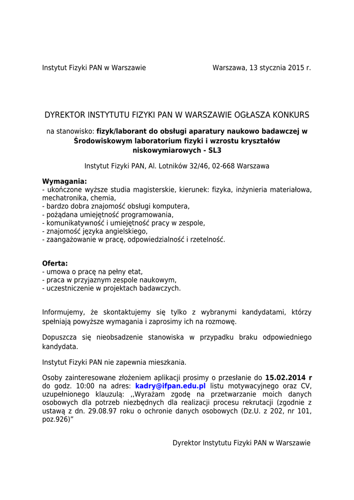 Instytut Fizyki PAN w Warszawie Warszawa, 13 stycznia 2015 r. DYREKTOR INSTYTUTU FIZYKI PAN W WARSZAWIE OGŁASZA KONKURS na stanowisko: fizyk/laborant do obsługi aparatury naukowo badawczej w Środowiskowym laboratorium fizyki i wzrostu kryształów niskowymiarowych - SL3 Instytut Fizyki PAN, Al. Lotników 32/46, 02-668 Warszawa Wymagania: - ukończone wyższe studia magisterskie, kierunek: fizyka, inżynieria materiałowa, mechatronika, chemia, - bardzo dobra znajomość obsługi komputera, - pożądana umiejętność programowania, - komunikatywność i umiejętność pracy w zespole, - znajomość języka angielskiego, - zaangażowanie w pracę, odpowiedzialność i rzetelność. Oferta: - umowa o pracę na pełny etat, - praca w przyjaznym zespole naukowym, - uczestniczenie w projektach badawczych. Informujemy, że skontaktujemy się tylko z wybranymi kandydatami, którzy spełniają powyższe wymagania i zaprosimy ich na rozmowę. Dopuszcza się nieobsadzenie stanowiska w przypadku braku odpowiedniego kandydata. Instytut Fizyki PAN nie zapewnia mieszkania. Osoby zainteresowane złożeniem aplikacji prosimy o przesłanie do 15.02.2014 r do godz. 10:00 na adres: [email protected] listu motywacyjnego oraz CV, uzupełnionego klauzulą: ,,Wyrażam zgodę na przetwarzanie moich danych osobowych dla potrzeb niezbędnych dla realizacji procesu rekrutacji (zgodnie z ustawą z dn. 29.08.97 roku o ochronie danych osobowych (Dz.U. z 202, nr 101, poz.926)” Dyrektor Instytutu Fizyki PAN w Warszawie