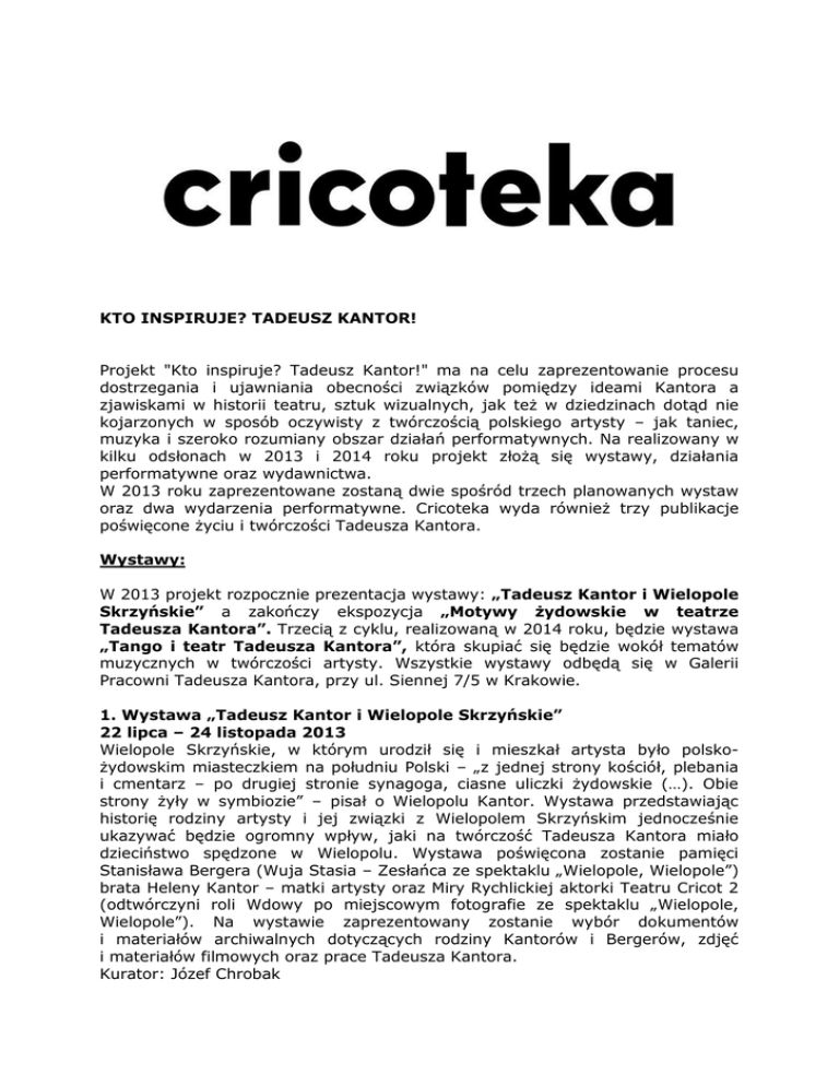 KTO INSPIRUJE? TADEUSZ KANTOR! Projekt "Kto inspiruje? Tadeusz Kantor!" ma na celu zaprezentowanie procesu dostrzegania i ujawniania obecności związków pomiędzy ideami Kantora a zjawiskami w historii teatru, sztuk wizualnych, jak też w dziedzinach dotąd nie kojarzonych w sposób oczywisty z twórczością polskiego artysty – jak taniec, muzyka i szeroko rozumiany obszar działań performatywnych. Na realizowany w kilku odsłonach w 2013 i 2014 roku projekt złożą się wystawy, działania performatywne oraz wydawnictwa. W 2013 roku zaprezentowane zostaną dwie spośród trzech planowanych wystaw oraz dwa wydarzenia performatywne. Cricoteka wyda również trzy publikacje poświęcone życiu i twórczości Tadeusza Kantora. Wystawy: W 2013 projekt rozpocznie prezentacja wystawy: „Tadeusz Kantor i Wielopole Skrzyńskie” a zakończy ekspozycja „Motywy żydowskie w teatrze Tadeusza Kantora”. Trzecią z cyklu, realizowaną w 2014 roku, będzie wystawa „Tango i teatr Tadeusza Kantora”, która skupiać się będzie wokół tematów muzycznych w twórczości artysty. Wszystkie wystawy odbędą się w Galerii Pracowni Tadeusza Kantora, przy ul. Siennej 7/5 w Krakowie. 1. Wystawa „Tadeusz Kantor i Wielopole Skrzyńskie” 22 lipca – 24 listopada 2013 Wielopole Skrzyńskie, w którym urodził się i mieszkał artysta było polskożydowskim miasteczkiem na południu Polski – „z jednej strony kościół, plebania i cmentarz – po drugiej stronie synagoga, ciasne uliczki żydowskie (…). Obie strony żyły w symbiozie” – pisał o Wielopolu Kantor. Wystawa przedstawiając historię rodziny artysty i jej związki z Wielopolem Skrzyńskim jednocześnie ukazywać będzie ogromny wpływ, jaki na twórczość Tadeusza Kantora miało dzieciństwo spędzone w Wielopolu. Wystawa poświęcona zostanie pamięci Stanisława Bergera (Wuja Stasia – Zesłańca ze spektaklu „Wielopole, Wielopole”) brata Heleny Kantor – matki artysty oraz Miry Rychlickiej aktorki Teatru Cricot 2 (odtwórczyni roli Wdowy po miejscowym fotografie ze spektaklu „Wielopole, Wielopole”). Na wystawie zaprezentowany zostanie wybór dokumentów i materiałów archiwalnych dotyczących rodziny Kantorów i Bergerów, zdjęć i materiałów filmowych oraz prace Tadeusza Kantora. Kurator: Józef Chrobak 2. Wystawa „Motywy żydowskie w twórczości Tadeusza Kantora” (grudzień 2013) Pierwsza tego typu wystawa, która skupiać się będzie na niezwykle istotnych motywach i wątkach pojawiających się w twórczości teatralnej Tadeusza Kantora, m.in. w spektaklu „Umarła klasa”, „Wielopole, Wielopole” i cricotage’u „Gdzie są niegdysiejsze śniegi”. Na wystawie zaprezentowane zostaną obiekty teatralne z wybranych spektakli ze zbiorów Cricoteki, rysunki Tadeusza Kantora, wybrane fotografie i najczęściej niepokazywane dotychczas materiały filmowe. Kurator: Józef Chrobak 3. Wystawa „Tango i teatr Tadeusza Kantora” (2014) Będzie to pierwsza wystawa z przygotowywanego cyklu „Muzyka w teatrze Tadeusza Kantora”. Muzyka w spektaklach artysty odgrywała zawsze niezwykle istotną rolę. Była jednym z ważnych elementów składowych tych przedstawień, a motyw tanga należał do najczęściej wykorzystywanych i eksploatowanych motywów muzycznych. Pojawia się on m. in. w spektaklach „Kurka Wodna”, „Niech sczezną artyści” oraz w cricotage’u „Gdzie są niegdysiejsze śniegi”. Na wystawie zaprezentowane zostaną pierwowzory nagrań wykorzystywanych przez Tadeusza Kantora i sposób ich funkcjonowania w kontekście poszczególnych spektakli. W części wystawy przedstawione zostaną nieznane materiały związane z pobytem Tadeusza Kantora w Argentynie, w latach 80-tych. Kurator: Józef Chrobak Wydarzenia performatywne: 1. „Polifonie” (2013) Niezwykłe brzmienia i performans muzyczny ujawnią się w nurcie koncertów „Polifonie". Do współpracy zaproszono artystów silnie związanych z Krakowem i nawiązujących do awangardowego dziedzictwa miasta. Eksperyment, improwizacja, nowe technologie, ale też zakomponowana brzmieniowość sceny i akustyczny potencjał otoczenia wypełnią cykl sześciu zdarzeń. Wystąpią performerzy, muzycy i tancerze, m.in.: Keir Neuringer i Rafał Mazur, Denis Kolokol i Tomasz Chołoniewski, Sergej Maingardt i Magdalena Przybysz, Reid Dudley Peirson i Ben Horner. Realizacja tej części projektu planowana jest na 21-24 listopada 2013 w Muzeum Inżynierii Miejskiej w Krakowie. Kurator projektu: Anna Szwajgier 2. „Maszyna choreograficzna” (2013) Projekt będzie nowatorskim odniesieniem do twórczości Tadeusza Kantora poprzez choreografię i taniec współczesny. Takie spojrzenie otworzy nieznane dotąd konteksty i umożliwi nowe interpretacje. Sztuka choreograficzna w Polsce ulega wielu redefinicjom i staje się coraz bardziej popularna. Jeżeli zgodzimy się, że tym co łączy Teatr Śmierci ze współczesną choreografią jest zainteresowanie ciałem w jego różnych aspektach, analogie między tymi obszarami sztuki są łatwiej zauważalne. Najbardziej naturalne w kontekście prac Kantora staje się rozumienie ciała jako tworzywa, formy, którą może kształtować malarz, ale także tancerz i choreograf, nie można zapomnieć również o cielesności w kontekście podmiotowego istnienia, mocno powiązanego z egzystencjalnym odczuwaniem śmierci i przeżywaniem świata. Idąc tym tropem w pierwszej odsłonie programu tanecznego „Maszyna choreograficzna” prezentujemy twórców, którzy w swojej praktyce scenicznej przedstawiają studium cielesności. Raz obserwują swoje emocje, które niczym lustro zdradza ciało poprzez kody zachowania, kiedy indziej podejmują tematykę powiązaną z rozpadem ciała. W pierwszej tegorocznej odsłonie programu zobaczymy młodych polskich choreografów i tancerzy, w tym m.in.: Tomasza Bazana, Joannę Leśnierowską i Janusza Orlika, Karola Tymińskiego. Podczas drugiej odsłony, przypadaj