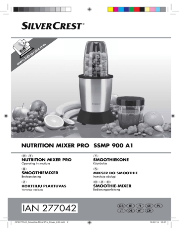 NUTRITION MIXER PRO SSMP 900 A1 NUTRITION MIXER PRO SMOOTHIEKONE SMOOTHIEMIXER MIKSER DO SMOOTHIE KOKTEILIŲ PLAKTUVAS SMOOTHIE-MIXER Operating instructions Bruksanvisning Vartotojo vadovas Käyttöohje Instrukcja obsługi Bedienungsanleitung IAN 277042 CPE277042_Smoothie Mixer Pro_Cover_LB3.indd 2 19.02.16 15:47 &3(B$XVNODSSIP6HLWH)UHLWDJ0lU] English..................................................................................... 2 Suomi .................................................................................... 14 Svenska ................................................................................ 26 Polski .................................................................................... 38 Lietuviškai ............................................................................. 52 ID: SSMP 900 A1_16_V1.1 Deutsch ................................................................................. 64 BB&3(B%ERRN6HLWH)UHLWDJ0lU] Overview / Yleiskatsaus / Översikt / Przegld / Apžvalga / Übersicht 1 2 34 7 5 8 6 9 A 10 B 11 7/8 7/8 11 5/6 1 C D 10 9 5/6 5/6 E 3 4 BB&3(B%ERRN6HLWH)UHLWDJ0lU] Contents 1. 2. 3. 4. 5. 6. Overview ........................................................................................ 2 Intended purpose ............................................................................ 3 Safety instructions ........................................................................... 3 Items supplied ................................................................................. 6 How to use ...................................................................................... 6 Operation ........................................................................................ 6 6.1 Uses .................................................................................................... 6 6.2 Preparing food ..................................................................................... 7 6.3 Mixing/Chopping................................................................................. 7 6.4 Drink immediately ................................................................................. 7 6.5 Storage ............................................................................................... 8 6.6 Overheating protection .......................................................................... 8 7. Cleaning .......................................................................................... 8 8. Storage ........................................................................................... 9 9. Disposal .......................................................................................... 9 10. Troubleshooting ............................................................................... 9 11. Recipes .......................................................................................... 10 12. Technical specifications .................................................................. 11 13. Warranty of the HOYER Handel GmbH ........................................... 11 1. Overview 1 2 3 4 5 6 7 8 9 10 11 2 Base unit Suction feet Cable spool Power cable with mains plug Blender jug (large, max. 700 ml) Blender jug (2x small, max. 350 ml) Blade assembly with a cross blade Blade assembly with a flat blade Lid (2x) Ring (2x) Nose (3x at each blender jug) GB BB&3(B%ERRN6HLWH)UHLWDJ0lU] Thank you for your trust! 2. Intended purpose Congratulations on your new Smoothie-Mixer Pro. For a safe handling of the device and in order to get to know the entire scope of features: • Thoroughly read these operating instructions prior to initial use. • Above all, observe the safety instructions! • The device should only be used as described in these operating instructions. • Keep these operating instructions for reference. • If you pass the device on to someone else, please include these operating instructions. The operating instructions are a part of the product. We hope you enjoy your new Smoothie-Mixer Pro! The Smoothie-Mixer Pro is intended ... … for mixing whole-fruit beverages (smoothies) and chopping ice cubes. For this purpose, use the blade assembly with the cross blade7. … for chopping solid foods (e.g. nuts). For this purpose, use the blade assembly with the flat blade8. The device is designed for private, domestic use. The device must only be used indoors. This device must not be used for commercial purposes. Foreseeable misuse WARNING! Risk of material damage! ~ Thick or firm peels, (e.g. of citrus fruits, pineapple), stems and pips of stone fruits (e.g. cherries, peaches, apricots) must be removed before blending. ~ The device must not be used to chop especially hard food such as e.g. bones or nutmegs. 3. Safety instructions Warnings Symbol on your device The food-safe material of devices with this symbol will not change the taste or smell of food. If necessary, the following warnings will be used in these operating instructions: DANGER! High risk: failure to observe this warning may result in injury to life and limb. WARNING! Moderate risk: failure to observe this warning may result in injury or serious material damage. CAUTION: low risk: failure to observe this warning may result in minor injury or material damage. NOTE: circumstances and specifics that must be observed when handling the device. GB 3 BB&3(B%ERRN6HLWH)UHLWDJ0lU] Instructions for safe operation ~ This device must not be used by children. ~ Children must not play with the device. ~ The device and the power cable must be kept away from children. ~ This device can be used by people with restricted physical, sensory or intellectual abilities or people without adequate experience and/or understanding if they are supervised or instructed on how to use this device safely and if they are aware of the resulting risks. ~ If the mains power cable of this device should become damaged, it must be replaced by the manufacturer, the manufacturer's customer s
