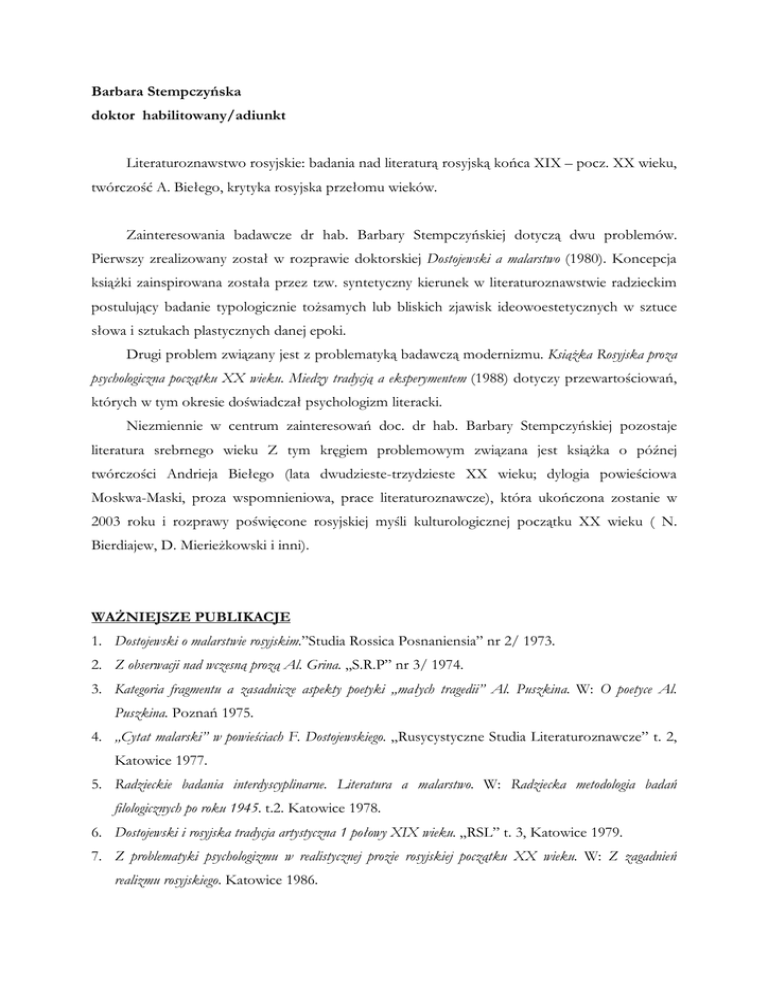 Barbara Stempczyńska doktor habilitowany/adiunkt Literaturoznawstwo rosyjskie: badania nad literaturą rosyjską końca XIX – pocz. XX wieku, twórczość A. Biełego, krytyka rosyjska przełomu wieków. Zainteresowania badawcze dr hab. Barbary Stempczyńskiej dotyczą dwu problemów. Pierwszy zrealizowany został w rozprawie doktorskiej Dostojewski a malarstwo (1980). Koncepcja książki zainspirowana została przez tzw. syntetyczny kierunek w literaturoznawstwie radzieckim postulujący badanie typologicznie tożsamych lub bliskich zjawisk ideowoestetycznych w sztuce słowa i sztukach plastycznych danej epoki. Drugi problem związany jest z problematyką badawczą modernizmu. Książka Rosyjska proza psychologiczna początku XX wieku. Miedzy tradycją a eksperymentem (1988) dotyczy przewartościowań, których w tym okresie doświadczał psychologizm literacki. Niezmiennie w centrum zainteresowań doc. dr hab. Barbary Stempczyńskiej pozostaje literatura srebrnego wieku Z tym kręgiem problemowym związana jest książka o późnej twórczości Andrieja Biełego (lata dwudzieste-trzydzieste XX wieku; dylogia powieściowa Moskwa-Maski, proza wspomnieniowa, prace literaturoznawcze), która ukończona zostanie w 2003 roku i rozprawy poświęcone rosyjskiej myśli kulturologicznej początku XX wieku ( N. Bierdiajew, D. Mierieżkowski i inni). WAŻNIEJSZE PUBLIKACJE 1. Dostojewski o malarstwie rosyjskim.”Studia Rossica Posnaniensia” nr 2/ 1973. 2. Z obserwacji nad wczesną prozą Al. Grina. „S.R.P” nr 3/ 1974. 3. Kategoria fragmentu a zasadnicze aspekty poetyki „małych tragedii” Al. Puszkina. W: O poetyce Al. Puszkina. Poznań 1975. 4. „Cytat malarski” w powieściach F. Dostojewskiego. „Rusycystyczne Studia Literaturoznawcze” t. 2, Katowice 1977. 5. Radzieckie badania interdyscyplinarne. Literatura a malarstwo. W: Radziecka metodologia badań filologicznych po roku 1945. t.2. Katowice 1978. 6. Dostojewski i rosyjska tradycja artystyczna 1 połowy XIX wieku. „RSL” t. 3, Katowice 1979. 7. Z problematyki psychologizmu w realistycznej prozie rosyjskiej początku XX wieku. W: Z zagadnień realizmu rosyjskiego. Katowice 1986. 8. Idee epoki w powieści Iwana Rukawisznikowa „Ród przeklęty”. W: Literatura rosyjska i radziecka a historia. Motywy, poetyka. Opole 1987. 9. Kategoria „epickości” w nowelistyce rosyjskiej początku XX wieku. „RSL”. T.10/ 1987. 10. „Nadbrzeżne’ i „Smutek pól” S.Siergiejewa-Censkiego.W poszukiwaniu hipotezy godziwego istnienia. „RSL”. T.13 / 1989. 11. Między modernizmem a ekspresjonizmem (O powieści L.Andrejewa „Saszka Żegulow”). „RSL” T.14 / 1990. 12. Stylizacja w prozie M.Kuzmina. W: Dziesięć wieków związków Wschodniej Słowiańszczyzny z kulturą Zachodu. Lublin 1990. 13. „Siostry krzyżowe” A. Riemizowa. Próba interpretacji. „Studia Rossica Posnaniensia” T.22 / 1991. 14. O prozie Michaiła Kuzmina. „RSL” T.16 / 1992. 15. [ Noty o autorach] Aleksander Puszkin, Mikołaj Gogol, Wissarion Bieliński, Aleksander Ostrowski, Antoni Czechow, Walery Briusow,, Lew Tołstoj, Wiaczesław Iwanow, Andriej Bieły, Aleksander Błok, Mikołaj Jewreinow, Leonid Andrejew, Włodzimierz Majakowski i in. W: O dramacie. Źródła do dziejów europejskich teorii dramatycznych. T.2, Warszawa 1993. 16. Wiktor Astafiew. W: Sylwetki współczesnych pisarzy rosyjskich. Katowice 1994. 17. „Moskwa” A.Biełego (o niejasności). W: Literatura rosyjska w nowych interpretacjach. Katowice 1995. 18. O prozie Sigizmunda Krżyżanowskiego. W: Pisarze nowi, zapomniani i odkrywani na nowo. Katowice 1996. 19. [ Noty o autorach] Mikołaj Erdman, Wsiewołod Wiszniewski, Leonid Leonow, Aleksy Arbuzow, Aleksander Wołodin, Ludmiła Pietruszewska, Aleksy Szipienko. W: O dramacie. Źródła do dziejów europejskich teorii dramatycznych. T.3. Warszawa 1997. 20. Rosja. W: ibidem, s. 305-330. 21. Русский символизм в исследованиях польских литературоведов. В: Литературоведение на пороге ХХ1века. Москва 1998. 22. „Wróciłem...” Ostatnie dziesięciolecie Andrieja Biełego. W: Od symbolizmu do postmodernizmu. Katowice 1999. 23. «Забытый роман» Андрея Белого. W: Książki nieznane, książki zapomniane. Katowice 1999. 24. Polskie «czytanie Biełego». W: 50 lat polskiej rusycystyki literaturoznawczej. Katowice 2000. 25. «Шумы времени ожидают меня». Концепция истории в дилогии «Москва-Маски» А.Белого. «Przegląd Rusycystyczny» nr 2/2000. 26. Zur Frage des Historismus bei Andrej Bely.W: Ich und der/die Andere in der russischen Literatur. Frankfurt am Main-Berlin-Bern 2002. 27. Badania nad literaturą rosyjską od XVIII do początku XX wieku. W: Idee i poetyki. Ze studiów nad literaturą rosyjską. Katowice 2002. 28. «Barbarzyństwo w kulturze”. W kręgu rosyjskiej myśli kulturologicznej początku XX wieku. W: ibidem. 29. Uwagi o dyskursie krytycznoliterackim rosyjskiego „srebrnego wieku” .W: Formacje dyskursywne w kulturze, językach i literaturze europejskiej XX wieku. Częstochowa 2005 30. Жанр авторского предисловия в позднем творчестве Андрея Белого. W: Poetyki Biełego. Katowice 2005 31. Uwagi o dyskursie rzeczy w prozie Andrieja Biełego. W: Tekst – Rzecz – Egzystencja w literaturach słowiańskich. Katowice 2009. 32. O badaniu krytyki. W: Szkice o krytyce rosyjskiej (w druku) 33. Wartościowanie w „Wykładach o literaturze rosyjskiej”V. Nabokova. W: tamże (w druku) Ponadto: recenzje, przeglądy, tłumaczenia itp. Prace redakcyjne: 34. Literatura rosyjska wobec modernizmu i awangardyzmu. Katowice 1992. 35. Rosyjska literatura popularna. „Rusycystyczne Studia Literaturoznawcze” t.18, Katowice 1994. 36. Literatura rosyjska. Nowe zjawiska, reinterpretacje. Katowice 1995. 3