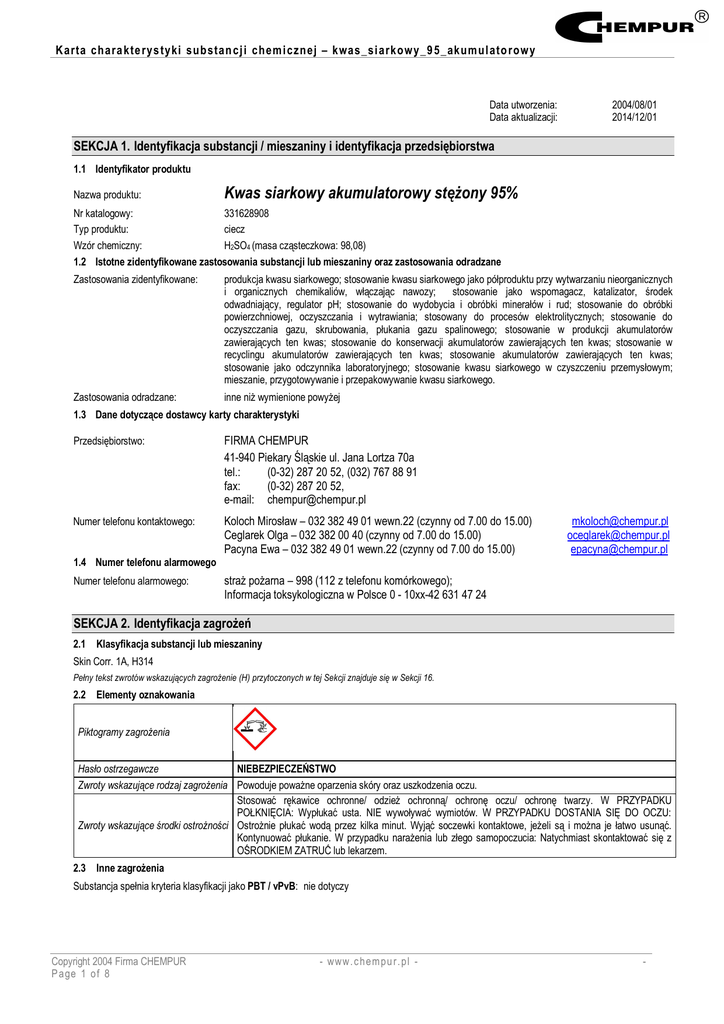 Karta chara kte rys tyki substan cj i chem i cznej – kwas_si arkowy_9 5_akum ul ato rowy Data utworzenia: Data aktualizacji: 2004/08/01 2014/12/01 SEKCJA 1. Identyfikacja substancji / mieszaniny i identyfikacja przedsiębiorstwa 1.1 Identyfikator produktu Nazwa produktu: Kwas siarkowy akumulatorowy stężony 95% Nr katalogowy: 331628908 Typ produktu: ciecz Wzór chemiczny: H2SO4 (masa cząsteczkowa: 98,08) 1.2 Istotne zidentyfikowane zastosowania substancji lub mieszaniny oraz zastosowania odradzane Zastosowania zidentyfikowane: produkcja kwasu siarkowego; stosowanie kwasu siarkowego jako półproduktu przy wytwarzaniu nieorganicznych i organicznych chemikaliów, włączając nawozy; stosowanie jako wspomagacz, katalizator, środek odwadniający, regulator pH; stosowanie do wydobycia i obróbki minerałów i rud; stosowanie do obróbki powierzchniowej, oczyszczania i wytrawiania; stosowany do procesów elektrolitycznych; stosowanie do oczyszczania gazu, skrubowania, płukania gazu spalinowego; stosowanie w produkcji akumulatorów zawierających ten kwas; stosowanie do konserwacji akumulatorów zawierających ten kwas; stosowanie w recyclingu akumulatorów zawierających ten kwas; stosowanie akumulatorów zawierających ten kwas; stosowanie jako odczynnika laboratoryjnego; stosowanie kwasu siarkowego w czyszczeniu przemysłowym; mieszanie, przygotowywanie i przepakowywanie kwasu siarkowego. Zastosowania odradzane: inne niż wymienione powyżej 1.3 Dane dotyczące dostawcy karty charakterystyki Przedsiębiorstwo: FIRMA CHEMPUR 41-940 Piekary Śląskie ul. Jana Lortza 70a tel.: (0-32) 287 20 52, (032) 767 88 91 fax: (0-32) 287 20 52, e-mail: [email protected] Numer telefonu kontaktowego: Koloch Mirosław – 032 382 49 01 wewn.22 (czynny od 7.00 do 15.00) Ceglarek Olga – 032 382 00 40 (czynny od 7.00 do 15.00) Pacyna Ewa – 032 382 49 01 wewn.22 (czynny od 7.00 do 15.00) [email protected] [email protected] [email protected] 1.4 Numer telefonu alarmowego Numer telefonu alarmowego: straż pożarna – 998 (112 z telefonu komórkowego); Informacja toksykologiczna w Polsce 0 - 10xx-42 631 47 24 SEKCJA 2. Identyfikacja zagrożeń 2.1 Klasyfikacja substancji lub mieszaniny Skin Corr. 1A, H314 Pełny tekst zwrotów wskazujących zagrożenie (H) przytoczonych w tej Sekcji znajduje się w Sekcji 16. 2.2 Elementy oznakowania Piktogramy zagrożenia Hasło ostrzegawcze NIEBEZPIECZEŃSTWO Zwroty wskazujące rodzaj zagrożenia Powoduje poważne oparzenia skóry oraz uszkodzenia oczu. Stosować rękawice ochronne/ odzież ochronną/ ochronę oczu/ ochronę twarzy. W PRZYPADKU POŁKNIĘCIA: Wypłukać usta. NIE wywoływać wymiotów. W PRZYPADKU DOSTANIA SIĘ DO OCZU: Zwroty wskazujące środki ostrożności Ostrożnie płukać wodą przez kilka minut. Wyjąć soczewki kontaktowe, jeżeli są i można je łatwo usunąć. Kontynuować płukanie. W przypadku narażenia lub złego samopoczucia: Natychmiast skontaktować się z OŚRODKIEM ZATRUĆ lub lekarzem. 2.3 Inne zagrożenia Substancja spełnia kryteria klasyfikacji jako PBT / vPvB: nie dotyczy Copyright 2004 Firma CHEMPUR P age 1 of 8 - www. c hem pu r. pl - - Karta chara kte rys tyki substan cj i chem i cznej – kwas_si arkowy_9 5_akum ul ato rowy SEKCJA 3. Skład / informacje o składnikach 3.1 Substancje Nazwa produktu / składnika Identyfikatory Zaw. [%] Kwas siarkowy WE: 231-639-5 CAS: 7664-93-9 Index: 016-020-00-8 Nr rej. REACH: 01-2119458838-20-XXXX C ≥ 15 Klasyfikacja wg 1272/2008 Skin Corr. 1A, H314 Pełny tekst zwrotów wskazujących zagrożenie (H) przytoczonych w tej Sekcji znajduje się w Sekcji 16. SEKCJA 4. Środki pierwszej pomocy 4.1 Opis środków pierwszej pomocy Natychmiast przepłukać oczy dużą ilością wody przy szeroko odchylonej powiece przez 10 - 15 minut. Unikać silnego strumienia Kontakt z okiem wody ze względu na ryzyko mechanicznego uszkodzenia rogówki (chronić niepodrażnione oko). Założyć jałowy opatrunek. Bezzwłocznie skonsultować się z lekarzem okulistą. Wynieść narażoną osobę na świeże powietrze. Jeżeli podejrzewa się, że opary są wciąż są obecne ratownik powinien założyć Przez drogi właściwą maskę lub oddechowy aparat izolacyjny. Jeżeli osoba nie oddycha, oddycha nieregularnie lub gdy oddychanie ustało, oddechowe wykwalifikowany personel powinien wykonać sztuczne oddychanie lub podawać tlen. W przypadku utraty przytomności, należy ułożyć w pozycji bocznej ustalonej i zapewnić pomoc medyczną. Wynieść narażoną osobę na świeże powietrze. Zapewnić osobie ciepło i spokój. NIE wywoływać wymiotów. Jeżeli poszkodowany Przez przewód jest całkowicie przytomny powinien dokładnie wypłukać usta wodą. Nie podawać żadnych środków zobojętniających kwasy. pokarmowy Bezzwłocznie zasięgnąć porady medycznej. Kontakt ze Zdjąć zanieczyszczoną odzież, skórę zmyć dużą ilością bieżącej i chłodnej wody. Nie stosować mydeł ani zasadowych środków skórą zobojętniających. W przypadku utrzymywania się niepokojących objawów skonsultować się z lekarzem. Ochrona osób Nie należy podejmować żadnych działań, które stwarzałyby ryzyko dla kogokolwiek chyba, że jest się odpowiednio udzielających przeszkolonym. Jeżeli podejrzewa się, że opary są wciąż obecne ratownik powinien założyć właściwa maskę lub oddechowy pierwszej aparat izolacyjny. Może być niebezpiecznym dla osoby udzielającej sztucznego oddychania usta - usta. Należy dokładnie zmyć pomocy zanieczyszczone ubranie wodą przed jego zdjęciem lub założyć rękawice. 4.2 Najważniejsze ostre i opóźnione objawy oraz skutki narażenia Narażenie: Ostre działanie na zdrowie: Powoduje poważne oparzenia i uszkodzenia oczu. Kontakt z okiem Niedostępne. Przez drogi oddechowe Niedostępne. Przez przewód pokarmowy Powoduje poważne oparzenia skóry. Kontakt ze skórą Nadmierna ekspozycja powoduje: Może powodować utratę wzroku lub trwałe zmętnienie rogówki. P