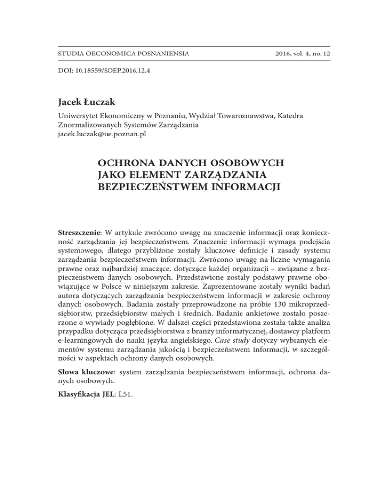 STUDIA OECONOMICA POSNANIENSIA 2016, vol. 4, no. 12 DOI: 10.18559/SOEP.2016.12.4 Jacek Łuczak Uniwersytet Ekonomiczny w Poznaniu, Wydział Towaroznawstwa, Katedra Znormalizowanych Systemów Zarządzania [email protected] OCHRONA DANYCH OSOBOWYCH JAKO ELEMENT ZARZĄDZANIA BEZPIECZEŃSTWEM INFORMACJI Streszczenie: W artykule zwrócono uwagę na znaczenie informacji oraz konieczność zarządzania jej bezpieczeństwem. Znaczenie informacji wymaga podejścia systemowego, dlatego przybliżone zostały kluczowe definicje i zasady systemu zarządzania bezpieczeństwem informacji. Zwrócono uwagę na liczne wymagania prawne oraz najbardziej znaczące, dotyczące każdej organizacji – związane z bezpieczeństwem danych osobowych. Przedstawione zostały podstawy prawne obowiązujące w Polsce w niniejszym zakresie. Zaprezentowane zostały wyniki badań autora dotyczących zarządzania bezpieczeństwem informacji w zakresie ochrony danych osobowych. Badania zostały przeprowadzone na próbie 130 mikroprzedsiębiorstw, przedsiębiorstw małych i średnich. Badanie ankietowe zostało poszerzone o wywiady pogłębione. W dalszej części przedstawiona została także analiza przypadku dotycząca przedsiębiorstwa z branży informatycznej, dostawcy platform e-learningowych do nauki języka angielskiego. Case study dotyczy wybranych elementów systemu zarządzania jakością i bezpieczeństwem informacji, w szczególności w aspektach ochrony danych osobowych. Słowa kluczowe: system zarządzania bezpieczeństwem informacji, ochrona danych osobowych. Klasyfikacja JEL: L51. 58 Jacek Łuczak PERSONAL DATA PROTECTION AS A PART OF INFORMATION SECURITY MANAGEMENT. RESEARCH RESULTS. A CASE STUDY Abstract: The article stresses the importance of information and the necessity for information security management. The essential role of these issues calls for a system approach; thus, key definitions and principles of information security management have been presented in detail. The paper also takes account of numerous legal requirements, as well as the most significant requirements, as they refer to each organization, relating to personal information security. The legal basis within this scope has also been presented. The article depicts research results linked with information security management within the area of personal data protection. The research was conducted on a sample of 130 micro-, medium-sized and small enterprises. The questionnaire was extended with in-depth interviews. Moreover, the present paper embraces a case study: an IT enterprise, a provider of elearning platforms for teaching English. The case study is concerned with selected elements of the quality management system and the information security system, particularly in the aspects of personal data protection. Keywords: Information Security Management System, personal data protection. Wstęp Niezależnie od zidentyfikowanych potrzeb i zrozumienia konieczności ochrony i zarządzania bezpieczeństwem informacji, kluczowe jest spełnienie wymagań prawnych. Abstrahując od specyfiki zróżnicowanych działalności, w każdym przypadku ważne są wymagania związane z danymi osobowymi, a zabezpieczenia pod tym względem są ważne dla pracowników, klientów i pracodawcy z uwagi na restrykcje wskazane w ustawie i wiarygodność przetwarzającego dane. Bardzo niewiele jest działalności zarobkowych (i innych), w których nie ma danych osobowych i nie są one przetwarzane. Dotyczy to wszystkich organizacji, które zatrudniają przynajmniej jednego pracownika. Przetwarzając dane osobowe, należy się stosować do wymagań prawnych. Te nakładają szereg obowiązków, definiują istotne ograniczenia. Spełnienie wymagań jest kosztowne i ogranicza łatwość prowadzenia działalności gospodarczej. Przy tym jednak stwierdzenie, że prowadzenie biznesu jest łatwiejsze bez jakichkolwiek ograniczeń, jest demagogiczne, jak to określa Kępa [2015, s. 11]. Spełnienie wymagań prawnych jest kluczowym aspektem zarządzania bezpieczeństwem organizacji, istotnym również w innych rozwiązaniach Ochrona danych osobowych jako element zarządzania bezpieczeństwem59 w ujęciu systemowym. Z uwagi na rozpoznawalność rynkową dobrym tego przykładem jest SZBI (system zarządzania bezpieczeństwem informacji) zgodny z międzynarodowym standardem ISO/IEC 27001. W artykule podjęty został temat zapewnienia bezpieczeństwa informacji personalnych jako aspekt systemu zarządzania bezpieczeństwem informacji w szerszym rozumieniu. Przedstawione zostały kluczowe wymagania w ww. zakresie, wyniki badań autora odnoszących się do ochrony danych personalnych oraz case study organizacji IT. Celem nadrzędnym artykułu jest zwrócenie uwagi na nieprzygotowanie, a często nieświadomość organizacji w zakresie aspektów prawnych dotyczących ochrony danych osobowych. 1. Systemowe zarządzanie bezpieczeństwem informacji Bezpieczeństwo w potocznym znaczeniu jest rozumiane jako stan niezagrożenia i od wieków jest pożądane w wielu sferach aktywności człowieka [Białas 2007, s. 27]. W odniesieniu do bezpieczeństwa informacji jest związane z niezakłóconym funkcjonowaniem procesów organizacji. Mottord i Whitman określają bezpieczeństwo informacji jako „jakość stanu organizacji wolnej od zagrożeń związanych z bezpieczeństwem informacji” [Mottord i Whitman 2008, s. 4]. Peltier [2002] zwraca uwagę, że celem ochrony informacji jest ochrona wartościowych dla organizacji zasobów – informacji, ale także środowiska tworzonego przez hardware i software [Peltier 2002, s. 1]. Definiując bezpieczeństwo informacji, wskazuje się na szereg aspektów, przede wszystkim poufność, autentyczność, dostępność, integralność, rozliczalność, niezawodność [Białas 2007, s. 34). Whitman i Mottord [2008] wskazują także na prywatność jako jeden z aspektów wymagających ochrony właśnie z uwagi na związek z daną osobą. Informacje persona