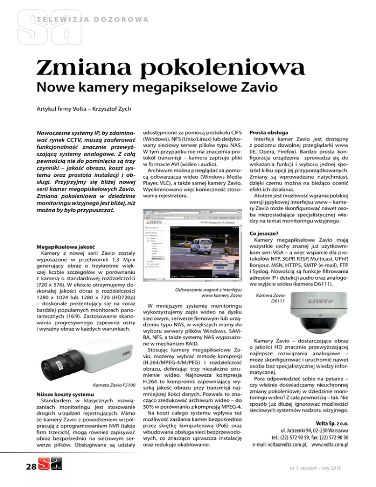 t e l e w i z j a d o zo r owa Zmiana pokoleniowa Nowe kamery megapikselowe Zavio Artykuł firmy Volta – Krzysztof Zych Nowoczesne systemy IP, by zdominować rynek CCTV, muszą zaoferować funkcjonalność znacznie przewyższającą systemy analogowe. Z całą pewnością nie do pominięcia są trzy czynniki – jakość obrazu, koszt systemu oraz prostota instalacji i obsługi. Przyjrzyjmy się bliżej nowej serii kamer megapiskelowych Zavio. Zmiana pokoleniowa w dziedzinie monitoringu wizyjnego jest bliżej, niż można by było przypuszczać. Megapikselowa jakość Kamery z nowej serii Zavio zostały wyposażone w przetwornik 1,3 Mpix generujący obraz o trzykrotnie większej liczbie szczegółów w porównaniu z kamerą o standardowej rozdzielczości (720 x 576). W efekcie otrzymujemy doskonałej jakości obraz o rozdzielczości 1280 x 1024 lub 1280 x 720 (HD720p) – doskonale prezentujący się na coraz bardziej popularnych monitorach panoramicznych (16:9). Zastosowanie skanowania progresywnego zapewnia ostry i wyraźny obraz w każdych warunkach. Kamera Zavio F5100 Niższe koszty systemu Standardem w klasycznych rozwiązaniach monitoringu jest stosowanie drogich urządzeń rejestrujących. Mimo że kamery Zavio z powodzeniem współpracują z oprogramowaniem NVR (także firm trzecich), mogą również zapisywać obraz bezpośrednio na sieciowym serwerze plików. Obsługiwane są udziały 28 udostępnione za pomocą protokołu CIFS (Windows), NFS (Unix/Linux) lub dedykowany sieciowy serwer plików typu NAS. W tym przypadku nie ma znaczenia protokół transmisji – kamera zapisuje pliki w formacie AVI (wideo i audio). Archiwum można przeglądać za pomocą odtwarzacza wideo (Windows Media Player, VLC), a także samej kamery Zavio. Wyeliminowano więc konieczność stosowania rejestratora. Odtwarzanie nagrań z interfejsu www kamery Zavio W mniejszym systemie monitoringu wykorzystujemy zapis wideo na dysku sieciowym, serwerze firmowym lub urządzeniu typu NAS, w większych mamy do wyboru serwery plików Windows, SAMBA, NFS, a także systemy NAS wyposażone w mechanizm RAID. Stosując kamery megapikselowe Zavio, możemy wybrać metodę kompresji (H.264/MPEG-4/MJPEG) i rozdzielczość obrazu, definiując trzy niezależne strumienie wideo. Najnowsza kompresja H.264 to kompromis zapewniający wysoką jakość obrazu przy transmisji najmniejszej ilości danych. Pozwala to znacząco zredukować archiwum wideo – do 50% w porównaniu z kompresją MPEG-4. Na koszt całego systemu wpływa też możliwość zasilania kamer bezpośrednio przez skrętkę komputerową (PoE) oraz wbudowana obsługa sieci bezprzewodowych, co znacząco upraszcza instalację oraz redukuje okablowanie. Prosta obsługa Interfejs kamer Zavio jest dostępny z poziomu dowolnej przeglądarki www (IE, Opera, Firefox). Bardzo prosta konfiguracja urządzenia sprowadza się do wskazania funkcji i wyboru jednej spośród kilku opcji jej przyporządkowanych. Zmiany są wprowadzane natychmiast, dzięki czemu można na bieżąco ocenić efekt ich działania. Atutem jest możliwość wgrania polskiej wersji językowej interfejsu www – kamery Zavio może skonfigurować nawet osoba nieposiadająca specjalistycznej wiedzy na temat monitoringu wizyjnego. Co jeszcze? Kamery megapikselowe Zavio mają wszystkie cechy znanej już użytkownikom serii VGA – a więc wsparcie dla protokołów NTP, 3GPP, RTSP, Multicast, UPnP, Bonjour, MSN, HTTPS, SMTP (e-mail), FTP i Syslog. Nowością są funkcje filtrowania adresów IP i detekcji audio oraz analogowe wyjście wideo (kamera D6111). Kamera Zavio D6111 Kamery Zavio – dostarczające obraz o jakości HD znacznie przewyższającej najlepsze rozwiązania analogowe – może skonfigurować i uruchomić nawet osoba bez specjalistycznej wiedzy informatycznej. Pora odpowiedzieć sobie na pytanie – czy właśnie doświadczamy nieuchronnej zmiany pokoleniowej w dziedzinie monitoringu wideo? Z całą pewnością – tak. Nie sposób już dłużej ignorować możliwości sieciowych systemów nadzoru wizyjnego. Volta Sp. z o.o. ul. Jutrzenki 94, 02-230 Warszawa tel.: (22) 572 90 59, fax: (22) 572 90 30 e-mail: [email protected], www.volta.com.pl nr 1, styczeń – luty 2010