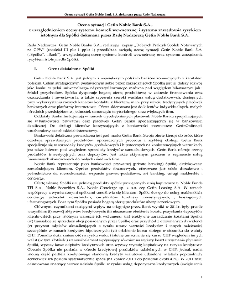 Ocena sytuacji Getin Noble Bank S.A. dokonana przez Radę Nadzorczą Ocena sytuacji Getin Noble Bank S.A., z uwzględnieniem oceny systemu kontroli wewnętrznej i systemu zarządzania ryzykiem istotnym dla Spółki dokonana przez Radę Nadzorczą Getin Noble Bank S.A. Rada Nadzorcza Getin Noble Banku S.A., realizując zapisy „Dobrych Praktyk Spółek Notowanych na GPW” (rozdział III pkt 1 ppkt 1) przedkłada zwięzłą ocenę sytuacji Getin Noble Bank S.A. („Spółka”, „Bank”), uwzględniającą ocenę systemu kontroli wewnętrznej oraz systemu zarządzania ryzykiem istotnym dla Spółki. I. Ocena działalności Spółki Getin Noble Bank S.A. jest jednym z największych polskich banków komercyjnych z kapitałem polskim. Celem strategicznym postawionym sobie przez zarządzających Spółką jest jej dalszy rozwój, jako banku w pełni uniwersalnego, zdywersyfikowanego zarówno pod względem bilansowym jak i źródeł przychodów. Spółka dysponuje bogatą ofertą produktową w zakresie finansowania oraz oszczędzania i inwestowania, a także zapewnia szeroki wachlarz usług dodatkowych, dostępnych przy wykorzystaniu różnych kanałów kontaktu z klientem, m.in. przy użyciu tradycyjnych placówek bankowych oraz platformy internetowej. Oferta skierowana jest do klientów indywidualnych, małych i średnich przedsiębiorstw, jednostek samorządu terytorialnego oraz większych firm. Oddziały Banku funkcjonują w ramach wyodrębnionych placówek Noble Banku specjalizujących się w bankowości prywatnej oraz placówek Getin Banku specjalizujących się w bankowości detalicznej. Do obsługi klientów korzystających z bankowości internetowej GetinOnline.pl. uruchomiony został oddział internetowy. Bankowość detaliczną prowadzona jest pod marką Getin Bank. Swoją ofertę kieruje do osób, które oczekują sprawdzonych produktów, uproszczonych procedur i szybkiej obsługi. Getin Bank specjalizuje się w sprzedaży kredytów gotówkowych i hipotecznych na konkurencyjnych warunkach, jest także liderem pod względem sprzedaży kredytów samochodowych. Getin Bank oferuje szereg produktów inwestycyjnych oraz depozytów. Jest także aktywnym graczem w segmencie usług finansowych skierowanych do małych i średnich firm. Noble Bank reprezentuje pion bankowości prywatnej (private banking) Spółki, dedykowanej zamożniejszym klientom. Oprócz produktów finansowych, oferowane jest także doradztwo i pośrednictwo ds. nieruchomości, wsparcie prawno-podatkowe, art banking, usługi maklerskie i concierge. Ofertę własną Spółki uzupełniają produkty spółek powiązanych z nią kapitałowo tj. Noble Funds TFI S.A., Noble Securities S.A., Noble Concierge sp. z o.o. czy Getin Leasing S.A. W ramach współpracy z wymienionymi spółkami umożliwia się klientom Spółki dostęp do usług maklerskich, concierge, jednostek uczestnictwa, certyfikatów funduszy inwestycyjnych, , leasingowych i factoringowych. Poza tym Spółka posiada bogatą ofertę produktów ubezpieczeniowych. Głównymi czynnikami mającymi wpływ na osiągnięte przez Bank wyniki w 2011r. były przede wszystkim: (i) rozwój aktywów kredytowych; (ii) nieznaczne obniżenie kosztu pozyskania depozytów klientowskich przy istotnym wzroście ich wolumenu; (iii) efektywne zarządzanie kosztami Spółki; (iv) transakcje ze sprzedaży akcji posiadanych przez Spółkę oraz przychód z otrzymanych dywidend; (v) przyrost odpisów aktualizujących z tytułu utraty wartości kredytów i innych należności, szczególnie w ramach kredytów hipotecznych; (vi) osłabienie kursu złotego w stosunku do waluty CHF. Ponadto duża zmienność na rynku walut i istotne umacnianie się kursu CHF względem innych walut (w tym złotówki) stanowił element wpływający również na wyższy koszt utrzymania płynności Spółki, wyższy koszt odpisów kredytowych oraz wyższy wymóg kapitałowy na ryzyko kredytowe. Obecnie Spółka nie posiada w ofercie kredytowej produktów udzielanych w CHF, jednak nadal istotną część portfela kredytowego stanowią kredyty walutowe udzielone w latach poprzednich, aczkolwiek ich poziom systematycznie spada (na koniec 2011 r do poziomu około 41%). W 2011 roku odnotowano znaczący wzrost udziału Spółki w rynku usług depozytowo-kredytowych (zwiększenie 1 Ocena sytuacji Getin Noble Bank S.A. dokonana przez Radę Nadzorczą udział w rynku depozytów osób fizycznych do poziomu 8,2% oraz w rynku kredytów dla osób fizycznych do poziomu 8,1%). W 2011 r. Spółka dokonała zbycia posiadanych akcji spółki Open Finance S.A. w związku z wprowadzeniem spółki na Giełdę Papierów Wartościowych w Warszawie S.A. („GPW”) i utraciła pozycję dominującą wobec spółki Open Finance S.A.. W II półroczu 2011 r. Spółka wyemitowała obligacje podporządkowane serii A-E o łącznej wartości 400 mln zł, które zostały zaliczone do funduszy własnych na podstawie uzyskania stosownych zgód Komisji Nadzoru Finansowego. W lipcu 2011 r. został przyjęty Program Opcji Menedżerskich, na podstawie którego Spółka wyemituje do 6 000 000 warrantów oraz do 6 000 000 akcji. Z każdego warrantu wynikało będzie prawo do objęcia jednej akcji po cenie wynoszącej 1,00 zł. Warranty emitowane będą w latach 2012, 2013 i 2014. W III kwartale 2011r. podpisano umowy z Uczestnikami Programu na nabycie 4 713 004 warrantów. W dniu 14 grudnia 2011 r. Spółka zawarła umowę znaczącą tj. porozumienie o strategicznym partnerstwie pomiędzy nią a Towarzystwem Ubezpieczeń Europa S.A., Towarzystwem Ubezpieczeń na Życie Europa S.A. oraz Open Life Towarzystwem Ubezpieczeń Życie S.A. Wcześniej Spółka podpisała umowę zbycia posiadanych akcji Open Life Towarzystwem Ubezpieczeń Życie S.A. na rzecz Towarzystwa Ubezpieczeń Europa S.A., która została wykonana w styczniu 2012 r. W 2011r. zostały podjęte kroki mające na celu dokonanie zmiany w strukturze właścicielskiej grupy kapitałowej, do k