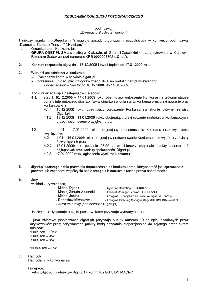 REGULAMIN KONKURSU FOTOGRAFICZNEGO pod nazwą: „Dwunasta Siostra z Tension” Niniejszy regulamin („Regulamin”) reguluje zasady organizacji i uczestnictwa w konkursie pod nazwą: „Dwunasta Siostra z Tension” („Konkurs”) 1. Organizatorem Konkursu jest: GRUPA ONET.PL SA z siedzibą w Krakowie, ul. Gabrieli Zapolskiej 44, zarejestrowana w Krajowym Rejestrze Sądowym pod numerem KRS 0000007763 („Onet”). 2. Konkurs rozpocznie się w dniu 16.12.2008 i trwać będzie do 17.01.2009 roku. 3. Warunki uczestnictwa w konkursie: • Posiadanie konta w serwisie digart.pl • przesłanie (upload) pliku fotograficznego JPG, na portal digart.pl do kategorii: - inne/Tension – Siostry od 16.12.2008 do 14.01.2009 4. Konkurs składa się z następujących etapów: 4.1. etap I: 16.12.2008 – 14.01.2009 roku, obejmujący ogłoszenie Konkursu na głównej stronie portalu internetowego digart.pl (www.digart.pl) w dniu startu konkursu oraz przyjmowanie prac konkursowych; 4.1.1 16.12.2008 roku, obejmujący ogłoszenie Konkursu na stronie głównej serwisu Digart.pl; 4.1.2 16.12.2008– 14.01.2009 roku, obejmujący przyjmowanie materiałów konkursowych, prezentację i ocenę przyjętych prac; 4.2 etap II: 4.01 – 17.01.2009 roku, obejmujący podsumowanie Konkursu oraz wyłonienie zwycięzców; 4.2.1 4.01 – 16.01.2009 roku, obejmujący podsumowanie Konkursu oraz wybór przez Jury 5 zwycięskich prac; 4.2.2 16.01.2009r o godzinie 23:59 Juror zbiorowy przyznaje punkty autorom 10 najlepszych prac według społeczności Digart.pl 4.2.3 17.01.2009 roku, ogłoszenie wyników Konkursu; 5. digart.pl zastrzega sobie prawo nie dopuszczenia do konkursu prac, których treść jest sprzeczna z prawem lub zasadami współŜycia społecznego lub narusza słuszne prawa osób trzecich. 6. Jury w skład Jury wchodzą: - Michał Dębek - Dyrektor Marketingu – TECHLAND - Maciej śmuda-Adamski - Product Manager Tension - TECHLAND - Michał Janica - Fotograf – Specjalista ds. eventów digart.pl – onet.pl - Radosław Michałowski - Fotograf, Directing Manager sfery MULTIMEDIA - onet.pl - Juror zbiorowy (społeczność Digart.pl) - KaŜdy juror dysponuje pulą 10 punktów, które przyznaje wybranym pracom - juror zbiorowy (społeczność digart.pl) przyznaje punkty autorom 10 najlepiej ocenionych przez uŜytkowników prac; przyznawane punkty będą odwrotnie proporcjonalna do zajętego przez autora miejsca: 1 miejsce – 10pkt. 2 miejsce – 9pkt 3 miejsce – 8pkt ….. 10 miejsce – 1pkt 7. Nagrody: Nagrodami w konkursie są: I miejsce: autor zdjęcia: - obiektyw Sigma 17-70mm F/2.8-4.5 DC MACRO 1 (system mocowania do wyboru: Canon, Nikon, Sony/Minolta, Pentax/Samsung) - lampa błyskowa Sigma EF-500 DG ST (system mocowania do wyboru: Nikon, Canon, KonicaMinolta) - blenda złota/biała 107 cm. Modelka: - profesjonalna sesja fotograficzna z wizaŜem, przeprowadzona przez agencję Exto Group miejsca II - V: pakiet 5 gier: - Drakensang: The Dark Eye - Tension - Legend: Hand of God - eXperience 112 - TrackMania United Forever 7.1 7.2 7.3 7.4 7.5 7.6 7.7 8. Nagrody nie podlegają zamianie na ich równowartość pienięŜną. Uczestnikowi konkursu przysługuje tylko jedna nagroda. Jakiekolwiek roszczenia uczestników Konkursu z tytułu nieotrzymania nagród, które nie zostały im przyznane, są wyłączone. Prawo do nagrody nie moŜe być scedowane na inną osobę. Informacje o wynikach Konkursu, pierwszej jego części oraz o przyznaniu nagrody głównej będą rozpowszechniane na stronach serwisu digart.pl. Ponadto do nagrodzonego zostanie wysłana wiadomość pocztą elektroniczną na adres wskazany podczas rejestracji w portalu digart.pl. Wiadomość zostanie wysłana najpóźniej w ciągu 5 dni po rozstrzygnięciu Konkursu. W ciągu 24 godzin po otrzymaniu od Onet.pl potwierdzenia przydzielenia nagrody, Uczestnik jest zobowiązany potwierdzić pocztą elektroniczną na adres [email protected] przyjęcie nagrody. Jeśli takie potwierdzenie nie nastąpi w określonym w zdaniu poprzedzającym terminie, nagroda przepada i przechodzi na następna osobę pod względem ilości zgromadzonych punktów. Nad prawidłowością przebiegu Konkursu czuwać będzie Komisja Konkursowa, do której zadań naleŜeć będzie nadzór nad przestrzeganiem Regulaminu. Od decyzji Komisji nie przysługuje odwołanie. Odbiór nagród: 8.1. Po potwierdzeniu przyjęcia nagrody, nagroda zostanie przesłana pocztą do zwycięzcy na adres korespondencyjny podany podczas zgłoszenia. 8.2. Wysyłka nagród odbędzie się na koszt TECHLAND. 8.3. W przypadku braku moŜliwości skontaktowania się ze Zwycięzcą po otrzymaniu potwierdzenia przyjęcia nagrody w terminie 7 dni od momentu ogłoszenia wyników, nagroda tego Zwycięzcy przepada i przechodzi na następną osobę pod względem ilości zgromadzonych punktów. 9. Regulamin jest dostępny w siedzibie Organizatora – Grupa Onet.pl S.A. w Krakowie, przy ul. Gabrieli Zapolskiej 44, oraz na stronie konkursowej w Portalu internetowym digart.pl pod adresem http://digart.pl/stuff/TENSIONregulamin.pdf 10. Regulamin jest jedynym dokumentem określającym zasady Konkursu. 11. Reklamacje dotyczące przebiegu i organizacji Konkursu mogą być składane przez uczestników Konkursu w terminie 5 dni od dnia ogłoszenia finalistów – zdobywców nagród głównych. Reklamacje rozpatrują Organizatorzy w terminie 14 dni od dnia otrzymania reklamacji. O rozpatrzeniu reklamacji uczestnik ją składający zostaje zawiadomiony na adres poczty elektronicznej podany w zgłoszeniu. Warunkiem dochodzenia roszczeń na drodze sadowej jest wyczerpanie drogi reklamacji. 12. Wszelkie roszczenia rozpoznaje sąd powszechny właściwy dla siedziby Grupa Onet.pl S.A. 13. Wszelkie doręczenia dla Organizatorów powinny być dokonywane pod adres: Grupa Onet.pl SA, ul. Gabrieli Zapolskiej 44, 30-126 Kraków z dopiskiem: „digart.pl”. Kraków, dnia 15.12.2008 roku 2