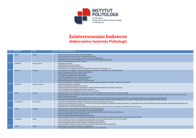 Zainteresowania badawcze doktorantów Instytutu Politologii L.P. NAZWISKO Imię Obszary zainteresowań badawczych 1. BEKIER Bartosz 2. BERLIŃSKA Katarzyna Marta 3. BIELECKI Zdzisław 4. BRUDNICKI Radosław Zygmunt 5. BUDEK Konrad 6. CHUDKIEWICZ Maciek Paweł 7. CIOSEK Zbigniew 8. CYMERMAN Marta 9. CZEREP Jędrzej TEORIA NOWEJ WOJNY (TZW. WOJNY CZWARTEJ GENERACJI) ETNO-RELIGIJNE ASPEKTY KONFLIKTÓW ŚRODKOWOEUROPEJSKICH HISTORIA POLITYCZNA CZECH I SŁOWACJI, GEOPOLITYKA EUROPY ŚRODKOWEJ EKSTREMIZM POLITYCZNY NIEPAŃSTWOWYCH AKTORÓW STOSUNKÓW MIĘDZYNARODOWYCH MYŚL POLITYCZNA RADYKALNEJ LEWICY I PRAWICY ZARZĄDZANIE PUBLICZNE ADMINISTRACYJNE PUBLIC RELATIONS KOMUNIKOWANIE SPOŁECZNE I POLITYCZNE ETYKA BIZNESU I ETYKA KOMUNIKOWANIA (DZIENNIKARSTWA, REKLAMY, MARKETINGU I PR) POLITYCZNE ASPEKTY SWOBODY PRZEPŁYWU INFORMACJI W MEDIACH I W INTERNECIE PO 11 WRZEŚNIA 2001R. PROCESY GLOBALIZACJI MEDIÓW – ASPEKT POLITOLOGICZNY, KOMUNIKACJA POLITYCZNA W NOWYCH MEDIACH, SPOŁECZEŃSTWO OBYWATELSKIE A NOWE MEDIA, POLITYCZNY WYMIAR REGULACJI I DEREGULACJI MEDIÓW, DIALOG A KONFLIKTY KULTUROWE I MIĘDZYRELIGIJNE, MEDIA ELEKTRONICZNE A TERRORYZM PO 11 WRZEŚNIA 2001R. DIALOG CHRZEŚCIJAŃSKO-MUZUŁMAŃSKI; HISTORIA I WSPÓŁCZESNOŚĆ, ZAGROŻENIA I WYZWANIA , ASPEKT POLITOLOGICZNY TOŻSAMOŚĆ NARODOWA SŁOWAKÓW HISTORIA W SŁOWACKIM DYSKURSIE POLITYCZNYM STOSUNKI SŁOWACKO-WĘGIERSKIE I ZAGADNIENIA OCHRONY PRAWNEJ MNIEJSZOŚCI W REPUBLICE SŁOWACKIEJ POLITYKA WEWNĘTRZNA I ZAGRANICZNA REPUBLIKI SŁOWACKIEJ USTRÓJ SAMORZĄDU TERYTORIALNEGO W POLSCE I POLITYKA LOKALNA NOWE TECHNOLOGIE ORAZ KOMUNIKACJA. NA STYKU TYCH DWÓCH DZIEDZIN ZNAJDUJĄ SIĘ MEDIA, ZWŁASZCZA INTERNET OBECNOŚĆ MANIPULACJI W MEDIACH I TEORIA PROPAGANDY. W TEJ SFERZE MIESZCZĄ SIĘ ZARÓWNO JĘZYKOWE TECHNIKI MANIPULACYJNE I RETORYKA, JAK I AGENDA SETTING I INNE TECHNIKI MAJĄCE NA CELU NAKŁONIENIE ODBIORCY DO ZMIANY POSTAWY WPŁYW NOWYCH TECHNOLOGII NA KOMUNIKACJĘ MIĘDZYLUDZKĄ I SPOŁECZNĄ. ROZWÓJ SERWISÓW SPOŁECZNOŚCIOWYCH, TECHNOLOGII MOBILNYCH CZY ROZSZERZONEJ RZECZYWISTOŚCI EKONOMIA RYNKU MEDIALNEGO, MODELE BIZNESOWE DLA WYDAWCÓW I NOWE MODELE FUNKCJONOWANIA PRASY (W ZWIĄZKU Z SZEROKO OGŁASZANYM KOŃCEM PRASY DRUKOWANEJ) SOCJOLOGIA POLITYKI (BADANIA SCENY POLITYCZNEJ ORAZ ANALIZA STRATEGICZNA W POLITYCE) SOCJOLOGIA GOSPODARKI (RELACJE BIZNES – POLITYKA, PARTYCYPACJA PRACOWNICZA W KONTEKŚCIE ZMIAN SYSTEMOWYCH I MODERNIZACYJNYCH, GRUPY INTERESÓW, DIALOG SPOŁECZNY MIĘDZY RZĄDEM, ORGANIZACJAMI PRACODAWCÓW I ZWIĄZKAMI ZAWODOWYMI) MARKETING POLITYCZNY (WYKORZYSTANIE MEDIÓW SPOŁECZNOŚCIOWYCH PRZEZ POLITYKÓW W KAMPANIACH WYBORCZYCH ORAZ POZA NIMI) SYTUACJA POLONII I ORAZ SYSTEM OPIEKI PAŃSTWA POLSKIEGO NAD DIASPORĄ STOSUNKI POLSKO-LITEWSKIE, W SZCZEGÓLNOŚCI STOSUNKI MIĘDZYRZĄDOWE WPŁYW SYTUACJI MNIEJSZOŚCI NARODOWYCH NA STOSUNKI PAŃSTWA POCHODZENIA I PAŃSTWA ZAMIESZKANIA TOŻSAMOŚĆ NARODOWA, DYSKURS TOŻSAMOŚCIOWY ETYKA ZAWODOWA URZĘDNIKÓW ADMINISTRACJI PUBLICZNEJ POLITYKA ENERGETYCZNA, WPŁYW POLITYKI SUROWCOWEJ ROSJI NA BEZPIECZEŃSTWO W REGIONIE, ZNACZENIE INFRASTRUKTURY PRZESYŁOWEJ PARTIE I SYSTEMY PARTYJNE, W SZCZEGÓLNOŚCI MŁODZIEŻÓWKI PARTYJNE I UDZIAŁ MŁODZIEŻY W ŻYCIU POLITYCZNYM POLITYKA SPOŁECZNA, III SEKTOR, ORGANIZACJE POZARZĄDOWE I WOLONTARIAT MEDIA PUBLICZNE I PRYWATNE, PRAWO PRASOWE, KOMUNIKOWANIE SPOŁECZNE POLACY ZA GRANICĄ (PRAWA POLONII, KARTA POLAKA, KWESTIE REPATRIACJI), PRAWA MIGRANTÓW TRANSFORMACJE POLITYCZNE W PAŃSTWACH AFRYKAŃSKICH SPOŁECZEŃSTWO OBYWATELSKIE W AFRYCE SUBSAHARYJSKIEJ I AFRYCE PÓŁNOCNEJ 10. DE TCHÓRZEWSKI Szymon Piotr 11. GAŁĄZKA Marta 12. GARBACZEWSKI Bartłomiej Adam 13. GRELA Paweł 14. GRELOFF Jakub Roman 15. GROCHALA Łukasz 16. HÉJJ Dominik 17. JANKOWSKI Bartosz 18. JANUS Marta Marianna RADYKALNE UGRUPOWANIA ISLAMISTYCZNE W AFRYCE BIAŁORUŚ: TOŻSAMOŚĆ POGRANICZA BAŁKANY: PRZEOBRAŻENIA SPOŁECZNO-POLITYCZNE FILOZOFIA POLITYKI (SZCZEGÓLNIE MYŚL KONSERWATYWNA I LIBERALNA) HISTORIA FILOZOFII (SZCZEGÓLNIE ŚREDNIOWIECZNEJ) HISTORIA IDEI (ZWŁASZCZA IDEI KOMUNISTYCZNYCH I W TYM KONTEKŚCIE STOSUNEK DO NICH PROFESORA LESZKA KOŁAKOWSKIEGO) LOGIKA (JAKO PEWNA FILOZOFICZNA DYSCYPLINA) SYSTEMY WYBORCZE, PRAWO WYBORCZE I ZACHOWANIA WYBORCZE PARTIE I SYSTEMY PARTYJNE (W TYM FINANSOWANIE POLITYKI), UDZIAŁ KOBIET W ŻYCIU PUBLICZNYM, EDUKACJA OBYWATELSKA. LIBERTARIANIZM I SOCJALIZM PAŃSTWO I EKONOMIA WOLNORYNKOWA (SZKOŁA AUSTRIACKA) WSPÓŁCZESNA AMERYKAŃSKA MYŚL POLITYCZNA, ZWŁ. MYŚL LIBERTARIAŃSKA (ZWŁASZCZA MYŚL EKONOMICZNA I SPOŁECZNA TAK ZWANEJ AUSTRIACKIEJ SZKOŁY EKONOMII) SYSTEM POLITYCZNY I PARTYJNY STANÓW ZJEDNOCZONYCH (DZIAŁANIE SYSTEMU POLITYCZNEGO NA POZIOMIE FEDERALNYM – KONGRES USA, PREZYDENT USA) NAJNOWSZE WYDARZENIA NA AMERYKAŃSKIEJ SCENIE POLITYCZNEJ, ORAZ ICH SPOŁECZNE I MIĘDZYNARODOWE IMPLIKACJE MYŚL POLITYCZNA AYN RAND KLASYCZNA MYŚL POLITYCZNA – GRECKA I RZYMSKA ORAZ JEJ WSPÓŁCZESNE ODCZYTANIA W REFLEKSJI TAKICH MYŚLICIELI JAK: LEO STRAUSS, ERIC VOEGELIN, HANNAH AREND, KUMUNITARYZM POLSKA ZAGRANICZNA POLITYKA HISTORYCZNA, EUROPEJSKA POLITYKA PAMIĘCI, PAMIĘĆ ZBIOROWA, PEDAGOGIKA PAMIĘCI; NAJNOWSZA HISTORIA POLITYCZNA POLSKI; POLITYCZNOŚĆ I POLITYZACJA PROBLEMATYKI ŻYDOWSKIEJ; ANTROPOLOGIA POLITYCZNA, HISTORIA MYŚLI POLITYCZNEJ I SPOŁECZNEJ; DEBATA PUBLICZNA, SPOŁECZEŃSTWO OBYWATELSKIE, ELITY POLITYCZNE; PROCESY DECYZYJNE W ADMINISTRACJI PUBLICZNEJ, ZARZĄDZANIE ORGANIZACJĄ. SAMORZĄD TERYTORIALNY W POLSCE – HISTORIA, FUNKCJONOWANIE, USTRÓJ, WSPÓŁPRACA MIĘDZY RÓŻNYMI SZCZEBLAMI RELACJE MIĘDZY SAMORZĄDEM, A KOŚCIOŁEM W HISTORYCZNO-SPOŁECZNEJ PERSPEKTYWIE. PARTNERSTWO PUBLICZNO-PRYWATNE W SAMORZĄDZIE TERYTORIALNYM PUBLIC RELATIONS W SAMORZĄDZIE LOKALNYM WĘGRY: SYSTEM PARTYJNY I POLITYCZNY, HISTORIA POLITYCZNA, POLITYKA HISTORYCZNA, POLITYKA PAMIĘCI, POLITYKA ETNICZNA ORAZ TO, CO Z WĘGRAMI ZWIĄZANE STOSUNKI MIĘDZYNARODOWE POMOC/WSPÓŁPRACA ROZWOJO