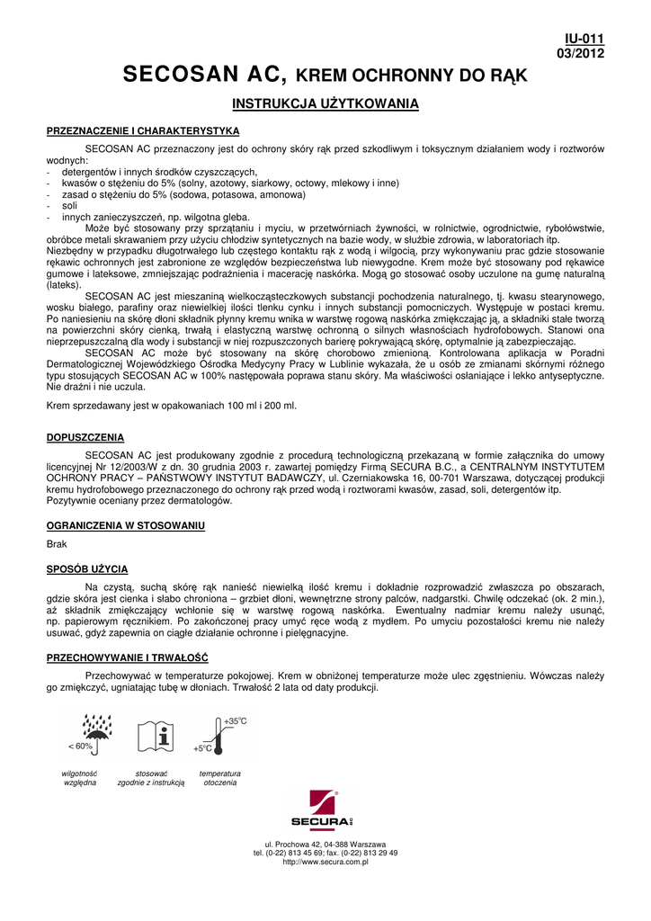 SECOSAN AC, IU-011 03/2012 KREM OCHRONNY DO R K INSTRUKCJA U YTKOWANIA PRZEZNACZENIE I CHARAKTERYSTYKA SECOSAN AC przeznaczony jest do ochrony skóry r k przed szkodliwym i toksycznym działaniem wody i roztworów wodnych: - detergentów i innych rodków czyszcz cych, - kwasów o st eniu do 5% (solny, azotowy, siarkowy, octowy, mlekowy i inne) - zasad o st eniu do 5% (sodowa, potasowa, amonowa) - soli - innych zanieczyszcze , np. wilgotna gleba. Mo e by stosowany przy sprz taniu i myciu, w przetwórniach ywno ci, w rolnictwie, ogrodnictwie, rybołówstwie, obróbce metali skrawaniem przy u yciu chłodziw syntetycznych na bazie wody, w słu bie zdrowia, w laboratoriach itp. Niezb dny w przypadku długotrwałego lub cz stego kontaktu r k z wod i wilgoci , przy wykonywaniu prac gdzie stosowanie r kawic ochronnych jest zabronione ze wzgl dów bezpiecze stwa lub niewygodne. Krem mo e by stosowany pod r kawice gumowe i lateksowe, zmniejszaj c podra nienia i maceracj naskórka. Mog go stosowa osoby uczulone na gum naturaln (lateks). SECOSAN AC jest mieszanin wielkocz steczkowych substancji pochodzenia naturalnego, tj. kwasu stearynowego, wosku białego, parafiny oraz niewielkiej ilo ci tlenku cynku i innych substancji pomocniczych. Wyst puje w postaci kremu. Po naniesieniu na skór dłoni składnik płynny kremu wnika w warstw rogow naskórka zmi kczaj c j , a składniki stałe tworz na powierzchni skóry cienk , trwał i elastyczn warstw ochronn o silnych własno ciach hydrofobowych. Stanowi ona nieprzepuszczaln dla wody i substancji w niej rozpuszczonych barier pokrywaj c skór , optymalnie j zabezpieczaj c. SECOSAN AC mo e by stosowany na skór chorobowo zmienion . Kontrolowana aplikacja w Poradni Dermatologicznej Wojewódzkiego O rodka Medycyny Pracy w Lublinie wykazała, e u osób ze zmianami skórnymi ró nego typu stosuj cych SECOSAN AC w 100% nast powała poprawa stanu skóry. Ma wła ciwo ci osłaniaj ce i lekko antyseptyczne. Nie dra ni i nie uczula. Krem sprzedawany jest w opakowaniach 100 ml i 200 ml. DOPUSZCZENIA SECOSAN AC jest produkowany zgodnie z procedur technologiczn przekazan w formie zał cznika do umowy licencyjnej Nr 12/2003/W z dn. 30 grudnia 2003 r. zawartej pomi dzy Firm SECURA B.C., a CENTRALNYM INSTYTUTEM OCHRONY PRACY – PA STWOWY INSTYTUT BADAWCZY, ul. Czerniakowska 16, 00-701 Warszawa, dotycz cej produkcji kremu hydrofobowego przeznaczonego do ochrony r k przed wod i roztworami kwasów, zasad, soli, detergentów itp. Pozytywnie oceniany przez dermatologów. OGRANICZENIA W STOSOWANIU Brak SPOSÓB U YCIA Na czyst , such skór r k nanie niewielk ilo kremu i dokładnie rozprowadzi zwłaszcza po obszarach, gdzie skóra jest cienka i słabo chroniona – grzbiet dłoni, wewn trzne strony palców, nadgarstki. Chwil odczeka (ok. 2 min.), a składnik zmi kczaj cy wchłonie si w warstw rogow naskórka. Ewentualny nadmiar kremu nale y usun , np. papierowym r cznikiem. Po zako czonej pracy umy r ce wod z mydłem. Po umyciu pozostało ci kremu nie nale y usuwa , gdy zapewnia on ci głe działanie ochronne i piel gnacyjne. PRZECHOWYWANIE I TRWAŁO Przechowywa w temperaturze pokojowej. Krem w obni onej temperaturze mo e ulec zg stnieniu. Wówczas nale y go zmi kczy , ugniataj c tub w dłoniach. Trwało 2 lata od daty produkcji. wilgotno wzgl dna stosowa zgodnie z instrukcj temperatura otoczenia ul. Prochowa 42, 04-388 Warszawa tel. (0-22) 813 45 69; fax. (0-22) 813 29 49 http://www.secura.com.pl