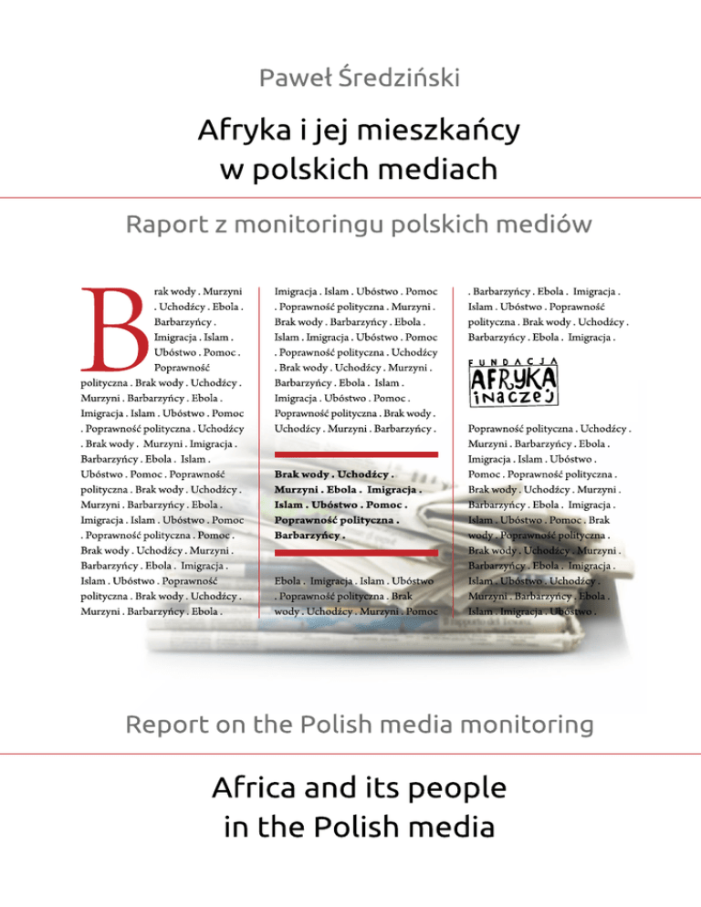 Paweł Średziński Afryka i jej mieszkańcy w polskich mediach Raport z monitoringu polskich mediów Fundacja „Afryka Inaczej” jest organizacją pożytku publicznego, dedykowaną afrykańskiej społeczności mieszkającej w Polsce. Swoje cele realizuje poprzez zwiększanie partycypacji osób pochodzenia afrykańskiego w życiu publicznym, działalność rzecznikowską, współpracę ze środowiskiem afrykańskich imigrantów i administracją publiczną oraz podejmowanie interwencji w sprawach związanych z dyskryminacją Afrykanek i Afrykanów w Polsce. Fundacja realizuje również zadania z zakresu dialogu międzykulturowego i prowadzi działania na rzecz promowania Afryki w Polsce oraz Polski w Afryce. Monitoruje też polską pomoc rozwojową Afryce. Dowiedz się więcej o Fundacji i jak możesz pomóc: www.afryka.org oraz www.fundacja.afryka.org Publikacja powstała we współpracy z Fundacją Republika Kultury, www.repkul.pl Autor: Paweł Średziński Konsultacja: Mamadou Diouf Współpraca: Katarzyna Pietrasik Korekta: Urszula Glińska Tłumaczenie: Wojciech Włoch DTP: Andrzej Poskrobko copyright © by: Fundacja „Afryka Inaczej”, Warszawa 2016 Wydawca: Fundacja „Afryka Inaczej” Współpraca: Agencja Wydawnicza EkoPress / 601 311 838 ISBN 978-83-62069-80-4 Nasz KRS 0000313745 Projekt „Afrykanie w Polsce – badanie i monitoring na rzecz zwalczania dyskryminacji”, realizowany w ramach dotacji otrzymanej z programu Obywatele dla Demokracji, finansowanego z Funduszy EOG, jest projektem o zasięgu ogólnopolskim i ma na celu sprawdzenie, jak po pięciu latach, od przeprowadzenia pierwszych kompleksowych badań na temat postrzegania Afryki i jej mieszkańców przez obywateli Polski oraz pierwszego monitoringu polskich mediów, zmienia się stosunek polskiego społeczeństwa i mediów wobec osób pochodzenia afrykańskiego. W rezultacie projekt dostarcza kluczowych danych, niezbędnych do prowadzenia działań, które w sposób systemowy przeciwdziałają nietolerancji i dyskryminacji, w tym pomaga też lepiej zrozumieć współczesne źródła zjawiska mowy nienawiści. Jednocześnie projekt zajmuje się grupą osób pochodzenia afrykańskiego, której nie są poświęcane dedykowane i odrębne badania, i jest prowadzony przy bezpośrednim udziale Afrykanów. Projekt „Afrykanie w Polsce – badanie i monitoring na rzecz zwalczania dyskryminacji”, realizowany w ramach dotacji otrzymanej z programu Obywatele dla Demokracji, finansowanego z Funduszy EOG. Spis treści Wprowadzenie ............................................................................................................. 5 W świecie „naszych-obcych” celebrytów ................................................................... 9 Politycy, sportowcy i „święci” ................................................................................... 16 Znani Polacy o Afryce i jej mieszkańcach ............................................................... 23 Grzywny za „czarnucha” ........................................................................................... 29 Miasto prawie otwarte .............................................................................................. 35 Rasizm? Wrocławia sprawa ...................................................................................... 42 Ebola, Murzyni i polityczna poprawność ................................................................. 48 Uchodźcy atakują! Zmierzch multikulti? ................................................................. 55 Wnioski ....................................................................................................................... 62 M. Diouf, Słów kilka o Afryce i Afrykanach w polskich mediach ............................ 67 Africa and its people in the Polish media (english version) .................................... 75 ∎ 4 ∎ Wprowadzenie A fryka i jej mieszkańcy nie dominują w polskich przekazach medialnych. Skąpe informacje docierające do odbiorców mediów w Polsce kreują jednocześnie specyficzny wizerunek Afrykanów i w rezultacie są często jedynym sposobem na bardzo pobieżne poznanie Afryki. Ten fakt z kolei przekłada się na wiedzę Polaków o Afryce i Afrykanach. Kontynent afrykański jest traktowany przez polskie media marginalnie i interpretowany przez pryzmat czterech stereotypowych obszarów wyobrażeń: trudne warunki życia, zagrożenia i niebezpieczeństwa, piękna i dzika przyroda oraz oryginalna i różnorodna kultura. Na te obszary właśnie wskazywali respondenci w badaniu opinii publicznej, przeprowadzonym w 2015 roku na zlecenie Fundacji „Afryka Inaczej” 1. Z badań tych wynika, że najważniejszym i, w większości przypadków, jedynym źródłem informacji o Afryce są media: prasę, radio i telewizję 77% respondentów wymieniło jako podstawowe źródło wiedzy o świecie, także więc o Afryce i jej mieszkańcach; pozostałe 23% uczestniczących w badaniu za podstawę codziennych informacji uznało artykuły w Internecie. Z informacjami o Afryce w mediach spotykało się często zaledwie 8% Polaków,. Z kolei sporadyczny kontakt z pozytywnymi wiadomościami o kontynencie afrykańskim był udziałem połowy respondentów. W równej mierze jednak, bo do 44% badanych, docierały negatywne informacje na temat Afryki. Mniej niż połowa Polaków dowiedziała się z polskich mediów o dobrych przykładach integracji Afrykanów w Polsce. Tymczasem 1/3 respondentów spotkała się z obraźliwymi określeniami osób pochodzenia afrykańskiego w Internecie; tyle samo osób przyznało, że zetknęło się z rasistowskimi wypowiedziami osób publicznych. Jednocześnie badania pokazały, że Polacy nie szukają wiedzy o Afryce. Dociera ona do nich właśnie za pośrednictwem mediów, i to na ogół przy okazji ekstremalnych wydarzeń, związanych z różnego rodzaju klęskami, konfliktami i kryzysami. 1 P. Duński, Badanie opinii publicznej na
