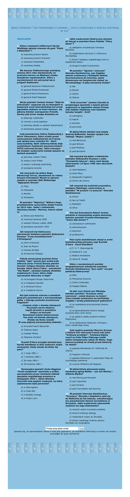 QUIZ LITERACKI "CZY PRZEMINĘŁO Z CZASEM... CZYLI LITERATURA Z WIELKĄ HISTORIĄ W TLE" REGULAMIN 12. Jakie wydarzenie historyczne stanowi oś intrygi w powieści Kena Folletta "Filary Ziemi"? 1. Którą z kampanii militarnych Karola Wielkiego opisuje chanson de gest "Pieśń o Rolandzie"? a) wyprawę przeciw Sasom b) wyprawę przeciw Frankom c) wyprawę hiszpańską a) zabójstwo arcybiskupa Tomasza Becketta b) małżeństwo Henryka II z Eleonorą Akwitańską c) śmierć następcy angielskiego tronu w katastrofie statku d) wyprawę włoską d) druga krucjata krzyżowców 2. We dworze Podkomorzego pamiętną wiosną 1812 roku stacjonowały (w przerwie marszu na Moskwę) sztaby dowódców napoleońskich. Który z wymienionych nie zatrzymał się w progach Soplicowa: 13. W powieści "Ogniem i mieczem" Henryka Sienkiewicza, pan Zagłoba odwozi uratowaną z Rozłogów Helenę Kurcewiczównę do twierdzy, gdzie dziewczyna ma bezpiecznie czekać na Skrzetuskiego. O jaką warownię chodzi? a) generał Kazimierz Małachowski a) Bar b) generał Michał Grabowski b) Brześć c) generał Karol Kniaziewicz c) Łubnie d) generał Józef Zajączek d) Zbaraż 3. Akcja powieści Jamesa Jonesa "Stąd do wieczności" rozgrywa się na Hawajach w koszarach armii amerykańskiej tuż przed japońskim atakiem na Pearl Harbour. Jej główny bohater szeregowiec Prewitt, karany jest przez swego dowódcę za: 14. "Król szczurów" Jamesa Clavella to przejmująca opowieść o losach jeńców wojennych w japońskim obozie Changi. Jaki stopień wojskowy nosi tytułowy bohater książki - Król? a) szeregowy a) dezercję z jednostki b) kapral b) romans z żoną kapitana c) sierżant c) odmowę udziału w walkach bokserskich d) porucznik d) śmiertelne pobicie kolegi 15. W jakiej bitwie odniósł ranę książę 4. Cykl powieściowy Haliny Popławskiej o Andrzej Bołkoński, bohater epopei Lwa Afrze Tukanowicz, która ucieka przed Tołstoja "Wojna i pokój"? wymuszonym małżeństwem do Francji, a) nad Berezyną pod opiekę żony Ludwika XV - Marii Leszczyńskiej, obok ciekawej fabuły daje b) pod Wilnem czytelnikowi możliwość poznania historii c) pod Moskwą XVIII-wiecznej Europy. Jakie znaczące dla dziejów wydarzenie zostało opisane na d) pod Borodino kartach powieści? a) pierwszy rozbiór Polski b) wojna o tron Polski c) wojna o sukcesję austriacką 16. Jak nazywał się jeden z bohaterów powieści Aleksandra Dumasa z cyklu "Pamiętniki lekarza", który miał okazję obserwować 14 lipca 1789 roku zburzenie Bastylii? d) kampania turecka a) Józef Balsamo 5. Jak nazywała się stolica Boga Słonecznej Tarczy, zbudowana na rozkaz faraona Echnatona? Miasto to opisane zostało w powieści Miki Waltariego "Egipcjanin Sinuhe" b) Anioł Pitou c) Alessandro Caglistro d) Olivier de Charny 17. Jak nazywał się sudański przywódca, następca Mahdiego, uwieczniony w powieści "W pustyni i w puszczy" Henryka Sienkiewicza: a) Teby b) Heliopolis c) Memfis a) Smain d) Achetaton b) Nur-el-Tadhil 6. W powieści "Nędznicy" Wiktora Hugo przedstawione są burzliwe dzieje Francji po 1815 roku. Jeden z bohaterów, ukochany Kozety - Mariusz, bierze udział w: a) bitwie pod Waterloo b) rewolucji lipcowej 1830 c) Abdullahi d) Idrys 18. Kim był Amerykanin Robert Jordan, ochotnik w hiszpańskiej wojnie domowej, bohater powieści Ernesta Hemingwaya "Komu bije dzwon"? c) walkach Wiosny Ludów 1848 a) zawodowym żołnierzem d) powstaniu paryskim 1832 b) dziennikarzem c) lekarzem 7. Jak nazywał się historyczny pierwowzór bohatera powieści Aleksandra d) profesorem Dumasa "Trzej muszkieterowie" d'Artangana? 19. Pod czyim dowództwem służył w armii konfederackiej pierwszy mąż Scarlett a) Henri d'Aramitz O'Hara - Karol Hamilton? b) Jean du Peyrer a) P. G. T. Beauregarda c) Charles de Batz b) Roberta E. Lee d) Armand de Sillegue c) Wade'a Hamptona 8. Fabuła sensacyjnej powieści Kena Folletta "Igła" osnuta jest wokół prób odkrycia przez Trzecią Rzeszę planów inwazji i miejsca desantu aliantów na Europę. Gdzie Henry Faber - pseudonim "Die Nadel", odnalazł makiety obiektów wojskowych i broni, które miały wprowadzić Niemców w błąd? d) Johna B. Hooda 20. Który z wymienionych poniżej drugoplanowych bohaterów powieści Henryka Sienkiewicza "Qvo vadis" nie jest postacią historyczną? a) Akte a) na brzegach Wyspy Sztormów b) Pomponia Grecyna b) w hrabstwie Norfolk c) Chilon Chilonides c) w okolicach Dover d) Poppea Sabina d) w hrabstwie Devon 9. Kto jest autorem wiersza o samotnie ginących powstańcach z warszawskiego getta, z którego pochodzi przytoczony fragment? ...Czasem wiatr z domów płonących Przynosił czarne latawce, Łapali skrawki w powietrzu Jadący na karuzeli. Rozwiewał suknie dziewczynom Ten wiatr od domów płonących, Śmiały się tłumy wesołe W czas pięknej warszawskiej niedzieli... a) Krzysztof Kamil Baczyński b) Tadeusz Gajcy c) Czesław Miłosz d) Zbigniew Herbert 10. Scarlet O'Hara przyjęła oświadczyny Karola Hamiltona w dniu wybuchu wojny secesyjnej. Kiedy doszło do ślubu tej pary? 21. Za jaki czyn Erlend syn Mikołaja, bohater powieści "Krystyna córka Lawransa", został skazany na śmierć (kara została zamieniona na konfiskatę majątku i utratę piastowanych godności)? a) za uwiedzenie przyrzeczonej innemu dziewicy b) za spowodowanie śmierci swojej kochanki Eliny córki Orma c) za udział w spisku przeciw królowi Magnusowi d) za okaleczenie Haakona z Gimsaru, który uwiódł jego córkę 22. Cykl sześciu powieści Maurice Druona o historii XIV-wiecznej Francji nosi tytuł "Królowie przeklęci". Tytułową klątwę rzucił na króla Filipa Pięknego wielki mistrz templariuszy Jakub de Molay. Kogo jeszcze przeklął na chwilę przed śmiercią na stosie? a) papieża Benedykta XI i Gotfryda de Charny a) 1 maja 1861 r. b) Hugona z Pairaud b) 1 kwietnia 1862 r. c) papieża Klemensa V i potomków Filipa do trzynastego pokolenia c) 30 maja 1862 r. d) 30 kwietnia 1861 r. d)
