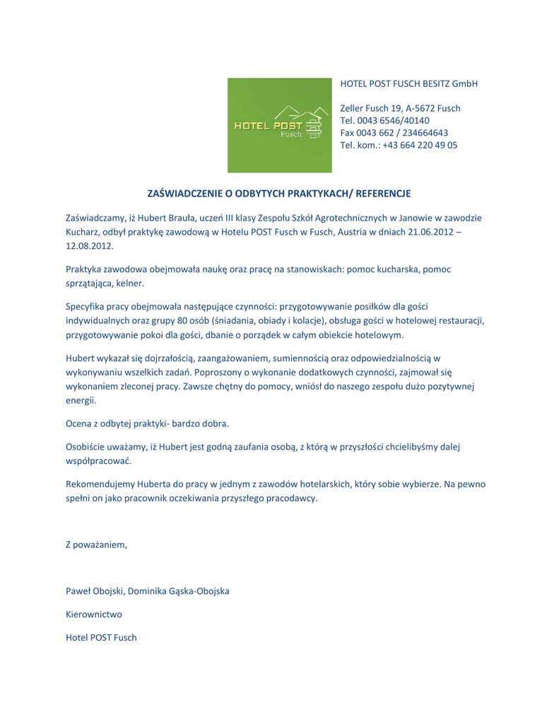 HOTEL POST FUSCH BESITZ GmbH Zeller Fusch 19, A-5672 Fusch Tel. 0043 6546/40140 Fax 0043 662 / 234664643 Tel. kom.: +43 664 220 49 05 ZAŚWIADCZENIE O ODBYTYCH PRAKTYKACH/ REFERENCJE Zaświadczamy, iż Hubert Brauła, uczeń III klasy Zespołu Szkół Agrotechnicznych w Janowie w zawodzie Kucharz, odbył praktykę zawodową w Hotelu POST Fusch w Fusch, Austria w dniach 21.06.2012 – 12.08.2012. Praktyka zawodowa obejmowała naukę oraz pracę na stanowiskach: pomoc kucharska, pomoc sprzątająca, kelner. Specyfika pracy obejmowała następujące czynności: przygotowywanie posiłków dla gości indywidualnych oraz grupy 80 osób (śniadania, obiady i kolacje), obsługa gości w hotelowej restauracji, przygotowywanie pokoi dla gości, dbanie o porządek w całym obiekcie hotelowym. Hubert wykazał się dojrzałością, zaangażowaniem, sumiennością oraz odpowiedzialnością w wykonywaniu wszelkich zadań. Poproszony o wykonanie dodatkowych czynności, zajmował się wykonaniem zleconej pracy. Zawsze chętny do pomocy, wniósł do naszego zespołu dużo pozytywnej energii. Ocena z odbytej praktyki- bardzo dobra. Osobiście uważamy, iż Hubert jest godną zaufania osobą, z którą w przyszłości chcielibyśmy dalej współpracować. Rekomendujemy Huberta do pracy w jednym z zawodów hotelarskich, który sobie wybierze. Na pewno spełni on jako pracownik oczekiwania przyszłego pracodawcy. Z poważaniem, Paweł Obojski, Dominika Gąska-Obojska Kierownictwo Hotel POST Fusch