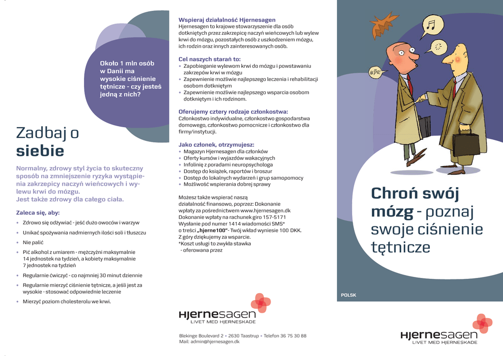 Wspieraj działalność Hjernesagen Hjernesagen to krajowe stowarzyszenie dla osób dotkniętych przez zakrzepicę naczyń wieńcowych lub wylew krwi do mózgu, pozostałych osób z uszkodzeniem mózgu, ich rodzin oraz innych zainteresowanych osób. Około 1 mln osób w Danii ma wysokie ciśnienie tętnicze - czy jesteś jedną z nich? Cel naszych starań to: • Zapobieganie wylewom krwi do mózgu i powstawaniu zakrzepów krwi w mózgu • Zapewnienie możliwie najlepszego leczenia i rehabilitacji osobom dotkniętym • Zapewnienie możliwie najlepszego wsparcia osobom dotkniętym i ich rodzinom. Oferujemy cztery rodzaje członkostwa: Zadbaj o siebie Normalny, zdrowy styl życia to skuteczny sposób na zmniejszenie ryzyka wystąpienia zakrzepicy naczyń wieńcowych i wylewu krwi do mózgu. Jest także zdrowy dla całego ciała. Zaleca się, aby: • Zdrowo się odżywiać - jeść dużo owoców i warzyw • Unikać spożywania nadmiernych ilości soli i tłuszczu • Nie palić • Pić alkohol z umiarem - mężczyźni maksymalnie 14 jednostek na tydzień, a kobiety maksymalnie 7 jednostek na tydzień Członkostwo indywidualne, członkostwo gospodarstwa domowego, członkostwo pomocnicze i członkostwo dla firmy/instytucji. Jako członek, otrzymujesz: • • • • • • Magazyn Hjernesagen dla członków Oferty kursów i wyjazdów wakacyjnych Infolinię z poradami neuropsychologa Dostęp do książek, raportów i broszur Dostęp do lokalnych wydarzeń i grup samopomocy Możliwość wspierania dobrej sprawy Chroń swój mózg - poznaj swoje ciśnienie tętnicze Możesz także wspierać naszą działalność finansowo, poprzez: Dokonanie wpłaty za pośrednictwem www.hjernesagen.dk Dokonanie wpłaty na rachunek giro 157-5171 Wysłanie pod numer 1414 wiadomości SMS* o treści „hjerne100”- Twój wkład wyniesie 100 DKK. Z góry dziękujemy za wsparcie. *Koszt usługi to zwykła stawka - oferowana przez • Regularnie ćwiczyć - co najmniej 30 minut dziennie • Regularnie mierzyć ciśnienie tętnicze, a jeśli jest za wysokie - stosować odpowiednie leczenie POLSK • Mierzyć poziom cholesterolu we krwi. Blekinge Boulevard 2 • 2630 Taastrup • Telefon 36 75 30 88 Mail: [email protected] Zakrzepica naczyń wieńcowych lub wylew krwi do mózgu dotyka co 7 osobę Ciśnienie tętnicze ma duże znaczenie dla zdrowia To ważne, aby znać swoje ciśnienie tętnicze, ponieważ wysokie ciśnienie tętnicze jest najważniejszym czynnikiem ryzyka wystąpienia zakrzepów krwi i wylewów krwi do mózgu Ryzyko zachorowania jest aż cztery razy większe, gdy ciśnienie tętnicze jest zbyt wysokie. Wysokie ciśnienie tętnicze może również prowadzić do szybkiego zwężania światła żył. Miażdżyca jest główną przyczyną większości chorób serca i układu krążenia - wysokie ciśnienie tętnicze może uszkodzić także nerki. Co 7 osobę w pewnym momencie życia spotka zakrzepica naczyń wieńcowych lub wylew krwi do mózgu. Wystąpienie zakrzepicy naczyń wieńcowych lub wylewu krwi do mózgu często powoduje długofalowe skutki w postaci paraliżu jednej strony ciała, problemów z mową i innymi funkcjami językowymi, problemów z pamięcią i trudności z wysławianiem. Gdyby każda osoba z wysokim ciśnieniem tętniczym poddała się leczeniu, około połowy wszystkich przypadków prawdopodobnie można by uniknąć - dlatego należy znać swoje ciśnienie tętnicze. Co to jest ciśnienie tętnicze? Ciśnienie tętnicze jest to ciśnienie krwi wywierane na ścianki największych tętnic w momencie skurczu serca (ciśnienie skurczowe) oraz w momencie rozkurczu serca (ciśnienie rozkurczowe). Wartość ciśnienia tętniczego podaje się za pomocą dwóch liczb - na przykład 140/90 mm Hg (milimetrów słupa rtęci). Ciśnienie nie jest takie samo przez cały dzień. Na przykład - rośnie podczas wysiłku, w przypadku podekscytowania itp. Dlatego ciśnienie tętnicze zawsze należy mierzyć w stanie spoczynku. Co to jest wysokie ciśnienie tętnicze? Jeśli ciśnienie tętnicze jest wyższe niż 140/90 mm Hg, oznacza to, masz wysokie ciśnienie. Te wartości graniczne dotyczą wszystkich osób dorosłych – bez względu na wiek i płeć. Jeśli chorujesz na cukrzycę lub choroby nerek, wartości te są niższe - lekarz wyda Ci odpowiednie zalecenia. Jak często należy sprawdzać ciśnienie tętnicze? Kto może mieć wysokie ciśnienie tętnicze? HjerneSagen zaleca, aby osoby dorosłe regularnie sprawdzały swoje ciśnienie. Można to zrobić u lekarza, w ośrodku zdrowia lub w domu. To, jak często powinieneś mierzyć ciśnienie tętnicze, zależy od Twojej sytuacji życiowej. Porozmawiaj na ten temat ze swoim lekarzem. Każdy może mieć wysokie ciśnienie tętnicze. Ale pewne czynniki zwiększają ryzyko. Na przykład: Jeśli chcesz mierzyć ciśnienie tętnicze w domu • Skłonność do występowania wysokiego ciśnienia tętniczego w rodzinie • Rodzinna skłonność do występowania zakrzepicy naczyń wieńcowych lub zakrzepów krwi w mózgu • Cukrzyca Jeśli chcesz mierzyć ciśnienie tętnicze w domu, ważne, żebyś nabył certyfikowany ciśnieniomierz z mankietem dopasowanym do Twojego ramienia. Na głównej stronie Hjernesagen - www.hjernesagen.dk - znajdziesz informacje na temat samodzielnego mierzenia ciśnienia tętniczego. Można tu również zakupić ciśnieniomierz z certyfikatem. • Choroby nerek oraz • Palenie • Otyłość • Duże spożycie alkoholu Jeśli ciśnienie tętnicze jest wyższe niż • Zbyt dużo soli w diecie 140/90 • Zbyt dużo tłuszczu w diecie • Za mało ćwiczeń fizycznych Należy pamiętać, że wysokiego ciśnienia tętniczego zazwyczaj się nie czuje. Dlatego ważne jest, aby sprawdzać ciśnienie u lekarza. oznacza to, masz wysokie ciśnienie.