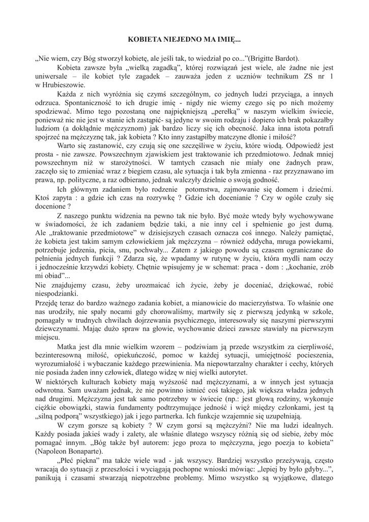 KOBIETA NIEJEDNO MA IMIĘ... „Nie wiem, czy Bóg stworzył kobietę, ale jeśli tak, to wiedział po co...”(Brigitte Bardot). Kobieta zawsze była „wielką zagadką”, której rozwiązań jest wiele, ale żadne nie jest uniwersale – ile kobiet tyle zagadek – zauważa jeden z uczniów technikum ZS nr 1 w Hrubieszowie. Każda z nich wyróżnia się czymś szczególnym, co jednych ludzi przyciąga, a innych odrzuca. Spontaniczność to ich drugie imię - nigdy nie wiemy czego się po nich możemy spodziewać. Mimo tego pozostaną one najpiękniejszą „perełką” w naszym wielkim świecie, ponieważ nic nie jest w stanie ich zastąpić- są jedyne w swoim rodzaju i dopiero ich brak pokazałby ludziom (a dokłądnie mężczyznom) jak bardzo liczy się ich obecność. Jaka inna istota potrafi spojrzeć na mężczyznę tak, jak kobieta ? Kto inny zastąpiłby matczyne dłonie i miłość? Warto się zastanowić, czy czują się one szczęśliwe w życiu, które wiodą. Odpowiedź jest prosta - nie zawsze. Powszechnym zjawiskiem jest traktowanie ich przedmiotowo. Jednak mniej powszechnym niż w starożytności. W tamtych czasach nie miały one żadnych praw, zaczęło się to zmieniać wraz z biegiem czasu, ale sytuacja i tak była zmienna - raz przyznawano im prawa, np. polityczne, a raz odbierano, jednak walczyły dzielnie o swoją godność. Ich głównym zadaniem było rodzenie potomstwa, zajmowanie się domem i dziećmi. Ktoś zapyta : a gdzie ich czas na rozrywkę ? Gdzie ich docenianie ? Czy w ogóle czuły się docenione ? Z naszego punktu widzenia na pewno tak nie było. Być może wtedy były wychowywane w świadomości, że ich zadaniem będzie taki, a nie inny cel i spełnienie go jest dumą. Ale „traktowanie przedmiotowe” w dzisiejszych czasach oznacza coś innego. Należy pamiętać, że kobieta jest takim samym człowiekiem jak mężczyzna – również oddycha, mruga powiekami, potrzebuje jedzenia, picia, snu, pochwały... Zatem z jakiego powodu są czasem ograniczane do pełnienia jednych funkcji ? Zdarza się, że wpadamy w rutynę w życiu, która mydli nam oczy i jednocześnie krzywdzi kobiety. Chętnie wpisujemy je w schemat: praca - dom : „kochanie, zrób mi obiad”... Nie znajdujemy czasu, żeby urozmaicać ich życie, żeby je doceniać, dziękować, robić niespodzianki. Przejdę teraz do bardzo ważnego zadania kobiet, a mianowicie do macierzyństwa. To właśnie one nas urodziły, nie spały nocami gdy chorowaliśmy, martwiły się z pierwszą jedynką w szkole, pomagały w trudnych chwilach dojrzewania psychicznego, interesowały się naszymi pierwszymi dziewczynami. Mając dużo spraw na głowie, wychowanie dzieci zawsze stawiały na pierwszym miejscu. Matka jest dla mnie wielkim wzorem – podziwiam ją przede wszystkim za cierpliwość, bezinteresowną miłość, opiekuńczość, pomoc w każdej sytuacji, umiejętność pocieszenia, wyrozumiałość i wybaczanie każdego przewinienia. Ma niepowtarzalny charakter i cechy, których nie posiada żaden inny człowiek, dlatego widzę w niej wielki autorytet. W niektórych kulturach kobiety mają wyższość nad mężczyznami, a w innych jest sytuacja odwrotna. Sam uważam jednak, że nie powinno istnieć coś takiego, jak większa władza jednych nad drugimi. Mężczyzna jest tak samo potrzebny w świecie (np.: jest głową rodziny, wykonuje ciężkie obowiązki, stawia fundamenty podtrzymujące jedność i więź między członkami, jest tą „silną podporą” wszystkiego) jak i jego partnerka. Ich funkcje wzajemnie się uzupełniają. W czym gorsze są kobiety ? W czym gorsi są mężczyźni? Nie ma ludzi idealnych. Każdy posiada jakieś wady i zalety, ale właśnie dlatego wszyscy różnią się od siebie, żeby móc pomagać innym. „Bóg także był autorem: jego proza to mężczyzna, jego poezja to kobieta” (Napoleon Bonaparte). „Płeć piękna” ma także wiele wad - jak wszyscy. Bardziej wszystko przeżywają, często wracają do sytuacji z przeszłości i wyciągają pochopne wnioski mówiąc: „lepiej by było gdyby...”, panikują i czasami stwarzają niepotrzebne problemy. Mimo wszystko są wyjątkowe, dlatego nazwano je równie wyjątkowo – KOBIETY. Wszystkim kobietom – małym i większym, matkom, siostrom ( dziękuję Ci, Jowitko), dziewczynom, żonom, koleżankom, córkom, ukochanym życzymy wszystkiego dobrego, oby każdy dzień stał się wyjątkowy i był Waszym swoistym świętem. Adrian Starzec ( technikum) Zespół Szkół nr 1 w Hrubieszowie