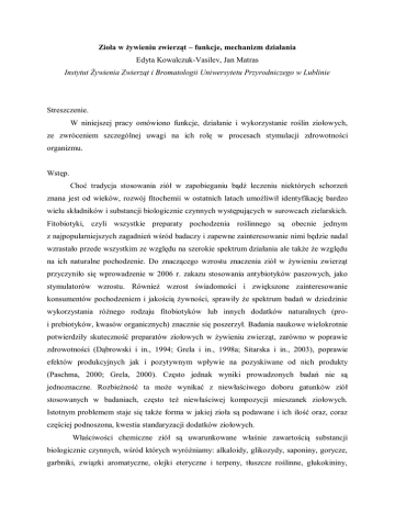 Zioła w żywieniu zwierząt – funkcje, mechanizm działania Edyta Kowalczuk-Vasilev, Jan Matras Instytut Żywienia Zwierząt i Bromatologii Uniwersytetu Przyrodniczego w Lublinie Streszczenie. W niniejszej pracy omówiono funkcje, działanie i wykorzystanie roślin ziołowych, ze zwróceniem szczególnej uwagi na ich rolę w procesach stymulacji zdrowotności organizmu. Wstęp. Choć tradycja stosowania ziół w zapobieganiu bądź leczeniu niektórych schorzeń znana jest od wieków, rozwój fitochemii w ostatnich latach umożliwił identyfikację bardzo wielu składników i substancji biologicznie czynnych występujących w surowcach zielarskich. Fitobiotyki, czyli wszystkie preparaty pochodzenia roślinnego są obecnie jednym z najpopularniejszych zagadnień wśród badaczy i zapewne zainteresowanie nimi będzie nadal wzrastało przede wszystkim ze względu na szerokie spektrum działania ale także że względu na ich naturalne pochodzenie. Do znaczącego wzrostu znaczenia ziół w żywieniu zwierząt przyczyniło się wprowadzenie w 2006 r. zakazu stosowania antybiotyków paszowych, jako stymulatorów wzrostu. Również wzrost świadomości i zwiększone zainteresowanie konsumentów pochodzeniem i jakością żywności, sprawiły że spektrum badań w dziedzinie wykorzystania różnego rodzaju fitobiotyków lub innych dodatków naturalnych (proi prebiotyków, kwasów organicznych) znacznie się poszerzył. Badania naukowe wielokrotnie potwierdziły skuteczność preparatów ziołowych w żywieniu zwierząt, zarówno w poprawie zdrowotności (Dąbrowski i in., 1994; Grela i in., 1998a; Sitarska i in., 2003), poprawie efektów produkcyjnych jak i pozytywnym wpływie na pozyskiwane od nich produkty (Paschma, 2000; Grela, 2000). Często jednak wyniki prowadzonych badań nie są jednoznaczne. Rozbieżność ta może wynikać z niewłaściwego doboru gatunków ziół stosowanych w badaniach, często też niewłaściwej kompozycji mieszanek ziołowych. Istotnym problemem staje się także forma w jakiej zioła są podawane i ich ilość oraz, coraz częściej podnoszona, kwestia standaryzacji dodatków ziołowych. Właściwości chemiczne ziół są uwarunkowane właśnie zawartością substancji biologicznie czynnych, wśród których wyróżniamy: alkaloidy, glikozydy, saponiny, gorycze, garbniki, związki aromatyczne, olejki eteryczne i terpeny, tłuszcze roślinne, glukokininy, śluzy i fitoncydy. Są one produktami wtórnego metabolizmu roślin (Tabela 1). Występująca w roślinach leczniczych taka obfitość i różnorodność składników biologicznie czynnych wpływa na ich szeroki zakres oddziaływania w organizmie zwierząt (Tabela 2) (Grela i in., 1998b). Tabela 1. Najważniejsze substancje biologicznie czynne ziół (Anioł-Kwiatkowska, 1993; Sadowska, 2003; Grela i Klebaniuk, 2001) Substancja aktywna Alkaloidy Saponiny Glikozydy Flawonoidy Garbniki Olejki eteryczne Kwasy organiczne Pektyny i śluzy roślinne Gorycze Działanie niewielkie ich ilości mają działanie lecznicze: uśmierzające ból (morfina), łagodzenia kaszlu (kodeina), leczenia malarii (chinina), jako czynniki przeciwnowotworowe (taksol) drażnią błony śluzowe, obniżają napięcie naczyń krwionośnych jelit, zwiększają działalność wydzielniczą błony śluzowej oskrzeli – są środkami wykrztuśnymi; używane są jako środki moczopędne i dezynfekujące drogi moczowe w zależności od budowy chemicznej wykazują działanie: przeczyszczające, regulujące pracę mięśnia sercowego, przeciwutleniającą, czy wzmacniające ściany naczyń krwionośnych naturalne przeciwutleniacze; działają rozkurczowo na mięśnie gładkie przewodu pokarmowego i dróg żółciowych; mają właściwości przeciwzapalne mają właściwości ściągające: koagulują białka błony śluzowej oraz tkanek, tworząc warstwę izolacyjna i ochronną, wskutek czego zmniejsza się podrażnienie i ból; hamują także drobne krwawienia. Garbniki poprzez zmniejszenie przepuszczalności błon śluzowych mogą działać przeciwbiegunkowo. Mają też działanie antybakteryjne i przeciwzapalne; wewnętrznie garbniki stosuje się je w przypadkach nieżytu jelit, biegunki i schorzenia pęcherzyka żółciowego, a także jako antidotum na zatrucia alkaloidami roślinnymi. działanie żółciopędne, moczopędne, wykrztuśne, uspokajające, przeciwbakteryjne, dezynfekujące, pobudzające perystaltykę jelit, podnoszące walory smakowe uczestniczą aktywnie w przemianie materii, pobudzają gruczoły ślinowe, trzustkowe i żołądkowe, poprawiają trawienie przede wszystkim przy biegunkach i zaburzeniach układu trawiennego u zwierząt młodych ponieważ łagodzą one stany zapalne błon śluzowych drażniące komórki smakowe, pobudzające apetyt i zwiększające wydzielanie soku żołądkowego. W szeroko rozumianej fitoterapii istotne jest poznanie natury chemicznej wymienionych związków biologicznie czynnych, ich właściwości i kierunku oddziaływania na organizm oraz ustalenie dopuszczalnej i bezpiecznej dawki. Należy przy tym uwzględnić interakcje antagonistyczne i synergizm farmakologiczny jaki zachodzi między poszczególnymi składnikami czynnymi obecnymi w ziołach. W badaniach na zwierzętach udowodniono, że lepszy efekt uzyskuje się stosując mieszaninę z odpowiednio zestawionych ziół dla określonego gatunku zwierząt, wieku i kierunku produkcji niż przy wprowadzeniu pojedynczego zioła do dawki pokarmowej (Dąbrowski i in., 1994; Schleicher i in., 1996; Faruga i Pudyszak, 1999; Kraszewski i in., 2002; Czech i in., 2009). Stąd też w ziołach, a właściwie zawartych w nich substancjach biologicznie czynnych upatruje się następujących działań: możliwości nadania zapachu i smaku paszy atrakcyjnego dla zwierząt, regulacji funkcji trawiennych przewodu pokarmowego, ukierunkowania metabolizmu wewnątrz organizmu, wzmocnienia systemu immunologicznego ustroju, ograniczenia podatności na stres, dążeni