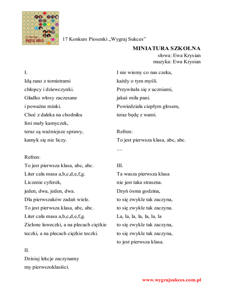 17 Konkurs Piosenki „Wygraj Sukces” MINIATURA SZKOLNA słowa: Ewa Krysian muzyka: Ewa Krysian I. I nie wiemy co nas czeka, Idą rano z tornistrami każdy o tym myśli. chłopcy i dziewczynki. Przywitała się z uczniami, Gładko włosy zaczesane jakaś miła pani. i poważne minki. Powiedziała ciepłym głosem, Choć z daleka na chodniku teraz będę z wami. lśni mały kamyczek, teraz są ważniejsze sprawy, Refren: kamyk się nie liczy. To jest pierwsza klasa, abc, abc. .... Refren: To jest pierwsza klasa, abc, abc. III. Liter cała masa a,b,c,d,e,f,g. Ta wasza pierwsza klasa Liczenie cyferek, nie jest taka straszna. jeden, dwa, jeden, dwa. Dzyń ósma godzina, Dla pierwszaków zadań wiele. to się zwykle tak zaczyna, To jest pierwsza klasa, abc, abc. to się zwykle tak zaczyna. Liter cała masa a,b,c,d,e,f,g. La, la, la, la, la, la, la Zielone ławeczki, a na plecach ciężkie to się zwykle tak zaczyna, teczki, a na plecach ciężkie teczki. to się zwykle tak zaczyna, to jest pierwsza klasa. II. Dzisiaj lekcje zaczynamy my pierwszoklasiści. www.wygrajsukces.com.pl