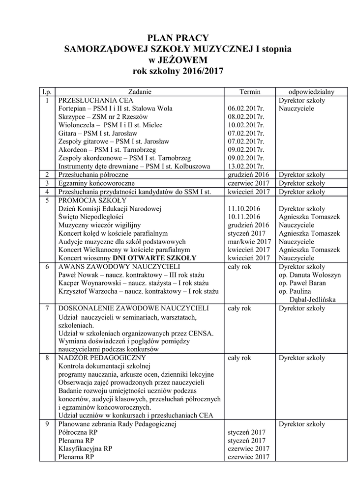 PLAN PRACY SAMORZĄDOWEJ SZKOŁY MUZYCZNEJ I stopnia w JEŻOWEM rok szkolny 2016/2017 l.p. Zadanie 1 PRZESŁUCHANIA CEA Fortepian – PSM I i II st. Stalowa Wola Skrzypce – ZSM nr 2 Rzeszów Wiolonczela – PSM I i II st. Mielec Gitara – PSM I st. Jarosław Zespoły gitarowe – PSM I st. Jarosław Akordeon – PSM I st. Tarnobrzeg Zespoły akordeonowe – PSM I st. Tarnobrzeg Instrumenty dęte drewniane – PSM I st. Kolbuszowa 2 Przesłuchania półroczne 3 Egzaminy końcoworoczne 4 Przesłuchania przydatności kandydatów do SSM I st. 5 PROMOCJA SZKOŁY Dzień Komisji Edukacji Narodowej Święto Niepodległości Muzyczny wieczór wigilijny Koncert kolęd w kościele parafialnym Audycje muzyczne dla szkół podstawowych Koncert Wielkanocny w kościele parafialnym Koncert wiosenny DNI OTWARTE SZKOŁY 6 AWANS ZAWODOWY NAUCZYCIELI Paweł Nowak – naucz. kontraktowy – III rok stażu Kacper Woynarowski – naucz. stażysta – I rok stażu Krzysztof Warzocha – naucz. kontraktowy – I rok stażu 7 8 9 DOSKONALENIE ZAWODOWE NAUCZYCIELI Udział nauczycieli w seminariach, warsztatach, szkoleniach. Udział w szkoleniach organizowanych przez CENSA. Wymiana doświadczeń i poglądów pomiędzy nauczycielami podczas konkursów NADZÓR PEDAGOGICZNY Kontrola dokumentacji szkolnej programy nauczania, arkusze ocen, dzienniki lekcyjne Obserwacja zajęć prowadzonych przez nauczycieli Badanie rozwoju umiejętności uczniów podczas koncertów, audycji klasowych, przesłuchań półrocznych i egzaminów końcoworocznych. Udział uczniów w konkursach i przesłuchaniach CEA Planowane zebrania Rady Pedagogicznej Półroczna RP Plenarna RP Klasyfikacyjna RP Plenarna RP Termin 06.02.2017r. 08.02.2017r. 10.02.2017r. 07.02.2017r. 07.02.2017r. 09.02.2017r. 09.02.2017r. 13.02.2017r. grudzień 2016 czerwiec 2017 kwiecień 2017 11.10.2016 10.11.2016 grudzień 2016 styczeń 2017 mar/kwie 2017 kwiecień 2017 kwiecień 2017 cały rok odpowiedzialny Dyrektor szkoły Nauczyciele Dyrektor szkoły Dyrektor szkoły Dyrektor szkoły cały rok Dyrektor szkoły Agnieszka Tomaszek Nauczyciele Agnieszka Tomaszek Nauczyciele Agnieszka Tomaszek Nauczyciele Dyrektor szkoły op. Danuta Woloszyn op. Paweł Baran op. Paulina Dąbal-Jedlińska Dyrektor szkoły cały rok Dyrektor szkoły Dyrektor szkoły styczeń 2017 styczeń 2017 czerwiec 2017 czerwiec 2017