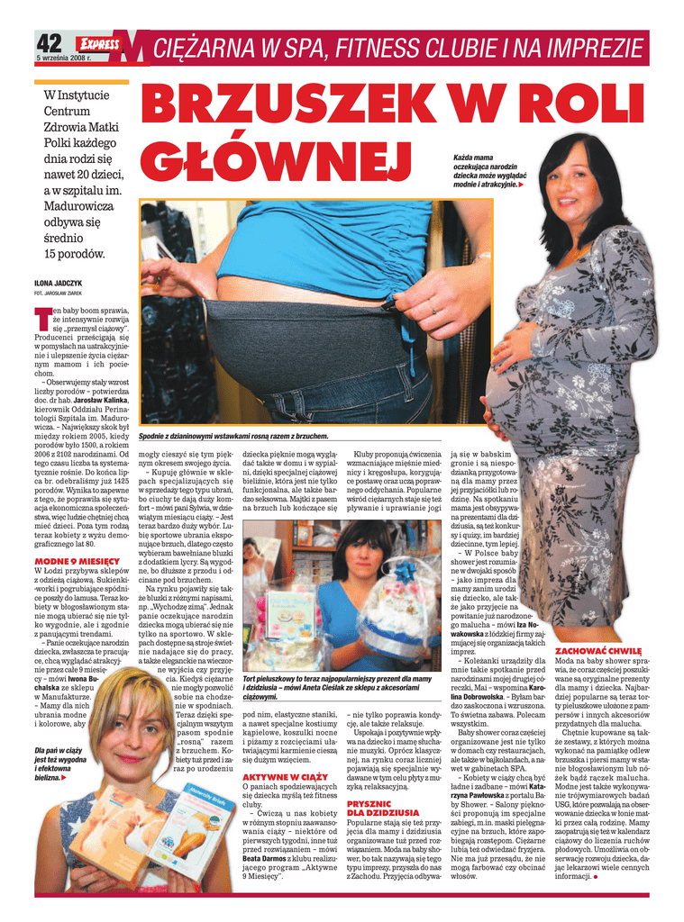 42 5 września 2008 r. W Instytucie Centrum Zdrowia Matki Polki każdego dnia rodzi się nawet 20 dzieci, a w szpitalu im. Madurowicza odbywa się średnio 15 porodów. CIĘŻARNA W SPA, FITNESS CLUBIE I NA IMPREZIE BRZUSZEK W ROLI GŁÓWNEJ Każda mama oczekująca narodzin dziecka może wyglądać modnie i atrakcyjnie. x ILONA JADCZYK FOT. JAROSŁAW ZIAREK T en baby boom sprawia, że intensywnie rozwija się „przemysł ciążowy”. Producenci prześcigają się w pomysłach na uatrakcyjnienie i ulepszenie życia ciężarnym mamom i ich pociechom. – Obserwujemy stały wzrost liczby porodów – potwierdza doc. dr hab. Jarosław Kalinka, kierownik Oddziału Perinatologii Szpitala im. Madurowicza. – Największy skok był między rokiem 2005, kiedy porodów było 1500, a rokiem 2006 z 2102 narodzinami. Od tego czasu liczba ta systematycznie rośnie. Do końca lipca br. odebraliśmy już 1425 porodów. Wynika to zapewne z tego, że poprawiła się sytuacja ekonomiczna społeczeństwa, więc ludzie chętniej chcą mieć dzieci. Poza tym rodzą teraz kobiety z wyżu demograficznego lat 80. MODNE 9 MIESIĘCY W Łodzi przybywa sklepów z odzieżą ciążową. Sukienki-worki i pogrubiające spódnice poszły do lamusa. Teraz kobiety w błogosławionym stanie mogą ubierać się nie tylko wygodnie, ale i zgodnie z panującymi trendami. – Panie oczekujące narodzin dziecka, zwłaszcza te pracujące, chcą wyglądać atrakcyjnie przez całe 9 miesięcy – mówi Iwona Buchalska ze sklepu w Manufakturze. – Mamy dla nich ubrania modne i kolorowe, aby Dla pań w ciąży jest też wygodna i efektowna bielizna. x Spodnie z dzianinowymi wstawkami rosną razem z brzuchem. mogły cieszyć się tym pięknym okresem swojego życia. – Kupuję głównie w sklepach specjalizujących się w sprzedaży tego typu ubrań, bo ciuchy te dają duży komfort – mówi pani Sylwia, w dziewiątym miesiącu ciąży. – Jest teraz bardzo duży wybór. Lubię sportowe ubrania eksponujące brzuch, dlatego często wybieram bawełniane bluzki z dodatkiem lycry. Są wygodne, bo dłuższe z przodu i odcinane pod brzuchem. Na rynku pojawiły się także bluzki z różnymi napisami, np. „Wychodzę zimą”. Jednak panie oczekujące narodzin dziecka mogą ubierać się nie tylko na sportowo. W sklepach dostępne są stroje świetnie nadające się do pracy, a także eleganckie na wieczorne wyjścia czy przyjęcia. Kiedyś ciężarne nie mogły pozwolić sobie na chodzenie w spodniach. Teraz dzięki specjalnym wszytym pasom spodnie „rosną” razem z brzuchem. Kobiety tuż przed i zaraz po urodzeniu dziecka pięknie mogą wyglądać także w domu i w sypialni, dzięki specjalnej ciążowej bieliźnie, która jest nie tylko funkcjonalna, ale także bardzo seksowna. Majtki z pasem na brzuch lub kończące się Kluby proponują ćwiczenia wzmacniające mięśnie miednicy i kręgosłupa, korygujące postawę oraz uczą poprawnego oddychania. Popularne wśród ciężarnych staje się też pływanie i uprawianie jogi Tort pieluszkowy to teraz najpopularniejszy prezent dla mamy i dzidziusia – mówi Aneta Cieślak ze sklepu z akcesoriami ciążowymi. pod nim, elastyczne staniki, a nawet specjalne kostiumy kąpielowe, koszulki nocne i piżamy z rozcięciami ułatwiającymi karmienie cieszą się dużym wzięciem. AKTYWNE W CIĄŻY O paniach spodziewających się dziecka myślą też fitness cluby. – Ćwiczą u nas kobiety w różnym stopniu zaawansowania ciąży – niektóre od pierwszych tygodni, inne tuż przed rozwiązaniem – mówi Beata Darmos z klubu realizującego program „Aktywne 9 Miesięcy”. – nie tylko poprawia kondycję, ale także relaksuje. Uspokaja i pozytywnie wpływa na dziecko i mamę słuchanie muzyki. Oprócz klasycznej, na rynku coraz liczniej pojawiają się specjalnie wydawane w tym celu płyty z muzyką relaksacyjną. PRYSZNIC DLA DZIDZIUSIA Popularne stają się też przyjęcia dla mamy i dzidziusia organizowane tuż przed rozwiązaniem. Moda na baby shower, bo tak nazywają się tego typu imprezy, przyszła do nas z Zachodu. Przyjęcia odbywa- ją się w babskim gronie i są niespodzianką przygotowaną dla mamy przez jej przyjaciółki lub rodzinę. Na spotkaniu mama jest obsypywana prezentami dla dzidziusia, są też konkursy i quizy, im bardziej dziecinne, tym lepiej. – W Polsce baby shower jest rozumiane w dwojaki sposób – jako impreza dla mamy zanim urodzi się dziecko, ale także jako przyjęcie na powitanie już narodzonego malucha – mówi Iza Nowakowska z łódzkiej firmy zajmującej się organizacją takich imprez. – Koleżanki urządziły dla mnie takie spotkanie przed narodzinami mojej drugiej córeczki, Mai – wspomina Karolina Dobrowolska. – Byłam bardzo zaskoczona i wzruszona. To świetna zabawa. Polecam wszystkim. Baby shower coraz częściej organizowane jest nie tylko w domach czy restauracjach, ale także w bajkolandach, a nawet w gabinetach SPA. – Kobiety w ciąży chcą być ładne i zadbane – mówi Katarzyna Pawłowska z portalu Baby Shower. – Salony piękności proponują im specjalne zabiegi, m.in. maski pielęgnacyjne na brzuch, które zapobiegają rozstępom. Ciężarne lubią też odwiedzać fryzjera. Nie ma już przesądu, że nie mogą farbować czy obcinać włosów. ZACHOWAĆ CHWILĘ Moda na baby shower sprawia, że coraz częściej poszukiwane są oryginalne prezenty dla mamy i dziecka. Najbardziej popularne są teraz torty pieluszkowe ułożone z pampersów i innych akcesoriów przydatnych dla malucha. Chętnie kupowane są także zestawy, z których można wykonać na pamiątkę odlew brzuszka i piersi mamy w stanie błogosławionym lub nóżek bądź rączek malucha. Modne jest także wykonywanie trójwymiarowych badań USG, które pozwalają na obserwowanie dziecka w łonie matki przez całą rodzinę. Mamy zaopatrują się też w kalendarz ciążowy do liczenia ruchów płodowych. Umożliwia on obserwację rozwoju dziecka, dając lek