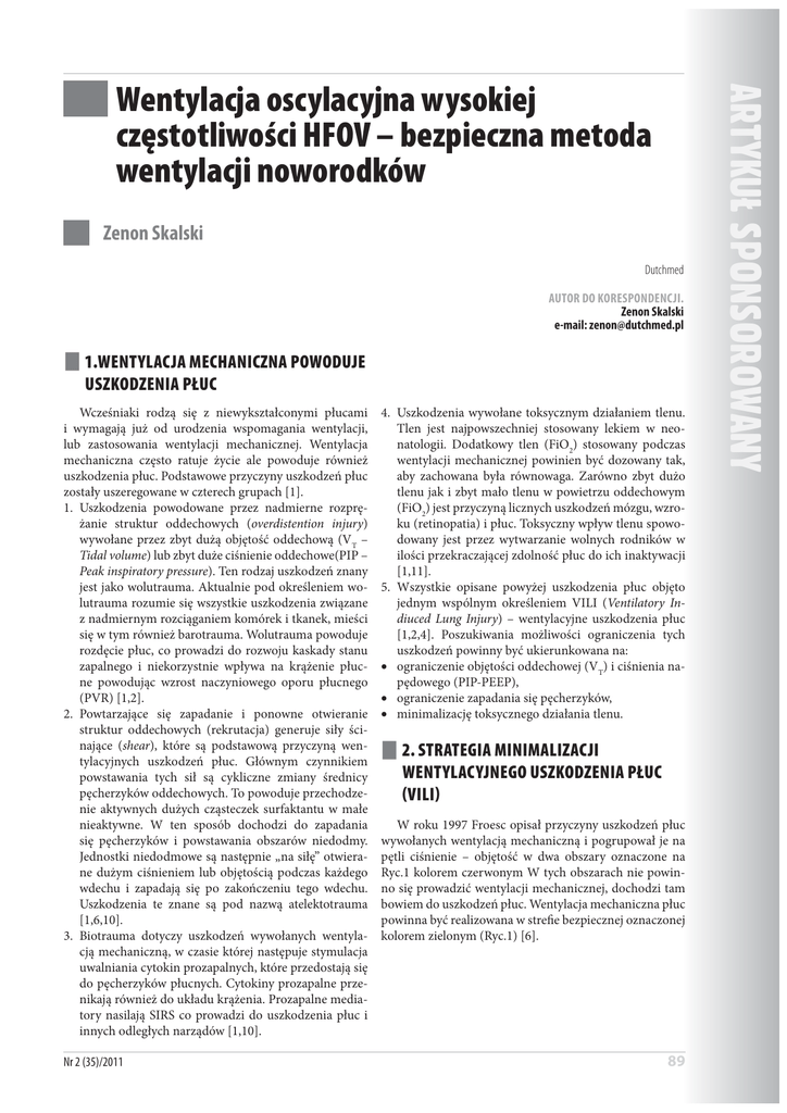 Zenon Skalski Dutchmed AUTOR DO KORESPONDENCJI. Zenon Skalski e-mail: [email protected] 1.WENTYLACJA MECHANICZNA POWODUJE USZKODZENIA PŁUC Wcześniaki rodzą się z niewykształconymi płucami i wymagają już od urodzenia wspomagania wentylacji, lub zastosowania wentylacji mechanicznej. Wentylacja mechaniczna często ratuje życie ale powoduje również uszkodzenia płuc. Podstawowe przyczyny uszkodzeń płuc zostały uszeregowane w czterech grupach [1]. 1. Uszkodzenia powodowane przez nadmierne rozprężanie struktur oddechowych (overdistention injury) wywołane przez zbyt dużą objętość oddechową (VT – Tidal volume) lub zbyt duże ciśnienie oddechowe(PIP – Peak inspiratory pressure). Ten rodzaj uszkodzeń znany jest jako wolutrauma. Aktualnie pod określeniem wolutrauma rozumie się wszystkie uszkodzenia związane z nadmiernym rozciąganiem komórek i tkanek, mieści się w tym również barotrauma. Wolutrauma powoduje rozdęcie płuc, co prowadzi do rozwoju kaskady stanu zapalnego i niekorzystnie wpływa na krążenie płucne powodując wzrost naczyniowego oporu płucnego (PVR) [1,2]. 2. Powtarzające się zapadanie i ponowne otwieranie struktur oddechowych (rekrutacja) generuje siły ścinające (shear), które są podstawową przyczyną wentylacyjnych uszkodzeń płuc. Głównym czynnikiem powstawania tych sił są cykliczne zmiany średnicy pęcherzyków oddechowych. To powoduje przechodzenie aktywnych dużych cząsteczek surfaktantu w małe nieaktywne. W ten sposób dochodzi do zapadania się pęcherzyków i powstawania obszarów niedodmy. Jednostki niedodmowe są następnie „na siłę” otwierane dużym ciśnieniem lub objętością podczas każdego wdechu i zapadają się po zakończeniu tego wdechu. Uszkodzenia te znane są pod nazwą atelektotrauma [1,6,10]. 3. Biotrauma dotyczy uszkodzeń wywołanych wentylacją mechaniczną, w czasie której następuje stymulacja uwalniania cytokin prozapalnych, które przedostają się do pęcherzyków płucnych. Cytokiny prozapalne przenikają również do układu krążenia. Prozapalne mediatory nasilają SIRS co prowadzi do uszkodzenia płuc i innych odległych narządów [1,10]. Nr 2 (35)/2011 4. Uszkodzenia wywołane toksycznym działaniem tlenu. Tlen jest najpowszechniej stosowany lekiem w neonatologii. Dodatkowy tlen (FiO2) stosowany podczas wentylacji mechanicznej powinien być dozowany tak, aby zachowana była równowaga. Zarówno zbyt dużo tlenu jak i zbyt mało tlenu w powietrzu oddechowym (FiO2) jest przyczyną licznych uszkodzeń mózgu, wzroku (retinopatia) i płuc. Toksyczny wpływ tlenu spowodowany jest przez wytwarzanie wolnych rodników w ilości przekraczającej zdolność płuc do ich inaktywacji [1,11]. 5. Wszystkie opisane powyżej uszkodzenia płuc objęto jednym wspólnym określeniem VILI (Ventilatory Indiuced Lung Injury) – wentylacyjne uszkodzenia płuc [1,2,4]. Poszukiwania możliwości ograniczenia tych uszkodzeń powinny być ukierunkowana na: x ograniczenie objętości oddechowej (VT) i ciśnienia napędowego (PIP-PEEP), x ograniczenie zapadania się pęcherzyków, x minimalizację toksycznego działania tlenu. 2. STRATEGIA MINIMALIZACJI WENTYLACYJNEGO USZKODZENIA PŁUC VILI W roku 1997 Froesc opisał przyczyny uszkodzeń płuc wywołanych wentylacją mechaniczną i pogrupował je na pętli ciśnienie – objętość w dwa obszary oznaczone na Ryc.1 kolorem czerwonym W tych obszarach nie powinno się prowadzić wentylacji mechanicznej, dochodzi tam bowiem do uszkodzeń płuc. Wentylacja mechaniczna płuc powinna być realizowana w strefie bezpiecznej oznaczonej kolorem zielonym (Ryc.1) [6]. 89 $57<.863216252:$1< Wentylacja oscylacyjna wysokiej częstotliwości HFOV – bezpieczna metoda wentylacji noworodków $57<.863216252:$1< Wentylacja oscylacyjna wysokiej częstotliwości HFOV bezpieczna metoda wentylacji noworodków Wentylacja agodna Wentylacja konwencjonalna P FRC unikanie nadmiernego utrzymuje puca rozprania, utrzymuje otwarte FRC Objto oddechowa VT<VD f = 3-15 Hz f = 180-900 1/min aktywny wdech i wydech to roprania – – – – to Nara 40 40 30 30 O HF O b j 10 t o 20 10 bezpieczna – – – – – CPAP – *+-. /8 p9. 20 Objto (mL) ! " # $ ów % & ' p Oddech spontaniczny po zastosowaniu CPAP C= 10 V – oddechowej 0 0 2 4 6 2,5 nienie 5 chu jak i wydechu. Efektem tego działania jest zwiększenie czynnościowej pojemności zalegającej (FRC) (Ryc.2), w wyniku tego następuje poprawa podatności płuc. Takie płuca łatwiej jest rozprężyć i wtłoczyć do nich potrzebną objętość gazów oddechowych dla zapewnienia wentylacji. 30 i Niedodmy 20 Wentylacja oscylacyjna HFOV 7,5 10 12,5 15 0 2 4 6 Oddech spontaniczny Wydech To samo cinienie inicjujce wdech P V P po zastosowaniu CPAP V C= = C P - stae Wdech P ty ! pówentylacji pów Wiksza podatno oznacza, e puca atwiej jest rozpry co skutkuje zwikszeniem objtoci oddechowej o V. Volutrauma ( pó to Ryc.1 Przebiegi wentylacji konwencjonalnej, łagodnej i oscylacyjnej a strefa bezpiecznej wentylacji Z lewej strony (Ryc.1) przedstawiono zmiany objętości płuc dla wentylacji konwencjonalnej, z prawej strony pokazane są zmiany objętości płuc dla wentylacji łagodnej i oscylacyjnej. Wentylacja konwencjonalna przebiega przez dolny i górny obszar , w którym dochodzi do uszkodzeń płuc. Wentylacja łagodna polega na ograniczeniu ciśnienia napędowego (PIP – PEEP) , pozwala to częściowo ograniczyć przebieg tej wentylacji w obszarach niebezpiecznych. Wentylacja oscylacyjna (HFOV) przebiega całkowicie w strefie bezpiecznej. W strefie bezpiecznej mieści się również wspomaganie oddechu i wentylacja nieinwazyjna metodą SiPAP. Analizując to co opisano powyżej można sformułować następujące zasady bezpiecznej wentylacji noworodka: x Rekrutować to znaczy otworzyć zapadnięte pęcherzyki płucne do wentylacji, co zwiększa powierzchnię wymiany gazowej, i skutkuje zwiększeniem FRC (CPAP i HFOV). x Stabilizować – trz
