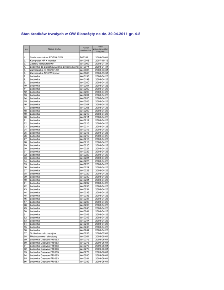 Stan środków trwałych w OW Sianożęty na dz. 30.04.2011 gr. 4-8 L.p. 1. 2. 3. 4. 5. 6. 7. 8. 9. 10. 11. 12. 13. 14. 15. 16. 17. 18. 19. 20. 21. 22. 23. 24. 25. 26. 27. 28. 29. 30. 31. 32. 33. 34. 35. 36. 37. 38. 39. 40. 41. 42. 43. 44. 45. 46. 47. 48. 49. 50. 51. 52. 53. 54. 55. 56. 57. 58. 59. 60. 61. 62. 63. 64. 65. 66. Nazwa środka Numer ewidencyjny Szafa mroźnicza EDESA 700L T45338 Komputer HP + monitor W40048 Zestaw komputerowy W40069 Lodówka do przechowywania próbek żywności W40071 Zamrażalka nr 246/001/08 W40085 Zamrażalka AFH Whirpool W40086 Lodówka W40198 Lodówka W40199 Lodówka W40200 Lodówka W40201 Lodówka W40202 Lodówka W40203 Lodówka W40204 Lodówka W40205 Lodówka W40206 Lodówka W40207 Lodówka W40208 Lodówka W40209 Lodówka W40210 Lodówka W40211 Lodówka W40212 Lodówka W40213 Lodówka W40214 Lodówka W40215 Lodówka W40216 Lodówka W40217 Lodówka W40218 Lodówka W40219 Lodówka W40220 Lodówka W40221 Lodówka W40222 Lodówka W40223 Lodówka W40224 Lodówka W40225 Lodówka W40226 Lodówka W40227 Lodówka W40228 Lodówka W40229 Lodówka W40230 Lodówka W40231 Lodówka W40232 Lodówka W40233 Lodówka W40234 Lodówka W40235 Lodówka W40236 Lodówka W40237 Lodówka W40238 Lodówka W40239 Lodówka W40240 Lodówka W40241 Lodówka W40242 Lodówka W40243 Lodówka W40244 Lodówka W40245 Lodówka W40246 Lodówka W40247 Schładzacz do napojów W40258 Młot udarowo - obrotowy W40261 Lodówka Daewoo FR 063 W40275 Lodówka Daewoo FR 063 W40276 Lodowka Daewoo FR 063 W40277 Lodówka Daewoo FR 063 W40278 Lodówka Daewoo FR 063 W40279 Lodówka Daewoo FR 063 W40280 Lodówka Daewoo FR 063 W40281 Lodówka Daewoo FR 063 W40282 Data przyjęcia na stan księgowy 2009-09-01 2007-10-15 2008-01-31 2008-01-31 2008-03-31 2008-03-31 2008-04-23 2008-04-23 2008-04-23 2008-04-23 2008-04-23 2008-04-23 2008-04-23 2008-04-23 2008-04-23 2008-04-23 2008-04-23 2008-04-23 2008-04-23 2008-04-23 2008-04-23 2008-04-23 2008-04-23 2008-04-23 2008-04-23 2008-04-23 2008-04-23 2008-04-23 2008-04-23 2008-04-23 2008-04-23 2008-04-23 2008-04-23 2008-04-23 2008-04-23 2008-04-23 2008-04-23 2008-04-23 2008-04-23 2008-04-23 2008-04-23 2008-04-23 2008-04-23 2008-04-23 2008-04-23 2008-04-23 2008-04-23 2008-04-23 2008-04-23 2008-04-23 2008-04-23 2008-04-23 2008-04-23 2008-04-23 2008-04-23 2008-04-23 2008-07-01 2008-08-01 2009-06-01 2009-06-01 2009-06-01 2009-06-01 2009-06-01 2009-06-01 2009-06-01 2009-06-01 67. 68. 69. 70. 71. 72. 73. 74. 75. 76. 77. 78. 79. 80. 81. 82. 83. 84. 85. 86. 87. 88. 89. 90. 91. 92. 93. 94. 95. 96. 97. 98. 99. 100. 101. 102. 103. 104. 105. 106. 107. 108. 109. 110. 111. 112. 113. 114. 115. 116. 117. 118. 119. 120. 121. 122. 123. 124. 125. 126. 127. 128. 129. 130. 131. 132. 133. 134. 135. 136. 137. 138. 139. 140. 141. 142. Lodówka Daewoo FR 063 W40283 Witryna chłodnicza Deli-Cool W40287 Zamrażalka Whirpool W 40070 Kocioł warzelny gazowy T51587 Patelnia gazowa żeliwna T51589 Kuchnia gazowa na podst. T51590 Piec konwencyjno-parowy T51591 Kocioł warzelny gazowy T51592 Zmywarka do szkła T51622 Okap kuchenny T51623 Szafa chłodnicza 1400L T51626 Zmywarka + podstawa T51629 Obieraczka do ziemniaków z separatorem obierzyn T51632 Zestaw kociołków przechylnych T51953 Zestaw garnków W50009 Szatkownica warzyw W50012 Stół roboczy (2 zlewy + półka) W50013 Stół roboczy (półka + szafka) W50014 Stół roboczy z półką W50015 Stół roboczy kuchenny W50016 Stół roboczy kuchenny W50017 Stół roboczy kuchenny W50018 Stół roboczy kuchenny W50019 Rozdrabniacz odpadów W50020 Zaparzacz do kawy W50021 Patelnia elektryczna W50022 Zmywarka W50024 Naświetlacz do jaj W50025 Krajalnica W50026 Kociołek do zupy 10 l W50027 Kociołek do zupy 10 l W50028 Basen do zmywania W50029 Maszyna do rozdrabniania jarzyn W50048 Maszynka do mięsa Wilk W50049 Kostkarka do lodu W50057 Szafa chłodnicza 700L W50059 Basen jednokomorowy W50060 Stół jednokomorowy W50061 Maszynka do mięsa W50067 Warnik do wody 30l W50076 Warnik do wody 30l W50077 Zestaw do grila W 50008 Warnik do wody W 50010 Warnik do wody W 50011 System audiowizualny T66252 Kasa fisklana z szuflada W60113 Kasa fisklana z szuflada W60114 Telewizor Daewoo W60119 Telewizor Daewoo W60120 Telewizor Daewoo W60121 Telewizor Daewoo W60122 Telewizor Daewoo W60123 Telwizor Daewoo W60124 Telewizor Daewoo W60125 Telewizor Daewoo W60126 Telewizor Daewoo W60127 Telewizor Daewoo W60128 Telewizor Daewoo W60129 Telewizor Daewoo W60130 Telewizor Daewoo W60131 Telewizor Daewoo W60132 Telewizor Daewoo W60133 Telewizor Daewoo W60134 Telewizor Daewoo W60135 Telewizor Daewoo W60136 Telewizor Daewoo W60137 Telewizor Daewoo W60138 Telewizor Daewoo W60139 Telewizor Daewoo W60140 Telewizor Daewoo W60141 Telewizor Daewoo W60142 Telewizor Daewoo W60143 Telewizor Daewoo W60144 Telewizor Daewoo W60145 Telewizor Daewoo W60146 Telewizor Daewoo W60147 2009-06-01 2009-09-01 2008-01-31 2006-06-30 2006-06-30 2006-06-30 2006-06-30 2006-06-30 2008-07-15 2008-07-01 2008-08-01 2008-12-01 2009-07-01 2006-08-31 2008-01-31 2008-01-31 2008-01-31 2008-01-31 2008-01-31 2008-01-31 2008-01-31 2008-01-31 2008-01-31 2008-01-31 2008-01-31 2008-01-31 2008-01-31 2008-01-31 2008-01-31 2008-01-31 2008-01-31 2008-01-31 2008-03-31 2008-03-31 2008-08-01 2008-08-01 2008-08-01 2008-08-01 2009-02-01 2010-09-30 2010-09-30 2008-01-31 2008-01-31 2008-01-31 2008-07-01 2007-10-05 2007-10-05 2008-01-31 2008-01-31 2008-01-31 2008-01-31 2008-01-31 2008-01-31 2008-01-31 2008-01-31 2008-01-31 2008-01-31 2008-01-31 2008-01-31 2008-01-31 2008-01-31 2008-01-31 2008-01-31 2008-01-31 2008-01-31 2008-01-31 2008-01-31 2008-01-31 2008-01-31 2008-01-31 2008-01-31 2008-01-31 2008-01-31 2008-01-31 2008-01-31 2008-01-31 143. 144. 145. 146. 147. 148. 149. 150. 151. 152. 153. 154. 155. 156. 157. 158. 159. 160. 161. 162. 163. 164. 165. 166. 167. 168. 169. 170. 171. 172. 173. 174. 175. 176. 177. 178. 179. 180. 181. 182. 183. 184. 185. 186. 187. 188. 189. 190. 191. 192. 193. 194. 195. 196. 197. 198. 199. 200. 201. 202. 20