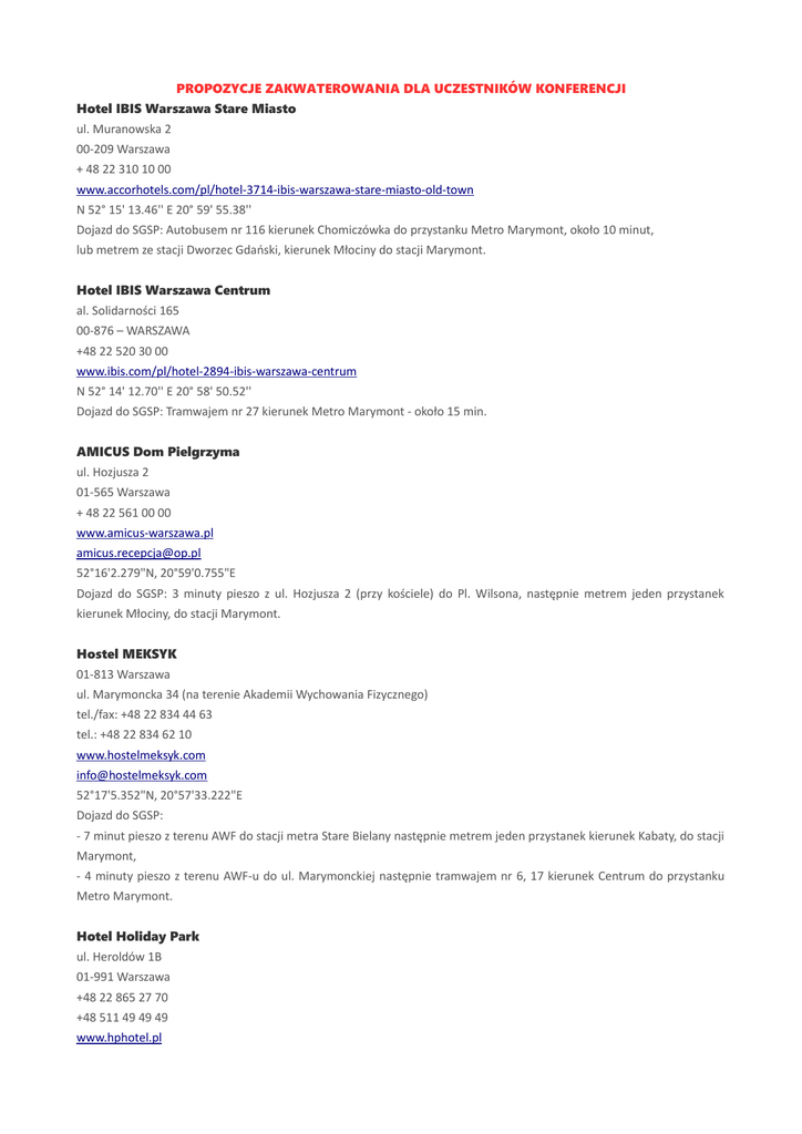 PROPOZYCJE ZAKWATEROWANIA DLA UCZESTNIKÓW KONFERENCJI Hotel IBIS Warszawa Stare Miasto ul. Muranowska 2 00-209 Warszawa + 48 22 310 10 00 www.accorhotels.com/pl/hotel-3714-ibis-warszawa-stare-miasto-old-town N 52° 15' 13.46'' E 20° 59' 55.38'' Dojazd do SGSP: Autobusem nr 116 kierunek Chomiczówka do przystanku Metro Marymont, około 10 minut, lub metrem ze stacji Dworzec Gdański, kierunek Młociny do stacji Marymont. Hotel IBIS Warszawa Centrum al. Solidarności 165 00-876 – WARSZAWA +48 22 520 30 00 www.ibis.com/pl/hotel-2894-ibis-warszawa-centrum N 52° 14' 12.70'' E 20° 58' 50.52'' Dojazd do SGSP: Tramwajem nr 27 kierunek Metro Marymont - około 15 min. AMICUS Dom Pielgrzyma ul. Hozjusza 2 01-565 Warszawa + 48 22 561 00 00 www.amicus-warszawa.pl [email protected] 52°16'2.279"N, 20°59'0.755"E Dojazd do SGSP: 3 minuty pieszo z ul. Hozjusza 2 (przy kościele) do Pl. Wilsona, następnie metrem jeden przystanek kierunek Młociny, do stacji Marymont. Hostel MEKSYK 01-813 Warszawa ul. Marymoncka 34 (na terenie Akademii Wychowania Fizycznego) tel./fax: +48 22 834 44 63 tel.: +48 22 834 62 10 www.hostelmeksyk.com [email protected] 52°17'5.352"N, 20°57'33.222"E Dojazd do SGSP: - 7 minut pieszo z terenu AWF do stacji metra Stare Bielany następnie metrem jeden przystanek kierunek Kabaty, do stacji Marymont, - 4 minuty pieszo z terenu AWF-u do ul. Marymonckiej następnie tramwajem nr 6, 17 kierunek Centrum do przystanku Metro Marymont. Hotel Holiday Park ul. Heroldów 1B 01-991 Warszawa +48 22 865 27 70 +48 511 49 49 49 www.hphotel.pl [email protected] 52°18'15.192"N, 20°56'2.132"E Dojazd do SGSP: dojście do ul. Pułkowej, autobusem linii 181 kierunek pl. Wilsona, następnie metrem 1 przystanek kierunek Młociny do przystanku Metro Marymont. Wilson Hostel Warszawa ul. Felińskiego 37 01-569 Warszawa + 48 22 839 40 81, www.wilsonhostel.pl [email protected] 520 15I 56” N; 200 59I 08.5” E Dojazd do SGSP: 10 minut pieszo z ul. Felińskiego 37 do Pl. Wilsona, następnie metrem jeden przystanek kierunek Młociny do stacji Marymont.