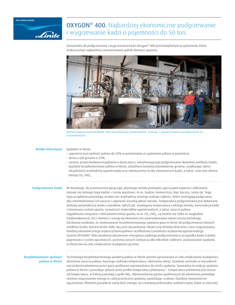 3 Data sheet. OXYGON® 400. ekonomiczne podgrzewanie OXYGON 400.Najbardziej Fast and fuel efficient oxyfuel i wygrzewanie kadzi o pojemności do 50 ton. preheating of vessels up to 50 tons size. ® Stanowisko do podgrzewania i wygrzewania kadzi Oxygon® 400 jest kompletnym urządzeniem, które wykorzystuje najbardziej zaawansowany palnik tlenowo-gazowy. System podgrzewania OXYGON® 400 zainstalowany w Katrineholm, Szwecja; 1-tonowe kadzie są podgrzewane na ® OXYGON 400 preheating systems installed at SKF in Katrineholm, Sweden; 1 ton ladles are heated in 6 stations. 6 stanowiskach. Summary Krótka informacja 3 Compared to air-fuel, oxyfuel allows for fuel savings of up to 55% Spalanie w tlenie: 3 25% shorter heating cycle • zapewnia oszczędność paliwa do 55% w porównaniu ze spalaniem paliwa w powietrzu, 3 Compact, simple and powerful oxyfuel installation, easy to fit on any vessel preheating • skraca cykl grzania o 25%, 3• zwarta, Flameless oxyfuel promotes a moreouniform heating increasing refractory lining life, reducing the number prosta budowa urządzenia dużej mocy, umożliwiającego podgrzewanie dowolnej wielkości kadzi,of and NO emissions vessels in circulation and effectively lowering CO 2 X • spalanie bezpłomieniowe paliwa w tlenie, umożliwia bardziej równomierne grzanie, wydłużając okres eksploatacji wykładziny ogniotrwałej oraz zmniejszenie liczby stosowanych kadzi, a także znacznie obniża Within theCO metals production industry various types of vessels and runners are used to transfer hot, liquid metal emisję 2 i NOX . between melting and casting operations. Typical examples are ladles, converters, tundishes, runners, pouring chutes, etc. These vessels and runners have ceramic lining of different types and quality that needs preheating to minimize refractory wear and gorącego, to secure the right metal quality. Preheating temperature chosen from optido przenoszenia płynnego metalu pomiędzy operacjami topieniaisi odlewania Podgrzewanie kadzi W metalurgii, of factors like fuel economy, refractory lifetime, refractory quality and liquid metal temperature mization stosuje się różnego typu kadzie i rynny spustowe, m.in.: kadzie, konwertory, leje, koryta, rynny itp. Tegoas well astypu vessel design and tappingceramiczne system used. The issueróżnego of lowering green housektóre gaseswymagają emission, podgrzania, such as from CO2 urządzenia posiadają wykładziny rodzaju i jakości, and environmental concern but also an economic aspect of modern metals production. abyNO zminimalizować ich zużycie i zapewnić wysoką jakość metalu. Temperatura podgrzewania jest dobierana X , is not only an AOD converters, tundishes,kadzi etc.) Flameless oxyfuel combustion in preheating of various vessels, (such as ladles, metodą optymalizacji wielu czynników, takich jak: wymagana temperatura ciekłego metalu, konstrukcja has since longsystem been proven be an efficient method of cutting heating times, improving i stosowany spustu,tożywotność materiałów ogniotrwałych, a także zużycie paliwa.fuel economy and extend vessel związane refractory zlining life. emisji gazów, m.in. CO2 i NOX, są istotne nie tylko ze względów Zagadnienia obniżaniem środowiskowych, lecz również z uwagi na ekonomiczne uwarunkowania nowoczesnej metalurgii. ® 400 system now makes this energy efficient preheating application available for use in smaller The OdOXYGON dawna wiadomo, że zastosowanie bezpłomieniowego spalania gazu w tlenie do podgrzewania różnych vessels andkadzi, runners, targeting for example foundries and micro steel mills. To skrócenia further improve the performance, wielkości konwertorów AOD, itp.) jest sprawdzoną i skuteczną metodą czasu wygrzewania, bardziej oxyfuel ekonomicznego wykorzystania paliwa i wydłużenia żywotności wyłożenia ogniotrwałego. is applied. flameless System OXYGON® 400 umożliwia stosowanie energooszczędnego podgrzewania w przypadku kadzi o małej pojemności i rynien spustowych, przeznaczonych zwłaszcza dlatomikrohut i odlewni. Zastosowanie spalania Flameless oxyfuel Flameless oxyfuel combustion technology is uniquely designed boost capacity, reduce fuel consumption, w tlenietemperature ma na celu zwiększenie wydajności improve uniformity and lowering grzania. emissions. The combustion occurs under a diluted oxygen concentration as flue gases are mixed into the combustion zone. This slows down the oxyfuel combustion reactions and results in lower flame temperatures, which are below the point at which thermal NOX is created. The mixing of Bezpłomieniowe spalanie flue Technologia spalania została zwiększenia wydajności, gases intobezpłomieniowego the flame also disperses thepaliwa energyw tlenie throughout theopracowana entire vesselw celu for a faster and more uniform paliwa w tlenie heating. obniżenia paliwa, lepszego temperatury zachodzi w warunkach Thezużycia dispersed flame containsrozkładu the same amount of i obniżenia energy but emisji. with a Spalanie much more effective heat distriburozrzedzenia płomienia spalinoweheating, wprowadzane do decreased strefy spalania. Spowalnia to reakcję spalania tion. The overall result is aprzez moregazy homogenous a further fuel consumption, and reduced paliwa woftlenie i powoduje spłaszczenie profilu temperatury płomienia – temperatura płomienia jest niższa emission NOX emissions. od temperatury, w której powstają cząstki NOX. Wprowadzenie gazów spalinowych do płomienia powoduje ® również rozproszenie energii system w całej works przestrzeni spalania,mode powodując szybsze i bardziej OXYGON 400 preheating in a flameless with only the pilot flamerównomierne continuously visible. The ogrzewanie. Płomień posiada tę samą ilość energii, lecz bardziej jednorodny rozkład ciepła, które w znacznej Vessel preheating ® OXYGON is a registered trademarks of The Linde Group. OXYGON 400_application_OXYGON®400_data 2010-03-09 13.26 Sida 2 OXY