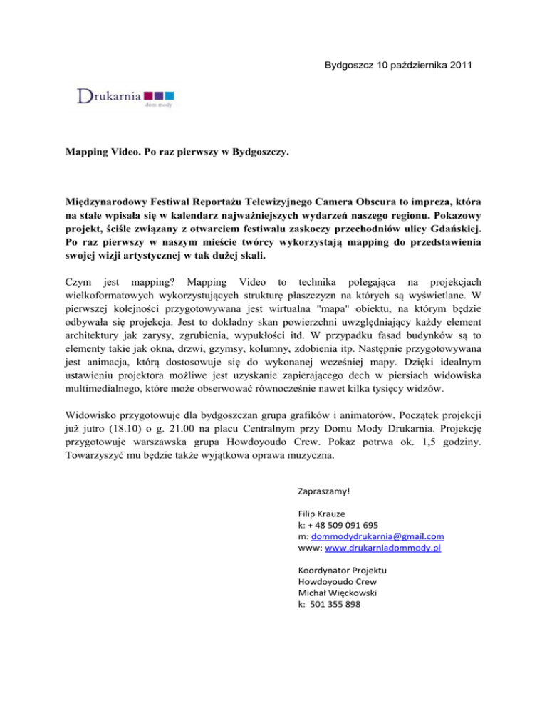 Bydgoszcz 10 października 2011 Mapping Video. Po raz pierwszy w Bydgoszczy. Międzynarodowy Festiwal Reportażu Telewizyjnego Camera Obscura to impreza, która na stałe wpisała się w kalendarz najważniejszych wydarzeń naszego regionu. Pokazowy projekt, ściśle związany z otwarciem festiwalu zaskoczy przechodniów ulicy Gdańskiej. Po raz pierwszy w naszym mieście twórcy wykorzystają mapping do przedstawienia swojej wizji artystycznej w tak dużej skali. Czym jest mapping? Mapping Video to technika polegająca na projekcjach wielkoformatowych wykorzystujących strukturę płaszczyzn na których są wyświetlane. W pierwszej kolejności przygotowywana jest wirtualna "mapa" obiektu, na którym będzie odbywała się projekcja. Jest to dokładny skan powierzchni uwzględniający każdy element architektury jak zarysy, zgrubienia, wypukłości itd. W przypadku fasad budynków są to elementy takie jak okna, drzwi, gzymsy, kolumny, zdobienia itp. Następnie przygotowywana jest animacja, którą dostosowuje się do wykonanej wcześniej mapy. Dzięki idealnym ustawieniu projektora możliwe jest uzyskanie zapierającego dech w piersiach widowiska multimedialnego, które może obserwować równocześnie nawet kilka tysięcy widzów. Widowisko przygotowuje dla bydgoszczan grupa grafików i animatorów. Początek projekcji już jutro (18.10) o g. 21.00 na placu Centralnym przy Domu Mody Drukarnia. Projekcję przygotowuje warszawska grupa Howdoyoudo Crew. Pokaz potrwa ok. 1,5 godziny. Towarzyszyć mu będzie także wyjątkowa oprawa muzyczna. Zapraszamy! Filip Krauze k: + 48 509 091 695 m: [email protected] www: www.drukarniadommody.pl Koordynator Projektu Howdoyoudo Crew Michał Więckowski k: 501 355 898