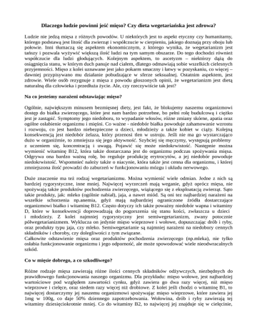 Dlaczego ludzie powinni jeść mięso? Czy dieta wegetariańska jest zdrowa? Ludzie nie jedzą mięsa z różnych powodów. U niektórych jest to aspekt etyczny czy humanitarny, którego podstawą jest litość dla zwierząt i współczucie w cierpieniu, jakiego doznają przy oboju lub połowie. Inni tłumaczą się aspektem ekonomicznym, z którego wynika, że wegetarianizm jest tańszy i pozwala wyżywić większą ilość ludzi na tym samym obszarze. Do tego dochodzi również współczucie dla ludzi głodujących. Kolejnym aspektem, to ascetyzm – niektórzy dążą do osiągnięcia stanu, w którym duch panuje nad ciałem, dlatego odmawiają sobie wszelkich cielesnych przyjemności. Mięso z kolei uznawane jest jako pokarm smaczny i łatwy w pozyskaniu, co więcej – dawniej przypisywano mu działanie pobudzające w sferze seksualnej. Ostatnim aspektem, jest zdrowie. Wiele osób rezygnuje z mięsa z powodu głoszonych opinii, że wegetarianizm jest dietą naturalną dla człowieka i przedłuża życie. Ale, czy rzeczywiście tak jest? Na co jesteśmy narażeni odstawiając mięso? Ogólnie, największym minusem bezmięsnej diety, jest fakt, że blokujemy naszemu organizmowi dostęp do białka zwierzęcego, które jest nam bardzo potrzebne, bo pełni rolę budulcową i ciężko jest je zastąpić. Symptomy jego niedoboru, to wypadanie włosów, różne zmiany skórne, apatia oraz ogólne osłabienie organizmu i mięśni. Co ważne - niedobór białka powoduje zahamowanie wzrostu i rozwoju, co jest bardzo niebezpieczne u dzieci, młodzieży a także kobiet w ciąży. Kolejną konsekwencją jest niedobór żelaza, który przenosi tlen w ustroju. Jeśli nie ma go wystarczająco dużo w organiźmie, to zmniejsza się jego aktywność. Szybciej się męczymy, występują problemy z uczeniem się, koncentracją i uwagą. Pojawić się może niedokrwistość. Następnie można wymienić witaminę B12, która także dostarczana jest do organizmu podczas spożywania mięsa. Odgrywa ona bardzo ważną rolę, bo reguluje produkcję erytrocytów, a jej niedobór powoduje niedokrwistość. Wspomnieć należy także o niacynie, która także jest cenna dla organizmu, i której zmniejszona ilość prowadzi do zaburzeń w funkcjonowaniu mózgu i układu nerwowego. Duże znaczenie ma też rodzaj wegetarianizmu. Można wymienić wiele odmian. Jedne z nich są bardziej rygorystyczne, inne mniej. Najwięcej wyrzeczeń mają weganie, gdyż oprócz mięsa, nie spożywają także produktów pochodzenia zwierzęcego, wiążącego się z eksploatacją zwierząt. Sąto takie produkty, jak: mleko (ogólnie nabiał), jaja, a nawet miód. Są oni tez najbardziej narażeni na wszelkie schorzenia np.anemia, gdyż mają najbardziej ograniczone źródła dostarczające organizmowi białko i witaminę B12. Często dotyczy ich także poważny niedobór wapna i witaminy D, które w konsekwencji doprowadzają do pogorszenia się stanu kości, zwłaszcza u dzieci i młodzieży. Z kolei najmniej rygorystyczny jest semiwegetarianizm, zwany potocznie półwegetarianizmem. Wyklucza on jedynie mięso wieprzowe i wołowe, dopuszczając drób i ryby, oraz produkty typu jaja, czy mleko. Semiwegetarianie są najmniej narażeni na niedobory cennych składników i choroby, czy dolegliwości z tym związane. Całkowite odstawienie mięsa oraz produktów pochodzenia zwierzęcego (np.mleka), nie tylko osłabia funkcjonowanie organizmu i jego odporność, ale może spowodować wiele nieodwracalnych szkód. Co w mięsie dobrego, a co szkodliwego? Różne rodzaje mięsa zawierają różne ilości cennych składników odżywczych, niezbędnych do prawidłowego funkcjonowania naszego organizmu. Dla przykładu: mięso wołowe, jest najbardziej wartościowe pod względem zawartości cynku, gdyż zawiera go dwa razy więcej, niż mięso wieprzowe i cielęce, oraz siedem razy więcej niż drobiowe. Z kolei jeśli chodzi o witaminę B1, to najwięcej dostarczymy jej naszemu organizmowi spożywając mięso wieprzowe, które zawiera jej 1mg w 100g, co daje 50% dziennego zapotrzebowania. Wołowina, drób i ryby zawierają tej witaminy dziesięciokrotnie mniej. Co do witaminy B2, to najwięcej jej znajduje się w cielęcinie, w wieprzowinie i wołowinie porównywalnie, a najmniej w drobiu. Cenna dla organizmu witamina B12, ma swoje największe źródło w mięsie wołowym i cielęcym i jest to 1,4mg na 100g, co przy spożyciu tej ilości uzupełnia 50% zapotrzebowania organizmu na tę witaminę. Wieprzowina, indyk i kurczaki, mają o połowę mniej zawartości tej witaminy. Z kolei niacyny (PP), najwięcej zawiera drób (12mg/100g), a po nim zaraz wieprzowina, indyk i wołowina. Ryby zawierają najmniej niacyny - 1,3mg - 6mg. Największą wadą mięsa jest tłuszcz, który spożywany w nadmiarze wywołuje u wielu osób zmiany miażdżycowe, a co za tym idzie - zawały serca i wylew krwi do mózgu. Najbardziej niebezpieczne w tym przypadku jest mięso czerwone, które z tego powodu zaleca się spożywać w ograniczonych ilościach. Statystyki dowodzą, że osoby spożywające duże ilości czerwonego mięsa, częściej zapadają też na choroby układu krążenia, schorzenia metaboliczne i nowotwory (np. jelita grubego). Dlatego ogólnie zaleca się spożywanie chudego mięsa (drobiu, cielęciny), które zawiera o wiele mniej kwasów tłuszczowych. Za poradą dietetyków, należy spożywać mięso w połączeniu z dużą ilością warzyw lub owoców, aby zachować proporcję pomiędzy produktami zasadotwórczymi i kwasotwórczymi. To pomaga w trawieniu bez zakłóceń. Ważnym faktem jest jednak to, że ludzie spożywają mięso i tłuszcze od tysięcy lat. Istniało wiele narodów, których dieta niegdyś obfitowała głównie w produkty zwierzęce, a mimo to żadne fakty historyczne, czy antropologiczne nie podają informacji o chorobach wymienionych wcześniej. Dlatego nie samo mięso wywołuje schorzenia, lecz inne czynniki z nim związane, ja