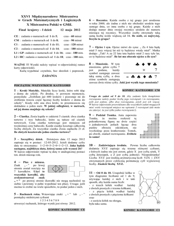 XXVI Międzynarodowe Mistrzostwa w Grach Matematycznych i Logicznych X Mistrzostwa Polski w GMiL Finał krajowy – I dzień 12 maja 2012 CE : zadania o numerach od 1 do 5; czas - 60 minut CM : zadania o numerach od 1 do 8; czas - 90 minut C1 : zadania o numerach od 1 do 11; czas - 120 minut C2 : zadania o numerach od 1 do 14; czas - 180 minut L1 i GP: zadania o numerach od 1 do 16; czas - 180 min. L2 i HC: zadania o numerach od 1 do 18; czas - 180 min. WAŻNE !!! Wyniki należy wpisać w odpowiedniej ramce karty odpowiedzi. Kartę wypełniać czytelnie, bez skreśleń i poprawek. ZADANIA 6 – Rocznice. Każda osoba z tej grupy jest urodzona w roku 2000, ale żadna z nich nie obchodzi urodzin tego samego dnia, co inna osoba z tej grupy. Każdy z nich dodaje numer dnia swojej rocznicy urodzin do numeru miesiąca tej rocznicy. Wszystkie osoby otrzymały taką samą liczbę ściśle większą od 34. Ile osób, co najwyżej, liczyła ta grupa? 7 – Ojciec i syn. Ojciec mówi do syna: „ Za 4 lata będę miał 5 razy więcej lat niż ty będziesz wtedy miał”. Matka dodaje: „Tak! A za 22 lata tata będzie miał 2 razy tyle lat, co ty będziesz miał”. Ile lat ma obecnie ojciec a ile syn? 8 – Mnożenie. W tym mnożeniu, gdzie cyfra 7 jest podana, każdy symbol zastępuje zawsze taką samą cyfrę, a dwa różne symbole zastępują zawsze dwie różne cyfry. Jaki jest wynik tego mnożenia? POCZĄTEK WSZYSTKICH KATEGORII 1 – Kroki Matyldy. Matylda liczy kroki, które robi idąc KONIEC KATEGORII CM z domu do szkoły. Po drodze, w pewnym momencie, pomyślała: „Zrobiłam już 600 kroków i pozostaje mi do zrobienia trzecia część łącznej liczby kroków z domu do szkoły”. Kiedy robi ona dwa kroki, to przemieszcza się dokładnie o jeden metr. W jakiej odległości, w metrach, od jej domu znajduje się szkoła? Uwaga do zadań od 9 do 18. Aby zadanie bylo kompletnie rozwiązane należy podać liczbę jego rozwiązań i to rozwiązanie, jeśli jest jedyne, albo dwa rozwiązania, jeżeli jest ich więcej. W karcie odpowiedzi przewidziano dla wszystkich zadań mogących mieć wiele rozwiązań miejsce na wpisanie 2 rozwiązań (ale może sie zdarzyć, że jest tylko jedno rozwiązanie!). 2 – Ciastka. Zosia kupiła w cukierni 5 ciastek: dwa ciastka tortowe i trzy babeczki, które są tańsze od ciastek tortowych. Cena ciastka tortowego jest mniejsza od trzykrotnej ceny babeczki. Każde ciastko kosztuje całkowitą liczbę złotych. Za wszystkie ciastka Zosia zapłaciła 21 zł. Ile złotych kosztowało jedno ciastko tortowe? 3 – Szczęśliwy dzień. Dzisiejsza data 12 maja 2012 zapisuje się w postaci 12-05-2012. Jeżeli dodamy cyfry daty to otrzymamy: 1+2+0+5+2+0+1+2=13. Jaka będzie następna, najbliższa data, której suma cyfr wynosi 26? W karcie odpowiedzi wpisać tę datę w analogicznej postaci tzn. dzień-miesiąc-rok. 4 – Plus z minusa. Znak „ - ” po lewej stronie został rozcięty na 7 kawałków. Użyć te wszystkie kawałki, aby zrekonstruować znak „ + ” po prawej stronie (kawałki nie mogą nachodzić na siebie i powinny w pełni wypełniać ten plus). Uwaga: jeśli można to zrobić na wiele sposobów, to podać jeden z nich. 5 – Rachunek roku. Wstawiając znaki „ + ” lub „ – ” pomiędzy niektórymi cyframi 123456789 utworzyć rachunek, którego wynik jest równy 2012. KONIEC KATEGORII CE 9 – Podział Tomka. Ania zapewnia Tomka, że można rozkroić tę pokratkowaną figurę na dwie części o jednakowych polach łącząc dwa punkty obrzeża odcinkiem, nie wychodząc poza kratkowanie. Tomek, po chwili, znalazł rozwiązanie. Zróbcie to samo! 10 - Zadziwiająca średnia. Pewna liczba całkowita dodatnia XYZ zapisuje się trzema różnymi cyframi, z których żadna nie jest zerem, gdzie X jest cyfrą setek, Y cyfrą dziesiątek, a Z jest cyfrą jedności. Niespodzianka! Liczba XYZ jest średnią arytmetyczną liczb YZX i ZXY otrzymanych przez cykliczną permutację cyfr wyjściowej liczby. Znaleźć liczbę XYZ. 11 – Od 0 do 10. Uzupełnić kółka w tym diagramie liczbami od 1 do 9, używając każdej z nich i w taki sposób, aby każda suma liczb: - z trzech kółek wzdłuż każdej z dwóch prostych z trzema kółkami, - z pięciu kółek wzdłuż każdej z dwóch prostych z pięcioma kółkami oraz - z sześciu kółek na okręgu, była taka sama. KONIEC KATEGORII C1 12 – Kwadratura koła. Napisać 16 – Cyfrowy obwód. Napiszcie jedną z liczb od 1 do 6 liczbę całkowitą dodatnią w każdym białym polu w taki sposób, aby suma napisanych trzech liczb była możliwie najmniejsza. Liczba napisana w polu „a” musi być mniejsza od liczby napisanej w polu „b”, a ta z kolei musi być mniejsza od tej napisanej w polu „c”. Każde szare pole ukrywa sumę dwóch liczb, które są do niego bezpośrednio przyłączone łukiem koła i każda liczba w szarym polu jest kwadratem pewnej liczby. w każdym polu. Każda z sześciu liczb musi być użyta dwa razy i bezpośrednio połączona (kreską lub strzałką) dokładnie jeden raz z każdą z pozostałych liczb. Ponadto każda strzałka musi być skierowana do większej z dwóch liczb, które ona łączy. 13 – Kawałek kwadratu. Na poprowadzono 2 odcinki łączące jeden z wierzchołków kwadratu z jednym ze środków jego boków. Utworzono w ten sposób szarą część kwadratu. Jaki jest dokładny stosunek pola szarej części do pola całego kwadratu? Podać wynik w postaci nieskracalnego ułamka. kwadracie obok KONIEC KATEGORII L1, GP 17 – Las Wielo Kąta. Kiedy Wielo Kąt miał rok, posadzono drzewo. Gdy Wielo Kąt miał 2 lata posadzono drzewa w taki sposób, aby utworzyć wielokąt foremny o N bokach, z dwoma drzewami na każdym boku, którego wierzchołkiem jest pierwsze drzewo. Gdy Wielo Kat miał 3 lata, posadzono drzewa w taki sposób, aby utworzyły nowy wielokąt foremny również o N bokach, z trzema drzewami na każdym boku, którego 2 boki są przedłużeniami 