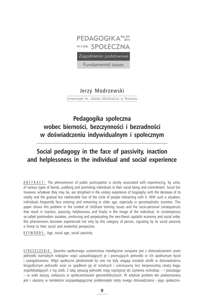Rok XIV 2015 Nr 2 (56) Fundamental issues Jerzy Modrzewski Uniwersytet im. Adama Mickiewicza w Poznaniu Pedagogika społeczna wobec bierności, bezczynności i bezradności w doświadczeniu indywidualnym i społecznym Social pedagogy in the face of passivity, inaction and helplessness in the individual and social experience A b s t r a c t : The phenomenon of public participation is strictly associated with experiencing, by units, of various types of bonds, justifying and promoting individuals in their social being and commitment. Social ties however, whatever they may be, are atrophied in the unitary experience of biography with the decrease of its vitality and the gradual but irretrievable loss of the circle of people interacting with it. With such a situation, individuals frequently face entering and remaining in older age, especially in gerontophobic societies. This paper shows this problem in the context of childcare training issues and the socio-personal consequences that result in inaction, passivity, helplessness and finally in the image of the individual. In contemporary so-called postmodern societies, continuing and perpetuating the neo-liberal capitalist economy and social order, this phenomenon becomes experienced not only by this category of person, signaling by its social passivity a threat to their social and existential perspective. K e y w o r d s : Age, social age, social passivity. S t r e s z c z e n i e : Zjawisko społecznego uczestnictwa nieodłącznie związane jest z doświadczaniem przez jednostki rozmaitych rodzajów więzi uzasadniających je i promujących jednostki w ich społecznym bycie i zaangażowaniu. Więzi społeczne jakiekolwiek by one nie były ulegają wszakże atrofii w doświadczeniu biograficznym jednostki wraz ze spadkiem jej sił witalnych i sukcesywną lecz bezpowrotną utratą kręgu współdziałających z nią osób. Z taką sytuacją jednostki mają najczęściej do czynienia wchodząc – i pozostając – w wiek starszy, zwłaszcza w społeczeństwach gerontofobicznych. W artykule problem ten podejmowany jest i ukazany w kontekście socjopedagogicznej problematyki istoty owego doświadczenia i jego społeczno- 9 Jerzy Modrzewski -indywidualnych konsekwencji skutkujących bezczynnością, bezradnością i wreszcie biernością w obrazie jednostkowego i kategorialnego społecznego bycia. We współczesnych, zwanych ponowoczesnymi, społeczeństwach, kontynuujących i utrwalających gospodarkę kapitalistyczną i neoliberalny ład społeczny zjawisko to staje się udziałem nie tylko tej kategorii osób, sygnalizujących swoją biernością społeczną zagrożenie swojej i społecznej perspektywy egzystencjalnej. S ł o w a k l u c z o w e : Starość, wiek społeczny, bierność społeczna. Gdy w 2003 roku kończyłem redakcję monografii poświęconej problematyce uczestnictwa społecznego poszczególnych kategorii wieku, wówczas ujawnił się, tylko po części rozstrzygnięty dylemat przyjęcia jakiegoś przekonującego uzasadnienia obecności w życiu społecznym kategorii osób starszych i wskazania specyficznej dla niej formy, przyjmując założenie, iż nie są to osoby w swojej masie: — skazane jedynie na marginalizację, izolację lub tak zwaną śmierć społeczną, — wyłącznie poddane i ulegające procesowi społecznego wykluczania, ekskluzji, — w zasadzie bezradne, a co za tym idzie skazane na bezczynność, zatem z podmiotowych względów bierne społecznie1. Zaproponowałem wówczas, by ujawniane i rzeczywiście praktykowane przez takie osoby zaangażowanie społeczne określić mianem uczestnictwa retrogresywnego, takiego, które zachowuje niektóre znamiona charakterystyczne dla osób dorosłych, biorących udział w procesach reprodukcyjnych we wszystkich ich aspektach czy wymiarach2, a równocześnie uwalnia je od kompletnego w nich zaangażowania z kontynuacją dotychczas posiadanego i społecznie akceptowanego statusu (Modrzewski 2004, 2007, r. VIII). Takie rozwiązanie zagadnienia społecznej obecności czwartej (poza dziecięcą, młodzieńczą i dorosłą), kategorii osób wzbogaca zbiory wszystkich jednostek zaangażowanych w konstruowanie i przydawanie dynamiki strukturze społecznej właśnie o s t a r s z e o s o b y s p o ł e c z n e, a równocześnie przydaje ich uczestnictwu specyficznych – niejako typologicznych – znamion bycia, a nie społecznego niebytu. 1 Psychologiczny aspekt zjawiska i stanu patrz m.in.: Seligman i in. 2003; Piorunek 2010 (zwłaszcza artykuł K. Przełowieckiej). 2 Do zasadniczych składników procesów reprodukcyjnych zaliczam ich wymiar: demograficzny – reprodukcja pronatalna, ekonomiczny – reprodukcja i pomnażanie dóbr materialnych, społeczny – reprodukcja podstawowych składników struktury społecznej (role, pozycje, statusy) i kulturowy (reprodukcja znamion kultury narodowej – język, doświadczenie i pamięć historyczną, wartości i wzory ich chronienia). 10 Pedagogika społeczna wobec bierności... Do kategorii starszych osób społecznych zaliczyłem wówczas osoby, które w danym układzie społecznym zostały uwolnione od czynnego udziału w reprodukcji biologicznej i ekonomicznej, zgodnie z prawami natury i obowiązującymi i respektowanymi w nim normami życia, wyznaczonymi obyczajem i/lub rozstrzygnięciem ustawowym. Równocześnie – w zgodzie z tymi uregulowaniami – uzyskały one, w układzie który je identyfikuje, przyzwolenie na kontynuację swojego zaangażowania w reprodukcji kulturowej (np. ciesząc się aktywnym udziałem w procesach socjalizacyjnych innych osób – zwłaszcza dzieci i młodzieży) (m.in.: Dubas, Świtalski 2011; Fabiś 2005; Grotowska 2011; Gubrium 1976; Harris 2000; Hill 2009; Kotlarska-Michalska 2013; Mielczarek 2011; Saxena 2006; Sierakowska 2003; Nawrocka 2013. Tym samym zachowują one i kontynuują uznawany przez innych uczestników życia społecznego s t a t u s, wynikający z pełnionych ról rodzinnych, to