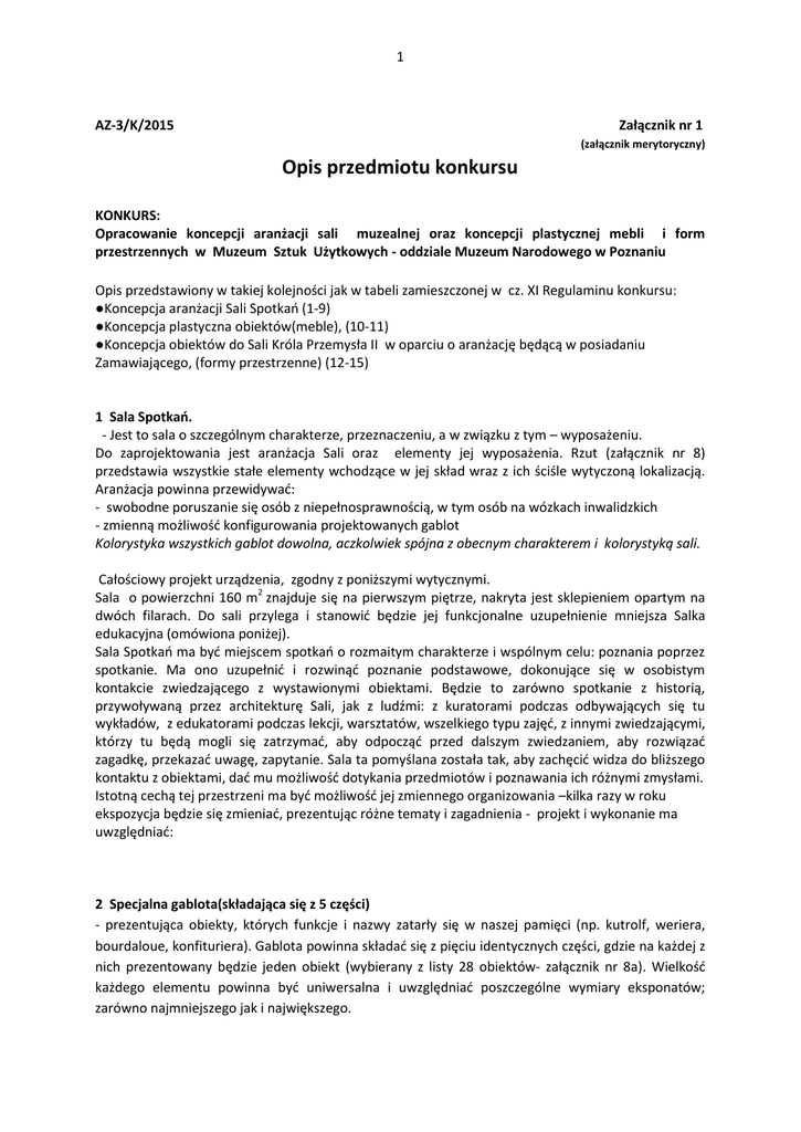 1 AZ-3/K/2015 Załącznik nr 1 (załącznik merytoryczny) Opis przedmiotu konkursu KONKURS: Opracowanie koncepcji aranżacji sali muzealnej oraz koncepcji plastycznej mebli i form przestrzennych w Muzeum Sztuk Użytkowych - oddziale Muzeum Narodowego w Poznaniu Opis przedstawiony w takiej kolejności jak w tabeli zamieszczonej w cz. XI Regulaminu konkursu: ●Koncepcja aranżacji Sali Spotkań (1-9) ●Koncepcja plastyczna obiektów(meble), (10-11) ●Koncepcja obiektów do Sali Króla Przemysła II w oparciu o aranżację będącą w posiadaniu Zamawiającego, (formy przestrzenne) (12-15) 1 Sala Spotkań. - Jest to sala o szczególnym charakterze, przeznaczeniu, a w związku z tym – wyposażeniu. Do zaprojektowania jest aranżacja Sali oraz elementy jej wyposażenia. Rzut (załącznik nr 8) przedstawia wszystkie stałe elementy wchodzące w jej skład wraz z ich ściśle wytyczoną lokalizacją. Aranżacja powinna przewidywać: - swobodne poruszanie się osób z niepełnosprawnością, w tym osób na wózkach inwalidzkich - zmienną możliwość konfigurowania projektowanych gablot Kolorystyka wszystkich gablot dowolna, aczkolwiek spójna z obecnym charakterem i kolorystyką sali. Całościowy projekt urządzenia, zgodny z poniższymi wytycznymi. Sala o powierzchni 160 m2 znajduje się na pierwszym piętrze, nakryta jest sklepieniem opartym na dwóch filarach. Do sali przylega i stanowić będzie jej funkcjonalne uzupełnienie mniejsza Salka edukacyjna (omówiona poniżej). Sala Spotkań ma być miejscem spotkań o rozmaitym charakterze i wspólnym celu: poznania poprzez spotkanie. Ma ono uzupełnić i rozwinąć poznanie podstawowe, dokonujące się w osobistym kontakcie zwiedzającego z wystawionymi obiektami. Będzie to zarówno spotkanie z historią, przywoływaną przez architekturę Sali, jak z ludźmi: z kuratorami podczas odbywających się tu wykładów, z edukatorami podczas lekcji, warsztatów, wszelkiego typu zajęć, z innymi zwiedzającymi, którzy tu będą mogli się zatrzymać, aby odpocząć przed dalszym zwiedzaniem, aby rozwiązać zagadkę, przekazać uwagę, zapytanie. Sala ta pomyślana została tak, aby zachęcić widza do bliższego kontaktu z obiektami, dać mu możliwość dotykania przedmiotów i poznawania ich różnymi zmysłami. Istotną cechą tej przestrzeni ma być możliwość jej zmiennego organizowania –kilka razy w roku ekspozycja będzie się zmieniać, prezentując różne tematy i zagadnienia - projekt i wykonanie ma uwzględniać: 2 Specjalna gablota(składająca się z 5 części) - prezentująca obiekty, których funkcje i nazwy zatarły się w naszej pamięci (np. kutrolf, weriera, bourdaloue, konfituriera). Gablota powinna składać się z pięciu identycznych części, gdzie na każdej z nich prezentowany będzie jeden obiekt (wybierany z listy 28 obiektów- załącznik nr 8a). Wielkość każdego elementu powinna być uniwersalna i uwzględniać poszczególne wymiary eksponatów; zarówno najmniejszego jak i największego. 2 - wymaga się, by do pięciu części gablot została zaprojektowana podstawa do monitora(wielkość 23’’- dostarcza Muzeum), o identycznej formie lub odpowiadającej pozostałym pięciu częściom. Podstawa do monitora powinna znajdować się w bliskiej relacji z pięcioma gablotami z uwagi na ich powiązane treści. Przewiduje się umieszczenie w monitorach nazw oraz funkcji eksponowanych obiektów. Wymaga się od Uczestników Konkursu aby gabloty były zamykane , zaś ich konstrukcja była stabilna oraz lekka umożliwiająca swobodną zmianę aranżacji Sali. 3 Specjalna gablota(umożliwiająca widzom bliski kontakt) - kilka gablot lub inaczej pomyślanych sprzętów, które mają stworzyć miejsce umożliwiające widzom bliski, dokładny ogląd wybranych w tym celu obiektów – ich dotknięcia, obrócenia w celu obejrzenia z różnych stron, odczytania sygnatury na dnie naczynia, poczucia materiału, z którego obiekt jest wykonany etc. Ten sprzęt lub gablota, będzie „ramą” ochronną dla umieszczonego w nich obiektu, tak aby nikt nie mógł go z nich wyciągnąć, a jednocześnie będzie zachęcać do dotykania obiektu i poznawania jego kształtu i faktury. Ten specjalny sprzęt musi dawać możliwość swobodnego obracania obiektu oraz obejrzenia wszystkich jego elementów (sygnatury, zdobienia itd.), ale bez możliwości wyciągnięcia go na zewnątrz i uszkodzenia. Sprzęt ten musi być dostosowany do różnego rodzaju obiektów wytypowanych przez MSU, lub też musi być indywidualnie zaprojektowany do każdego z nich. Powinien uwzględniać również możliwość umieszczenie jednocześnie od jednego do trzech mniejszych obiektów. Płaszczyzna podstawy gabloty powinna mieć możliwość podświetlenia z możliwością jego wyłączenia. Wielkość gabloty jest podyktowana najmniejszym i największym rozmiarem wytypowanych obiektów(załącznik nr 8b): wielkość największego obiektu nie przekracza 35 cm- w każdej płaszczyźnie, zaś najmniejszy ma wymiary: (dł. 7,2 cm, szer. 3,4 cm, głęb. 2,4 cm)oraz (wys. 3,7 cm, dł. 8,7 cm, szer. 2,7 cm) 4 Siedziska. Zespół wygodnych siedzisk dla publiczności, stabilnych i modułowych, które można ustawiać w rozmaitych układach (chodzi o umożliwienie ich zsunięcia pod ściany – w sytuacji, kiedy sala będzie inaczej wykorzystywana, co będzie związane z potrzebą uwolnienia jej środka dla np. ustawienia krzeseł lub rozłożenia wykładziny i poduszek lub stolików z krzesłami do zajęć z dziećmi. Konstrukcja lekka, umożliwiająca przenoszenie lub przesuwanie; ilość miejsc przewidziana dla 10-15 osób. 5 Gabloty- system modułowy - przeznaczone do ekspozycji obiektów muzealnych. Gablota wysoka z kloszem o wymiarach: (gł. 80cm, dł. 130cm, wysokość płaszczyzny dna gabloty 87cm, wysokość przestrzeni ekspozycyjnej 90cm)- potrzebne 3 sztuki; oraz gablota pulpitowa z kloszem - 1 sztuka o wymiarach: (gł. 80cm, dł. 130cm, wysokoś