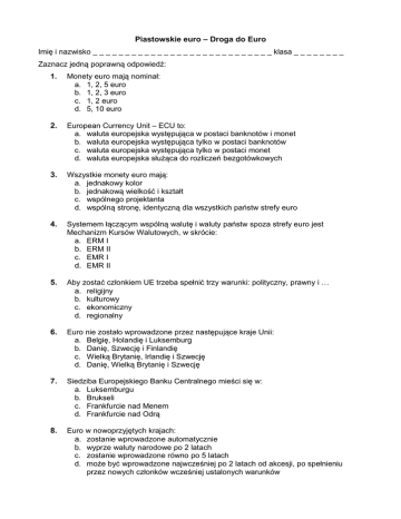 Piastowskie euro – Droga do Euro Imię i nazwisko _ _ _ _ _ _ _ _ _ _ _ _ _ _ _ _ _ _ _ _ _ _ _ _ _ _ _ _ klasa _ _ _ _ _ _ _ _ Zaznacz jedną poprawną odpowiedź: 1. Monety euro mają nominał: a. 1, 2, 5 euro b. 1, 2, 3 euro c. 1, 2 euro d. 5, 10 euro 2. European Currency Unit – ECU to: a. waluta europejska występująca w postaci banknotów i monet b. waluta europejska występująca tylko w postaci banknotów c. waluta europejska występująca tylko w postaci monet d. waluta europejska służąca do rozliczeń bezgotówkowych 3. Wszystkie monety euro mają: a. jednakowy kolor b. jednakową wielkość i kształt c. wspólnego projektanta d. wspólną stronę, identyczną dla wszystkich państw strefy euro 4. Systemem łączącym wspólną walutę i waluty państw spoza strefy euro jest Mechanizm Kursów Walutowych, w skrócie: a. ERM I b. ERM II c. EMR I d. EMR II 5. Aby zostać członkiem UE trzeba spełnić trzy warunki: polityczny, prawny i … a. religijny b. kulturowy c. ekonomiczny d. regionalny 6. Euro nie zostało wprowadzone przez następujące kraje Unii: a. Belgię, Holandię i Luksemburg b. Danię, Szwecję i Finlandię c. Wielką Brytanię, Irlandię i Szwecję d. Danię, Wielką Brytanię i Szwecję 7. Siedziba Europejskiego Banku Centralnego mieści się w: a. Luksemburgu b. Brukseli c. Frankfurcie nad Menem d. Frankfurcie nad Odrą 8. Euro w nowoprzyjętych krajach: a. zostanie wprowadzone automatycznie b. wyprze waluty narodowe po 2 latach c. zostanie wprowadzone równo po 5 latach d. może być wprowadzone najwcześniej po 2 latach od akcesji, po spełnieniu przez nowych członków wcześniej ustalonych warunków 9. Wspólnotowa waluta EURO: a. została wprowadzona do obiegu w postaci banknotów i monet 1 stycznia 1999 r. b. emitowana jest przez banki centralne państw członkowskich c. funkcjonuje w obrocie bezgotówkowym od 1 stycznia 1999 roku d. jest jedynym oficjalnym środkiem płatniczym na obszarze Unii Europejskiej 10. Pojęcie euro zostało wprowadzone na szczycie Rady Europejskiej: a. w Dublinie w 1992 roku b. w Madrycie w 1995 roku c. w Turynie w 1996 roku d. w Laeken w 2001 roku 11. Europejskiego rzecznika praw obywatelskich powołuje (wybiera): a. Parlament Europejski b. Rada Unii Europejskiej c. Trybunał Sprawiedliwości Wspólnot Europejskich d. Komisja Europejska 12. Banknoty euro mają nominał: a. 10, 20, 50, 100, 200, 500 euro b. 5, 10, 20, 50, 100, 200, 500 euro c. 5, 10, 15, 20, 50, 100, 200 euro d. 10, 20, 50, 100, 200, 500, 1000 euro 13. Kiedy wprowadzono euro do obiegu gotówkowego? a. 2002 r. b. 2000 r. c. 1999 r. d. 2001 r. 14. Eurosystem a. Kraje członkowskie Unii Europejskiej b. Europejski Bank Centralny i krajowe banki centralne państw członkowskich UE c. Kraje członkowskie Unii Walutowej i Gospodarczej d. Europejski Bank Centralny i krajowe banki centralne państw członkowskich, których walutą jest euro 15. Ostateczna decyzja o utworzeniu wspólnej waluty Unii Europejskiej zapadła w ramach traktatu, który powoływał do życia Unię Walutową i Gospodarczą. Był to traktat: a. z Maastricht b. z Nicei c. Lizboński d. Paryski 16. Po raz pierwszy użyto nazwy euro dla wspólnej waluty: a. w 1973 r. b. w 1995 r. c. w 1999 r. d. w 2002 r. 17. Które państwo UE nie wprowadziło transakcji bezgotówkowych w euro od 1999 r.? a. Grecja b. Belgia c. Austria d. Holandia 18. Kryterium konwergencji nie jest a. stabilny kurs wymiany waluty w ciągu ostatnich 2 lat – wahania kursów walut nie mogą przekroczyć ±15% do ustalonej początkowo wartości b. deficyt budżetowy nie wyższy niż 3% PKB c. inflacja wyższa o 1,5 pkt % od średniej stopy inflacji w trzech państwach UE, gdzie inflacja jest najniższa d. dług publiczny nieprzekraczający 60% PKB 19. TARGET to: a. system udogodnień dla krajów posiadających walutę narodową inną niż euro b. system automatycznych przeliczeń walut narodowych na euro c. maszyna do drukowania banknotów euro d. komisja unijna zajmująca się sprawdzaniem jakości banknotów 20. Na mocy podpisanych umów wprowadzono 1 stycznia2002 euro w formie gotówkowej w trzech krajach, które nie są członkami UE: a. Wielka Brytania, Dania, Szwecja b. Szwajcaria, Szwecja, Szkocja c. Norwegia, Turcja, Polska d. Monako, San Marino, Watykan 21. ESBC to a. Europejski Bank Centralny b. Europejski Bank Centralny i 27 banków centralnych krajów Unii Europejskiej c. Narodowy Bank Unii Europejskiej d. Eurosystem 22. Sławomir Skrzypek, prezes Narodowego Banku Polskiego jest a. członkiem Rady Ogólnej EBC b. członkiem Rady Prezesów EBC c. członkiem Zarządu EBC d. członkiem EBC 23. W chwili obecnej członkami Unii Walutowej i Gospodarczej z 27 państw członkowskich UE jest: a. 15 państw b. 11 państw c. 16 państw d. 13 państw 24. Do zadań Europejskiego Banku Centralnego nie należy: a. emitowanie wspólnej waluty euro b. udzielanie pożyczek i kredytów mieszkańcom UE c. prowadzenie polityki monetarnej w strefie euro d. nadzorowanie systemów bankowych w krajach Unii