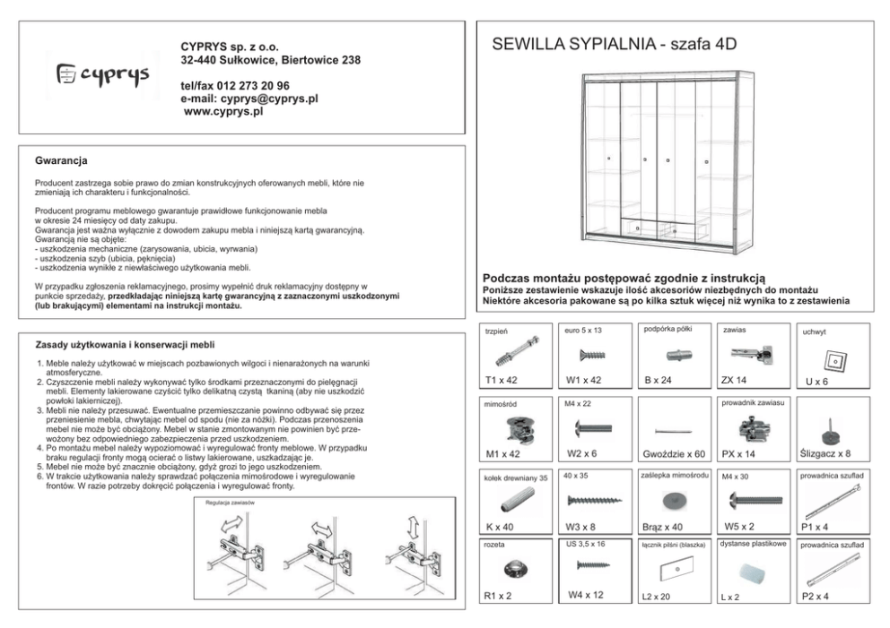 CYPRYS sp. z o.o. 32-440 Sułkowice, Biertowice 238 SEWILLA SYPIALNIA - szafa 4D tel/fax 012 273 20 96 e-mail: [email protected] www.cyprys.pl Gwarancja Producent zastrzega sobie prawo do zmian konstrukcyjnych oferowanych mebli, które nie zmieniają ich charakteru i funkcjonalności. Producent programu meblowego gwarantuje prawidłowe funkcjonowanie mebla w okresie 24 miesięcy od daty zakupu. Gwarancja jest ważna wyłącznie z dowodem zakupu mebla i niniejszą kartą gwarancyjną. Gwarancją nie są objęte: - uszkodzenia mechaniczne (zarysowania, ubicia, wyrwania) - uszkodzenia szyb (ubicia, pęknięcia) - uszkodzenia wynikłe z niewłaściwego użytkowania mebli. W przypadku zgłoszenia reklamacyjnego, prosimy wypełnić druk reklamacyjny dostępny w punkcie sprzedaży, przedkładając niniejszą kartę gwarancyjną z zaznaczonymi uszkodzonymi (lub brakującymi) elementami na instrukcji montażu. Podczas montażu postępować zgodnie z instrukcją Poniższe zestawienie wskazuje ilość akcesoriów niezbędnych do montażu Niektóre akcesoria pakowane są po kilka sztuk więcej niż wynika to z zestawienia trzpień euro 5 x 13 podpórka półki zawias uchwyt T1 x 42 W1 x 42 B x 24 ZX 14 Ux6 mimośród M4 x 22 Zasady użytkowania i konserwacji mebli 1. Meble należy użytkować w miejscach pozbawionych wilgoci i nienarażonych na warunki atmosferyczne. 2. Czyszczenie mebli należy wykonywać tylko środkami przeznaczonymi do pielęgnacji mebli. Elementy lakierowane czyścić tylko delikatną czystą tkaniną (aby nie uszkodzić powłoki lakierniczej). 3. Mebli nie należy przesuwać. Ewentualne przemieszczanie powinno odbywać się przez przeniesienie mebla, chwytając mebel od spodu (nie za nóżki). Podczas przenoszenia mebel nie może być obciążony. Mebel w stanie zmontowanym nie powinien być przewożony bez odpowiedniego zabezpieczenia przed uszkodzeniem. 4. Po montażu mebel należy wypoziomować i wyregulować fronty meblowe. W przypadku braku regulacji fronty mogą ocierać o listwy lakierowane, uszkadzając je. 5. Mebel nie może być znacznie obciążony, gdyż grozi to jego uszkodzeniem. 6. W trakcie użytkowania należy sprawdzać połączenia mimośrodowe i wyregulowanie frontów. W razie potrzeby dokręcić połączenia i wyregulować fronty. M1 x 42 W2 x 6 prowadnik zawiasu Gwoździe x 60 PX x 14 Ślizgacz x 8 M4 x 30 prowadnica szuflad kołek drewniany 35 40 x 35 zaślepka mimośrodu K x 40 W3 x 8 Brąz x 40 rozeta US 3,5 x 16 łącznik pilśni (blaszka) dystanse plastikowe prowadnica szuflad R1 x 2 W4 x 12 L2 x 20 Lx2 P2 x 4 Regulacja zawiasów W5 x 2 P1 x 4 *Uwaga!!! Dotyczy drzwi (8a) W opcji szafy z 1 x1 M1 M1 M1 M1 x x1 T1 T1 T1 K K p2 M1 Z W1 T1 K T1 K K T1 K M1 M1 M1 z1 W1 lustrem zastosować do przykręcania uchwytów wkręty W5 (M4X30) oraz dystanse plastikowe (L). Ostrożnie przykręcać uchwyty ,aby nie uszkodzić lustra. M1 p1 M1 p1 p2 M1 W1 Z W1 P P B W1 9 B Z K T1 K W1 R1 K T1 5a R2 M1 B 9 B T1 K T1 W1x3 P W1 Z W1 M1 M1 M1 P W1 W1 Z Z W1 B U 8b W1 W2 W1 Z U B 9 B 4a 3a 8a W2 * K T1 K Z W2 K T1 K W1 K M1 T1 K M1 M1 W1 W1 K Z B 9 W1 K W1 9 B P 7 P1 Z W1 Z B P W1 P K W1 W1 W1 M1 K T1 W1 P1 P1 W1 W1 W1 W1 P1 Z W1 W1 M1 M1 T1 M1 M1 M1 M1 x x2 Listwy ozdobne (Z1)(Z2) montujemy wkrętami (W3) od wewnątrz przykręcając je do elementów (x1)(x2) Ślizgacze należy przybić po zmontowaniu mebla od dołu do bokow (3a)(3b) oraz wieńca dolnego pod bokami (4a)(4b)(7) T1 T1 T1 T1 K T1 K K T1 K T1 K 2 K M1 M1 M1 W2 W1 Z K B Z M1 K W1 W1 W1 U* K T1 5c T1 K 5b M1 P 8a P 5c T1 3b 4b P W1 W1 9 B M1 8b W2 U Numer elementu Wymiar elementu 1,2 3a,3b 4a,4b 7 5a 5b 5c 8a 8b 9 x1 x2 p1(pilśń) p2(pilśń) Z1 Z2 2047x505 2135x585 2100x505 282x505 1015x450 1015x505 516x450 508x1942 508x1713 516x450 2047x97 2047x70 540x2130 512x2130 2047x 97 2047x 70 pilśń (d) przybić gwoździami do tyłu szuflady (c) K Kolejność montażu: 1.Połączyć ze sobą element (1) z elementem (x1), element (2) z elementami (x2) 2.Połaczyć ze sobą element (4a) z elementami (5a)(4b) oraz (2,x2) 3.Element (7) połączyć z elementem (4a,5a,4b,x2,2) a następnie z (5b) 4.Element (4a,5a,4b,x2,2,7,5b) połączyć z elementem (1,x1) a następnie z elemetami (5c) i elementami (3a)(3b) 5.Przybić pilśnie (p1)(p2) 5.Przykręcić listwy ozdobne (z1)(z2) 6.Przymocować drzwi (8a) i (8b). 7.Złożyć szuflady, jak na rysunku i wsunąc do mebla 8.Włożyć półki (9) widok z tyłu szafki T1 c b2 M1 P2 M1 d b1 p2 M1 p1 p1 p2 L1 W2 M1 P2 K T1 W4 a U W4 W4 Symbol Elementu A1,a2 b1,b2 c d (pilśń) Wymiary Elementu `508 x 226 500 x 130 115 x 437 450 x 505 plecy szafki p1,p2 przybić gwoździami do boków 3a,3b,4a,4b i wieńców 1,2 Uwaga: gwoździe muszą być wbijane prosto i możliwie na środku krawędzi. W innym przypadku mogą uszkodzić elementy mebli.