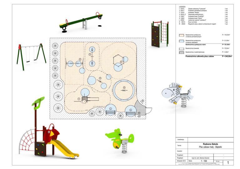 LEGENDA: 1. 10073 2. 30017 3. 10018 4. 30016_2 5. 10067 6. 10063 L 40002 K 40013 R 30020 1 szt. 1 szt. 1 szt. 1 szt. 1 szt. 1 szt. 2 szt. 1 szt. 1 szt. Regulamin placu zabaw na drewnianych nogach Nawierzchnia syntetyczna Nawierzchnia syntetyczna w kolorze niebieskim Nawierzchnia syntetyczna razem Nawierzchnia trawiasta Nawierzchnia z kostki betonowej 3 2 4 5 6 1 R L L K Lokalizacja: Temat: Inwestor: - Projektant: - Projektant: Skala: 1 : 100 Nr rys.: P.P.U. Woodplay zastrzega sobie wszelkie prawa do ochrony praw autorskich na podstawie Ustawy z dnia 04.02.1994r o prawie autorskim i prawach pokrewnych ( Dz. u. nr 28 poz. 83) a zwlaszcza art. 78 i 79 tejze ustawy. 1
