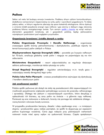 Paliwa Sektor od wielu lat budzący emocje inwestorów. Poddany silnym cyklom koniunkturalnym, dodatkowo wzmacnianym niepewnością na rynku paliw i czynnikami pogodowymi. To także jedyny sektor, w którym regularnie zdarzają się spore katastrofy ekologiczne. Mimo dyskusji o zmianie źródeł pozyskania energii ropa naftowa i gaz ziemny w dalszym ciągu stanowią podstawę bilansu energetycznego świata. Tym samym spółki z branży są wciąż ważnym elementem gospodarki światowej, jak i gospodarki polskiej, będąc jednocześnie największymi podmiotami pod względem przychodów. Organizacje branżowe i źródła danych o rynku Polska Organizacja Przemysłu i Handlu Naftowego – organizacja zrzeszająca spółki branży petrochemicznej i dystrybutorów, publikuje raporty na temat konsumpcji paliw ciekłych w Polsce Międzynarodowa Agencja Energetyki (IEA) – powstała po kryzysie naftowym lat 70-tych, analizuje globalny rynek paliw i reaguje na pojawiające się na nim zaburzenia Ministerstwo Gospodarki – resort odpowiedzialny za regulacje dotyczące sektora paliwowego, monitoruje także sytuację na rynku Urząd Regulacji Energetyki – regulator zatwierdzający m.in. taryfy gazu i wytyczający zasady deregulacji tego rynku Polska Izba Paliw Płynnych – zrzesza przedsiębiorstwa zajmujące się dystrybucją i handlem detalicznym paliw Jak analizować wyniki? Polskie spółki paliwowe jak dotąd nie stały się posiadaczami złóż zapewniających im możliwość pozyskiwania większości potrzebnego surowca do przerobu rafineryjnego i sprzedaży. Dlatego też jednym z najważniejszych czynników, które decydują o opłacalności ich biznesu, są ceny paliw na świecie – a głównie ropy naftowej. Ponieważ są one notowane w dolarach, branży nie pomaga też osłabienie złotego – rosną bowiem wówczas koszty surowca. W przypadku producentów benzyny, diesela i oleju opałowego oraz – w mniejszym stopniu –producentów gazu należy pamiętać, że spółki te dysponują już zapasami paliwa kupionego wcześniej. Cena jego nabycia przy późniejszych wahaniach notowań może mieć spory wpływ na zyskowność biznesu. Często spotykanym określeniem jest tzw. efekt LIFO (od angielskiego „last in first out”). Branża petrochemiczna rozlicza bowiem wykorzystywany surowiec przy księgowym założeniu, że w pierwszej kolejności do przerobu trafia ropa zakupiona ostatnio. To powoduje, że wzrost cen surowca generuje większe zyski, niż wynikałoby z czystej sprzedaży w danym okresie, z kolei spadek notowań wywołuje straty niezależne od przychodów i kosztów w danym okresie. W strukturze wyników spółek branży duże znaczenie ma tzw. marża rafineryjna, czyli zysk z przerobu surowca. Zależy ona przede wszystkim od sytuacji na rynkach światowych – stan mocy przerobowych innych rafinerii wpływają na ceny, podobnie jak skala popytu ze strony największych odbiorców. Dla Polskich firm ważny jest także poziom dyferencjału Ural/Brent, czyli różnicy w cenie ropy notowanej w Londynie i tańszego, zasiarczonego surowca sprowadzanego z Rosji (zwykle 1-2 USD/baryłkę). Polskie rafinerie w dużej mierze korzystają z tego drugiego źródła, co oznacza, że większa różnica w cenie daje szanse na większy zysk. Szczególnie w przypadku Orlenu spore znaczenie w wynikach odgrywa marża petrochemiczna, która pokazuje, ile spółka zarabia na produkcji nafty, olefin i innych związków pochodzących z przerobu ropy. Wprowadzenie nowych linii produkcyjnych (jak np. uruchomienie w ostatnim czasie produkcji kwasu tereftalowego wykorzystywanego przy produkcji opakowań plastikowych) może przekładać się na nowe źródła przychodów, które działają stabilizująco na ogólne wyniki. Zarówno Orlen, jak i Lotos prowadzą także biznes detaliczny (sieć stacji benzynowych). Historycznie jednak poziom marż detalicznych na polskim rynku jest niski (1-3 grosze na litrze benzyny czy diesela). Wynika to z dużej konkurencji na rynku, którą zwiększa dodatkowo fakt, że ceny paliwa bardzo łatwo porównywać ze sobą. Dlatego też na wysokie zyski w tym segmencie trudno liczyć. Za granicą spory wpływ na wyniki spółek sektora ma także działalność wydobywcza (ang. upstream). Spośród polskich spółek sił w tej materii próbuje m.in. Lotos posiadający aktywa na Morzu Bałtyckim i Północnym, a także szukający poza granicami Kulczyk Oil Ventures oraz Petrolinvest. Testowanie złóż ma wprawdzie niewielki wpływ na wyniki, ale jego zakup i późniejsza wycena – już tak. Dlatego inwestorzy z uwagą powinni śledzić doniesienia z tym związane, ponieważ mogą one mieć spore przełożenie na kurs akcji. Nieco inaczej wygląda struktura przychodów i kosztów w przypadku PGNiG – giganta na rynku gazu. W jego przypadku dystrybucja ma podobny udział w przychodach co wydobycie i produkcja, dlatego też inwestorzy skupiają się na informacjach dotyczących zmian planów taryfowych. Choć spółka wydobywa surowiec w Polsce, i przygotowuje pozyskanie gazu ze złóż norweskich (Skarv), wciąż jednak głównym źródłem dostawy jest Rosja i gazociąg jamalski, z sztywnie określonymi w kontrakcie warunkami cenowymi i wielkością odbioru. A ponieważ taryfy zatwierdzone przez regulatora (w połowie 2012 r. średnia cena gazu w hurcie wynosiła około 1,1 tys. zł za m3) są dużo mniejsze niż cena płacona Rosjanom, rentowność biznesu PGNiG zależy m.in. od zgody na podwyżki stawek ze strony Urzędu Regulacji Energetyki. Kluczowe czynniki dla kondycji sektora Analitycy zwracają przede wszystkim uwagę na moce przerobowe a kluczowymi czynnikami determinującymi poziom wyników w kolejnych kwartałach będą kurs USD/PLN oraz ceny ropy naftowej. Od nich zależą także bezpośrednio ceny gazu. Notowania surowców zależą bezpośrednio od mocy przerobowych rafinerii i dostępności surowca, a pośrednio – od koniunktury światowej i zapotrzeb
