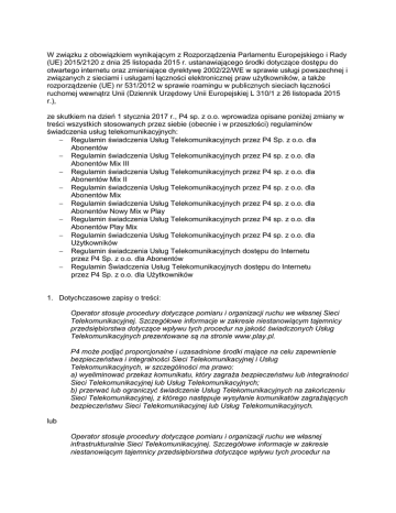 W związku z obowiązkiem wynikającym z Rozporządzenia Parlamentu Europejskiego i Rady (UE) 2015/2120 z dnia 25 listopada 2015 r. ustanawiającego środki dotyczące dostępu do otwartego internetu oraz zmieniające dyrektywę 2002/22/WE w sprawie usługi powszechnej i związanych z sieciami i usługami łączności elektronicznej praw użytkowników, a także rozporządzenie (UE) nr 531/2012 w sprawie roamingu w publicznych sieciach łączności ruchomej wewnątrz Unii (Dziennik Urzędowy Unii Europejskiej L 310/1 z 26 listopada 2015 r.), ze skutkiem na dzień 1 stycznia 2017 r., P4 sp. z o.o. wprowadza opisane poniżej zmiany w treści wszystkich stosowanych przez siebie (obecnie i w przeszłości) regulaminów świadczenia usług telekomunikacyjnych: Regulamin świadczenia Usług Telekomunikacyjnych przez P4 Sp. z o.o. dla Abonentów Regulamin świadczenia Usług Telekomunikacyjnych przez P4 sp. z o.o. dla Abonentów Mix III Regulamin świadczenia Usług Telekomunikacyjnych przez P4 sp. z o.o. dla Abonentów Mix II Regulamin świadczenia Usług Telekomunikacyjnych przez P4 sp. z o.o. dla Abonentów Mix Regulamin świadczenia Usług Telekomunikacyjnych przez P4 sp. z o.o. dla Abonentów Nowy Mix w Play Regulamin świadczenia Usług Telekomunikacyjnych przez P4 sp. z o.o. dla Abonentów Play Mix Regulamin świadczenia Usług Telekomunikacyjnych przez P4 sp. z o.o. dla Użytkowników Regulamin świadczenia Usług Telekomunikacyjnych dostępu do Internetu przez P4 Sp. z o.o. dla Abonentów Regulamin Świadczenia Usług Telekomunikacyjnych dostępu do Internetu przez P4 Sp. z o.o. dla Użytkowników 1. Dotychczasowe zapisy o treści: Operator stosuje procedury dotyczące pomiaru i organizacji ruchu we własnej Sieci Telekomunikacyjnej. Szczegółowe informacje w zakresie niestanowiącym tajemnicy przedsiębiorstwa dotyczące wpływu tych procedur na jakość świadczonych Usług Telekomunikacyjnych prezentowane są na stronie www.play.pl. P4 może podjąć proporcjonalne i uzasadnione środki mające na celu zapewnienie bezpieczeństwa i integralności Sieci Telekomunikacyjnej i Usług Telekomunikacyjnych, w szczególności ma prawo: a) wyeliminować przekaz komunikatu, który zagraża bezpieczeństwu lub integralności Sieci Telekomunikacyjnej lub Usług Telekomunikacyjnych; b) przerwać lub ograniczyć świadczenie Usług Telekomunikacyjnych na zakończeniu Sieci Telekomunikacyjnej, z którego następuje wysyłanie komunikatów zagrażających bezpieczeństwu Sieci Telekomunikacyjnej lub Usług Telekomunikacyjnych. lub Operator stosuje procedury dotyczące pomiaru i organizacji ruchu we własnej infrastrukturalnie Sieci Telekomunikacyjnej. Szczegółowe informacje w zakresie niestanowiącym tajemnicy przedsiębiorstwa dotyczące wpływu tych procedur na jakość świadczonych Usług Telekomunikacyjnych prezentowane są na stronie www.play.pl. P4 może podjąć proporcjonalne i uzasadnione środki mające na celu zapewnienie bezpieczeństwa i integralności Sieci Telekomunikacyjnej i Usług Telekomunikacyjnych, w szczególności ma prawo: a) wyeliminować przekaz komunikatu, który zagraża bezpieczeństwu lub integralności Sieci Telekomunikacyjnej lub Usług Telekomunikacyjnych; b) przerwać lub ograniczyć świadczenie Usług Telekomunikacyjnych na zakończeniu Sieci Telekomunikacyjnej, z którego następuje wysyłanie komunikatów zagrażających bezpieczeństwu Sieci Telekomunikacyjnej lub Usług Telekomunikacyjnych. zastępuje się zapisami o następującym brzmieniu: Operator stosuje procedury dotyczące pomiaru i organizacji ruchu we własnej infrastrukturalnie Sieci Telekomunikacyjnej. Szczegółowe informacje w zakresie niestanowiącym tajemnicy przedsiębiorstwa dotyczące wpływu tych procedur na jakość świadczonych Usług Telekomunikacyjnych prezentowane są na stronie www.play.pl. Operator może stosować środki zarządzania ruchem oparte o obiektywne różnice w wymogach dotyczących technicznej jakości usług. Procedury i środki opisane powyżej nie powinny wpływać negatywnie na jakość usług dostępu do Internetu oraz prywatność użytkowników końcowych. Środki, które może stosować Operator w odniesieniu do usługi dostępu do Internetu, nie są dyskryminacyjne i mają na celu optymalizację ogólnej jakości transmisji. Operator może stosować szczególne środki zarządzania ruchem wykraczające poza środki określone powyżej, w przypadkach, w których jest to konieczne, aby: a) zapewnić zgodność z przepisami prawa, którym podlega Operator, jak również z dotyczącymi Operatora orzeczeniami sądowymi lub decyzjami organów publicznych; b) utrzymać integralność i bezpieczeństwo sieci, usług świadczonych za pośrednictwem sieci oraz urządzeń końcowych użytkowników, w szczególności: wyeliminować przekaz komunikatu, który zagraża bezpieczeństwu lub integralności Sieci Telekomunikacyjnej lub Usług Telekomunikacyjnych; przerwać lub ograniczyć świadczenie Usług Telekomunikacyjnych na zakończeniu Sieci Telekomunikacyjnej, z którego następuje wysyłanie komunikatów zagrażających bezpieczeństwu Sieci Telekomunikacyjnej lub Usług Telekomunikacyjnych. c) zapobiec grożącym przeciążeniom sieci oraz złagodzić skutki wyjątkowego lub tymczasowego przeciążenia sieci (w takim przypadku równoważne rodzaje transferu danych są traktowane jednakowo). Szczególne środki zarządzania ruchem stosowane są wyłącznie przez okres konieczny do osiągnięcia celów opisanych powyżej i mogą wiązać się z pogorszeniem parametrów jakości usługi dostępu do Internetu. 2. W przypadku regulaminów świadczenia usług, które nie zawierały do tej pory postanowień wskazanych na wstępie powyższego pkt 1, do treści regulaminów wprowadza się następujące postanowienia: Operator stosuje procedury dotyczące pomiaru i organizacji ruchu we własnej infrastrukturalnie Sieci Telekomunikacyjnej. Szczegółowe informacje w zakresie