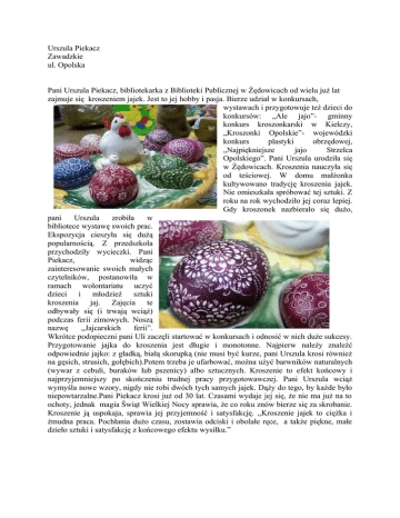Urszula Piekacz Zawadzkie ul. Opolska Pani Urszula Piekacz, bibliotekarka z Biblioteki Publicznej w Żędowicach od wielu już lat zajmuje się kroszeniem jajek. Jest to jej hobby i pasja. Bierze udział w konkursach, wystawach i przygotowuje też dzieci do konkursów: „Ale jajo”- gminny konkurs kroszonkarski w Kielczy, „Kroszonki Opolskie”- wojewódzki konkurs plastyki obrzędowej, „Najpiękniejsze jajo Strzelca Opolskiego”. Pani Urszula urodziła się w Żędowicach. Kroszenia nauczyła się od teściowej. W domu małżonka kultywowano tradycję kroszenia jajek. Nie omieszkała spróbować tej sztuki. Z roku na rok wychodziło jej coraz lepiej. Gdy kroszonek nazbierało się dużo, pani Urszula zrobiła w bibliotece wystawę swoich prac. Ekspozycja cieszyła się dużą popularnością. Z przedszkola przychodziły wycieczki. Pani Piekacz, widząc zainteresowanie swoich małych czytelników, postanowiła w ramach wolontariatu uczyć dzieci i młodzież sztuki kroszenia jaj. Zajęcia te odbywały się (i trwają wciąż) podczas ferii zimowych. Noszą nazwę ,,Jajcarskich ferii”. Wkrótce podopieczni pani Uli zaczęli startować w konkursach i odnosić w nich duże sukcesy. Przygotowanie jajka do kroszenia jest długie i monotonne. Najpierw należy znaleźć odpowiednie jajko: z gładką, białą skorupką (nie musi być kurze, pani Urszula krosi również na gęsich, strusich, gołębich).Potem trzeba je ufarbować, można użyć barwników naturalnych (wywar z cebuli, buraków lub pszenicy) albo sztucznych. Kroszenie to efekt końcowy i najprzyjemniejszy po skończeniu trudnej pracy przygotowawczej. Pani Urszula wciąż wymyśla nowe wzory, nigdy nie robi dwóch tych samych jajek. Dąży do tego, by każde było niepowtarzalne.Pani Piekacz krosi już od 30 lat. Czasami wydaje jej się, że nie ma już na to ochoty, jednak magia Świąt Wielkiej Nocy sprawia, że co roku znów bierze się za skrobanie. Kroszenie ją uspokaja, sprawia jej przyjemność i satysfakcję. ,,Kroszenie jajek to ciężka i żmudna praca. Pochłania dużo czasu, zostawia odciski i obolałe ręce, a także piękne, małe dzieło sztuki i satysfakcję z końcowego efektu wysiłku.”