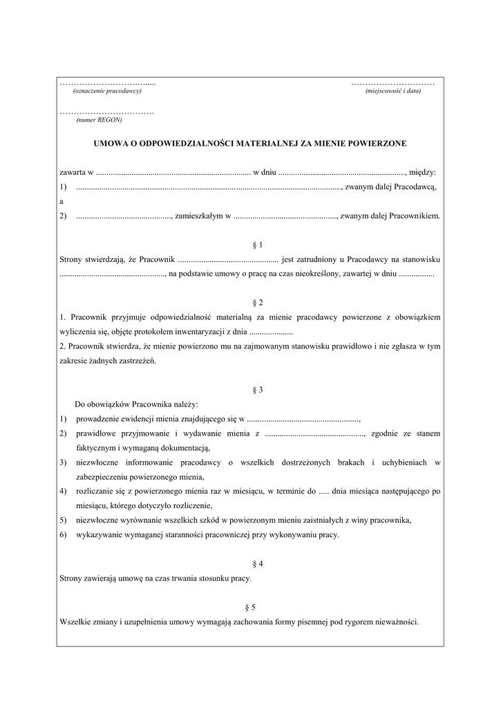 ……………………….…..... ………………………… (oznaczenie pracodawcy) (miejscowość i data) ……………………………. (numer REGON) UMOWA O ODPOWIEDZIALNOŚCI MATERIALNEJ ZA MIENIE POWIERZONE zawarta w .......................................................................... w dniu ............................................................, między: 1) .............................................................................................................................., zwanym dalej Pracodawcą, a 2) ............................................., zamieszkałym w ................................................., zwanym dalej Pracownikiem. §1 Strony stwierdzają, że Pracownik ................................................ jest zatrudniony u Pracodawcy na stanowisku .................................................., na podstawie umowy o pracę na czas nieokreślony, zawartej w dniu ................. §2 1. Pracownik przyjmuje odpowiedzialność materialną za mienie pracodawcy powierzone z obowiązkiem wyliczenia się, objęte protokołem inwentaryzacji z dnia ..................... 2. Pracownik stwierdza, że mienie powierzono mu na zajmowanym stanowisku prawidłowo i nie zgłasza w tym zakresie żadnych zastrzeżeń. §3 Do obowiązków Pracownika należy: 1) prowadzenie ewidencji mienia znajdującego się w ....................................................., 2) prawidłowe przyjmowanie i wydawanie mienia z ..............................................., zgodnie ze stanem faktycznym i wymaganą dokumentacją, 3) niezwłoczne informowanie pracodawcy o wszelkich dostrzeżonych brakach i uchybieniach w zabezpieczeniu powierzonego mienia, 4) rozliczanie się z powierzonego mienia raz w miesiącu, w terminie do ..... dnia miesiąca następującego po miesiącu, którego dotyczyło rozliczenie, 5) niezwłoczne wyrównanie wszelkich szkód w powierzonym mieniu zaistniałych z winy pracownika, 6) wykazywanie wymaganej staranności pracowniczej przy wykonywaniu pracy. §4 Strony zawierają umowę na czas trwania stosunku pracy. §5 Wszelkie zmiany i uzupełnienia umowy wymagają zachowania formy pisemnej pod rygorem nieważności. §6 W sprawach nieuregulowanych szczegółowo w umowie mają zastosowanie przepisy: 1) art. 114-116 i 118 Kodeksu pracy, 2) rozporządzenia Rady Ministrów z 10 października 1975 r. w sprawie warunków odpowiedzialności materialnej pracowników za szkodę w powierzonym mieniu (j.t. Dz.U. z 1996 r. Nr 143, poz. 662). §7 Umowę sporządzono w dwóch jednobrzmiących egzemplarzach, po jednym dla każdej ze stron. ................................................... (podpis pracodawcy lub osoby upoważnionej) ....................................... ........................ (podpis pracownika)