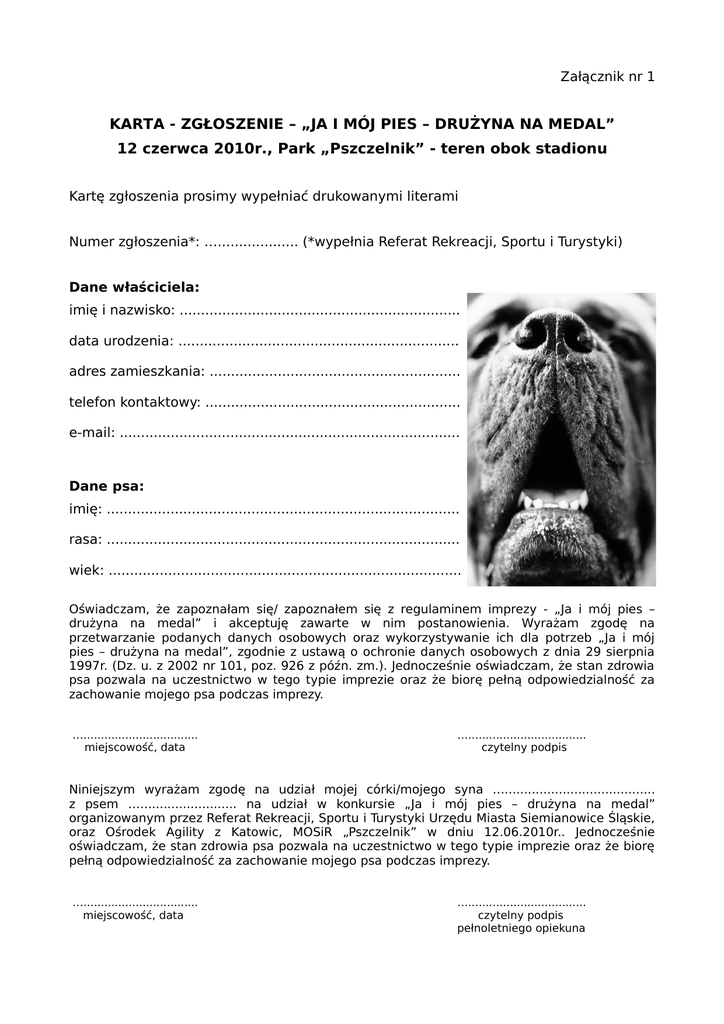 Załącznik nr 1 KARTA - ZGŁOSZENIE – „JA I MÓJ PIES – DRUŻYNA NA MEDAL” 12 czerwca 2010r., Park „Pszczelnik” - teren obok stadionu Kartę zgłoszenia prosimy wypełniać drukowanymi literami Numer zgłoszenia*: …................... (*wypełnia Referat Rekreacji, Sportu i Turystyki) Dane właściciela: imię i nazwisko: .................................................................. data urodzenia: .................................................................. adres zamieszkania: ........................................................... telefon kontaktowy: ............................................................ e-mail: ................................................................................ Dane psa: imię: ................................................................................... rasa: ................................................................................... wiek: ................................................................................... Oświadczam, że zapoznałam się/ zapoznałem się z regulaminem imprezy - „Ja i mój pies – drużyna na medal” i akceptuję zawarte w nim postanowienia. Wyrażam zgodę na przetwarzanie podanych danych osobowych oraz wykorzystywanie ich dla potrzeb „Ja i mój pies – drużyna na medal”, zgodnie z ustawą o ochronie danych osobowych z dnia 29 sierpnia 1997r. (Dz. u. z 2002 nr 101, poz. 926 z późn. zm.). Jednocześnie oświadczam, że stan zdrowia psa pozwala na uczestnictwo w tego typie imprezie oraz że biorę pełną odpowiedzialność za zachowanie mojego psa podczas imprezy. …................................. miejscowość, data ….................................. czytelny podpis Niniejszym wyrażam zgodę na udział mojej córki/mojego syna …....................................... z psem …......................... na udział w konkursie „Ja i mój pies – drużyna na medal” organizowanym przez Referat Rekreacji, Sportu i Turystyki Urzędu Miasta Siemianowice Śląskie, oraz Ośrodek Agility z Katowic, MOSiR „Pszczelnik” w dniu 12.06.2010r.. Jednocześnie oświadczam, że stan zdrowia psa pozwala na uczestnictwo w tego typie imprezie oraz że biorę pełną odpowiedzialność za zachowanie mojego psa podczas imprezy. …................................. miejscowość, data ….................................. czytelny podpis pełnoletniego opiekuna