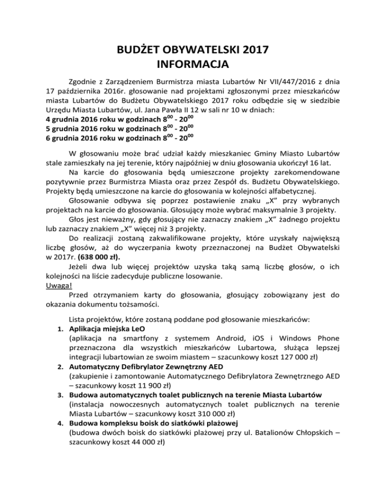 BUDŻET OBYWATELSKI 2017 INFORMACJA Zgodnie z Zarządzeniem Burmistrza miasta Lubartów Nr VII/447/2016 z dnia 17 października 2016r. głosowanie nad projektami zgłoszonymi przez mieszkańców miasta Lubartów do Budżetu Obywatelskiego 2017 roku odbędzie się w siedzibie Urzędu Miasta Lubartów, ul. Jana Pawła II 12 w sali nr 10 w dniach: 4 grudnia 2016 roku w godzinach 800 - 2000 5 grudnia 2016 roku w godzinach 800 - 2000 6 grudnia 2016 roku w godzinach 800 - 2000 W głosowaniu może brać udział każdy mieszkaniec Gminy Miasto Lubartów stale zamieszkały na jej terenie, który najpóźniej w dniu głosowania ukończył 16 lat. Na karcie do głosowania będą umieszczone projekty zarekomendowane pozytywnie przez Burmistrza Miasta oraz przez Zespół ds. Budżetu Obywatelskiego. Projekty będą umieszczone na karcie do głosowania w kolejności alfabetycznej. Głosowanie odbywa się poprzez postawienie znaku „X” przy wybranych projektach na karcie do głosowania. Głosujący może wybrać maksymalnie 3 projekty. Głos jest nieważny, gdy głosujący nie zaznaczy znakiem „X” żadnego projektu lub zaznaczy znakiem „X” więcej niż 3 projekty. Do realizacji zostaną zakwalifikowane projekty, które uzyskały największą liczbę głosów, aż do wyczerpania kwoty przeznaczonej na Budżet Obywatelski w 2017r. (638 000 zł). Jeżeli dwa lub więcej projektów uzyska taką samą liczbę głosów, o ich kolejności na liście zadecyduje publiczne losowanie. Uwaga! Przed otrzymaniem karty do głosowania, głosujący zobowiązany jest do okazania dokumentu tożsamości. 1. 2. 3. 4. Lista projektów, które zostaną poddane pod głosowanie mieszkańców: Aplikacja miejska LeO (aplikacja na smartfony z systemem Android, iOS i Windows Phone przeznaczona dla wszystkich mieszkańców Lubartowa, służąca lepszej integracji lubartowian ze swoim miastem – szacunkowy koszt 127 000 zł) Automatyczny Defibrylator Zewnętrzny AED (zakupienie i zamontowanie Automatycznego Defibrylatora Zewnętrznego AED – szacunkowy koszt 11 900 zł) Budowa automatycznych toalet publicznych na terenie Miasta Lubartów (instalacja nowoczesnych automatycznych toalet publicznych na terenie Miasta Lubartów – szacunkowy koszt 310 000 zł) Budowa kompleksu boisk do siatkówki plażowej (budowa dwóch boisk do siatkówki plażowej przy ul. Batalionów Chłopskich – szacunkowy koszt 44 000 zł) 5. Budowa placu zabaw na działce nr 83/17 przy ul. Łokietka w Lubartowie (budowa placu z montażem urządzeń do zabawy dla dzieci – szacunkowy koszt 200 000 zł) 6. Eko-stadion czyli budowa zieleni parkowej wraz z urządzeniami i obiektami towarzyszącymi (urządzenia sportu i rekreacji) na „Osiedlu Garbarskim” (budowa zieleni parkowej wraz z urządzeniami i obiektami towarzyszącymi – czyli tzw. EKO-stadionu otoczonego zielenią parkową - szacunkowy koszt do 319 000 zł) 7. L` ART Festiwal 2017 (jubileuszowa edycja festiwalu sztuki organizowanego cyklicznie w ostatni weekend sierpnia - szacunkowy koszt 70 000 zł) 8. Latające Jarmarki u Sanguszków (zakup 15 drewnianych domków handlowo – wystawienniczych na imprezy plenerowe, kiermasze świąteczne i pozostałe imprezy miejskie oraz przygotowanie przyłącza energetycznego potrzebnego do podłączenia lodówek i wag elektronicznych - szacunkowy koszt 75 250 zł) 9. Modernizacja placu zabaw przy ulicy Chmielnej (odnowienie i modernizacja miejskiego placu zabaw, urządzenie siłowni zewnętrznej – szacunkowy koszt 59 000 zł) 10. Oświetlenie ulic Stefana Batorego i Zygmunta II Augusta (budowa linii kablowej oświetlenia ulicznego na długości ok. 300 m – szacunkowy koszt 100 000 zł) 11. Rozegrany Lubartów – „Miasteczko gier” – czyli stoliki do gier w centrum miasta - w szachy, brydża, chińczyka, piłkarzyki (zakup i montaż betonowych stołów do różnego rodzaju gier (szachy, warcaby, brydż, piłkarzyki, szachy plenerowe) – szacunkowy koszt 45 000 zł) 12. Siłownie plenerowe (utworzenie 4 siłowni plenerowych do swobodnego użytkowania przez młodzież i dorosłych mieszkańców miasta w następujących lokalizacjach: przy Szkole Podstawowej nr 4, przy ul. Kasztanowej i Chmielnej, osiedle 3 Maja, przy ul. Różanej i Słonecznej – szacunkowy koszt 120 000 zł) 13. Upamiętnienie Biblioteki Polskiej Macierzy Szkolnej (usytuowanie w miejscu istnienia w latach 1909-1948 Biblioteki Polskiej Macierzy Szkolnej przy ul. Mickiewicza 6 w Lubartowie symbolicznego kamienia z tablicą pamiątkową – szacunkowy koszt 6 000 zł) 14. Wyposażenie Uniwersytetu Trzeciego Wieku przy Miejskiej Bibliotece Publicznej w Lubartowie (wyposażenie uniwersytetu w brakujące sprzęty dla seniorów: komputer, monitor, biurko komputerowe, krzesło obrotowe, szafa, zestaw dla prezentacji multimedialnej: laptop, projektor, ekran i inne – szacunkowy koszt 10 000 zł) Ze szczegółami projektów zgłoszonych przez mieszkańców można zapoznać się w Urzędzie Miasta Lubartów, pokój nr 206, jak również na stronie www.lubartow.pl w zakładce Budżet Obywatelski 2017.