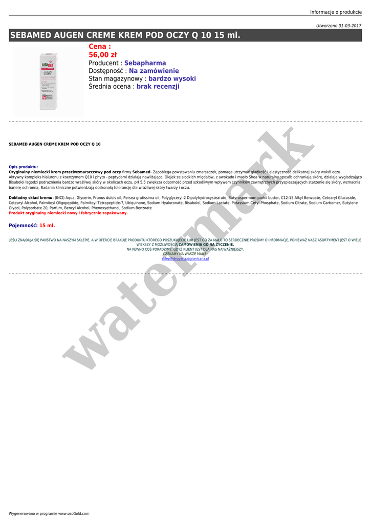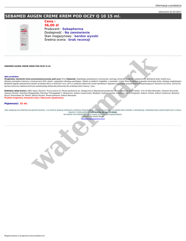 Informacje o produkcie Utworzono 01-03-2017 SEBAMED AUGEN CREME KREM POD OCZY Q 10 15 ml. Cena : 56,00 zł Producent : Sebapharma Dostępność : Na zamówienie Stan magazynowy : bardzo wysoki Średnia ocena : brak recenzji er m ar k SEBAMED AUGEN CREME KREM POD OCZY Q 10 Opis produktu: Oryginalny niemiecki krem przeciwzmarszczowy pod oczy firmy Sebamed. Zapobiega powstawaniu zmarszczek, pomaga utrzymać gładkość i elastyczność delikatnej skóry wokół oczu. Aktywny kompleks hialuronu z koenzymem Q10 i phyto - peptydami działają nawilżająco. Olejek ze słodkich migdałów, z awokado i masło Shea w naturalny sposób ochraniają skórę, działają wygładzająco Bisabolol łagodzi podrażnienia bardzo wrażliwej skóry w okolicach oczu, pH 5,5 zwiększa odporność przed szkodliwym wpływem czynników zewnętrznych przyspieszających starzenie się skóry, wzmacnia barierę ochronną. Badania kliniczne potwierdzają doskonałą tolerancję dla wrażliwej skóry twarzy i oczu. Dokładny skład kremu: (INCI) Aqua, Glycerin, Prunus dulcis oil, Persea gratissima oil, Polyglyceryl-2 Dipolyhydroxystearate, Butyrospermum parkii butter, C12-15 Alkyl Benzoate, Cetearyl Glucoside, Cetearyl Alcohol, Palmitoyl Oligopeptide, Palmitoyl Tetrapeptide-7, Ubiquinone, Sodium Hyaluronate, Bisabolol, Sodium Lactate, Potassium Cetyl Phosphate, Sodium Citrate, Sodium Carbomer, Butylene Glycol, Polysorbate 20, Parfum, Benzyl Alcohol, Phenoxyethanol, Sodium Benzoate Produkt oryginalny niemiecki nowy i fabrycznie zapakowany. Pojemność: 15 ml. w at JEŚLI ZNAJDUJĄ SIĘ PAŃSTWO NA NASZYM SKLEPIE, A W OFERCIE BRAKUJE PRODUKTU KTÓREGO POSZUKUJECIE LUB JEST GO ZA MAŁO TO SERDECZNIE PROSIMY O INFORMACJE, PONIEWAŻ NASZ ASORTYMENT JEST O WIELE WIĘKSZY Z MOŻLIWOŚCIĄ ZAMÓWIENIA GO NA ŻYCZENIE. NA PEWNO COŚ PORADZIMY, GDYŻ KLIENT JEST DLA NAS NAJWAŻNIEJSZY. CZEKAMY NA WASZE MAILE: [email protected] Wygenerowano w programie www.oscGold.com