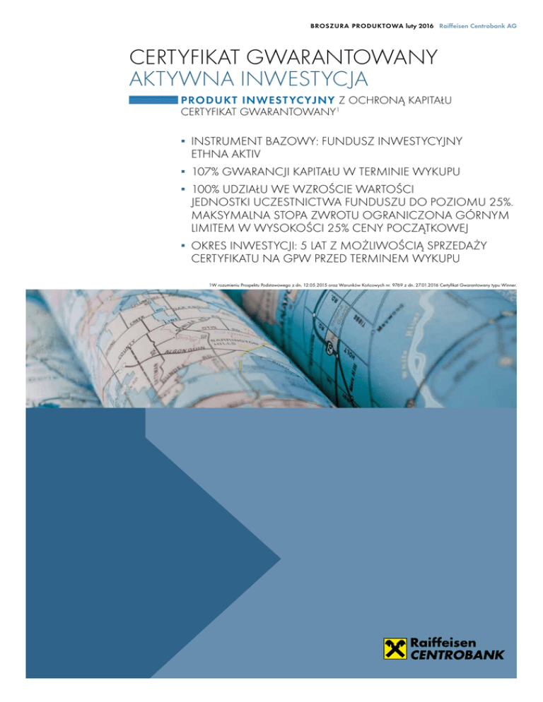 BROSZURA PRODUKTOWa luty 2016 Raiffeisen Centrobank AG CERTYFIKAT GWARANTOWANY AKTYWNA INWESTYCJA Produkt inwest ycyjny z ochroną kapitału Certyfikat gwarantowany1 ▪▪ INSTRUMENT BAZOWY: FUNDUSZ INWESTYCYJNY ETHNA AKTIV ▪▪ 107% GWARANCJI KAPITAŁU W TERMINIE WYKUPU ▪▪ 100% UDZIAŁU WE WZROŚCIE WARTOŚCI JEDNOSTKI UCZESTNICTWA FUNDUSZU DO POZIOMU 25%. MAKSYMALNA STOPA ZWROTU OGRANICZONA GÓRNYM LIMITEM W WYSOKOŚCI 25% CENY POCZĄTKOWEJ ▪▪ OKRES INWESTYCJI: 5 LAT Z MOŻLIWOŚCIĄ SPRZEDAŻY CERTYFIKATU NA GPW PRZED TERMINEM WYKUPU 1W rozumieniu Prospektu Podstawowego z dn. 12.05.2015 oraz Warunków Końcowych nr. 9769 z dn. 27.01.2016 Certyfikat Gwarantowany typu Winner. Raiffeisen Centrobank AG CERTYFIKAT GWARANTOWANY AKTYWNA INWESTYCJA ABSOLUTNA STOPA ZWROTU GLOBALNEGO FUNDUSZU ETHNA AKTIV Inwestycja w Certyfikat Gwarantowany Aktywna Inwestycja, daje Inwestorowi możliwość uzyskania stopy zwrotu na poziomie maksymalnie 25% za okres 5 lat. W przypadku, gdy stopa zwrotu funduszu jest równą bądź poniżej 107% wartości początkowej Inwestor w dniu wykupu otrzymuje zwrot w wysokości 107% zainwestowanego kapitału. NAJWAŻNIEJSZE INFORMACJE Emitent Raiffeisen Centrobank AG Gwarant* Raiffeisen Centrobank AG ISIN AT0000A1JW31 Nazwa skrócona RCGETNA0321 Wartość nominalna 1000 zł Cena emisyjna 1000 zł Opłata subskrypcyjna maks. 15 zł Min. wielkość zapisu 5 certyfikatów Subskrypcja1 01.02-26.02.2016 Dzień pierwszej wyceny 29.02.2016 Dzień ostatecznej wyceny 25.02.2021 Dzień wykupu 01.03.2021 Ochrona kapitału 107% w dniu wykupu Współczynnik partycypacji 100% Kwota wykupu Inwestor otrzymuje sumę wartości gwarantowanej 1070 zł oraz iloczynu ceny emisyjnej, współczynnika udziału i stopy zwrotu funduszu (ponad 107% stanu początkowego funduszu) ograniczonej do wysokości 25%. lub, w przypadku gdy stopa zwrotu funduszu wyniesie poniżej 107% stanu początkowego, wypłatę wartości gwarantowanej równej 1070 zł za każdy Certyfikat (wykup przez Raiffeisen Centrobank AG* w terminie zapadalności). Waluta PLN Notowania GPW2 Aktualna cena www.rcb.at * Raiffeisen Centrobank AG należy w 100 % do Raiffeisen Bank International AG – rating RBI: www.rbinternational.com/ir/ratings 1. Raiffeisen Centrobank AG zastrzega sobie wcześniejsze zakończenie lub przedłużenie okresu subskrypcji. 2. Intencją Emitenta jest ubieganie się o dopuszczenie Certyfikatów do obrotu na GPW. Certyfikat Gwarantowany Aktywna Inwestycja to rozwiązanie, które powstało z myślą o Klientach ceniących przede wszystkim stabilność oraz aktywne zarządzanie środkami zapewniające niską zmienność inwestycji jak również dywersyfikacje pomiędzy różne klasy aktywów. Unikalną cechą Certyfikatu Gwarantowanego Aktywna Inwestycja jest oparcie o fundusz absolutnej stopy zwrotu Ethna – Aktiv, którego nadrzędnym celem jest systematyczny wzrost wartości aktywów oraz wzmożona ochrona kapitału. Powyższe cele realizowane są poprzez aktywne zarządzanie i dostosowywanie struktury aktywów do aktualnych i prognozowanych warunków rynkowych. Zarządzający kierują się zasadą: optymalny zysk przy minimalnym ryzyku. Fundusz inwestuje w płynne aktywa, obligacje, akcje, instrumenty rynku pieniężnego, warranty, lokaty terminowe, koncentrując się głównie na rynkach europejskich oraz krajach OECD. Fundusz absolutnej stopy zwrotu- Ethna Aktiv ▫▫ Fundusz powstał 15 lutego 2002 roku w Luksemburgu i jest zarządzany przez Towarzystwo Funduszy Inwestycyjnych ETHENEA Independent Investors S.A. z główną siedzibą w Luksemburgu ▫▫ Wartość aktywów netto funduszu wynosi 13.06 bln EUR (stan na 31/12/2015) ▫▫ W inwestowaniu środków Klientów zarządzający funduszem stosują sie do następujących zasad: - Depozyty terminowe i rynek pieniężny – w zależności od sytuacji rynkowej fundusz może w nie ulokować do 100% aktywów. - Obligacje rządowe i korporacyjne – starannie wyselekcjonowane z różnych sektorów i krajów na podstawie reputacji, tylko z wysokim ratingiem (do 100% aktywów). - Rynek akcji – ekspozycja nigdy nie może przekroczyć 49% aktywów. Fundusz stara się inwestować tylko w spółki z wysoką kapitalizacją rynkową. - Światowy rynek walutowy – ekspozycja nie może przekroczyć 30% wartości portfela. Zasady funkcjonowania Potencjalny zysk dla Inwestora zależny jest od wzrostu wartości jednostki uczestnictwa funduszu w okresie 5 lat. W dniu pierwszej wyceny (29.02.2016) określona zostaje początkowa wartość jednostki uczestnictwa funduszu Ethna Aktiv. Na koniec okresu inwestycji weryfikowana jest stopa zwrotu z funduszu i w przypadku stopy zwrotu powyżej 107% wartości początkowej, Inwestor partycypuje w stosunku jeden do jednego we wzroście wartości fundusz, aż do górnej granicy zysku określonej na poziomie 25%. Stopa zwrotu z funduszu ograniczona jest limitem górnym tzw. cap w wysokości 25%, czyli Inwestor otrzymuje maksymalnie 1250 zł za każdy Certyfikat. Ostateczna stopa zwrotu z inwestycji obliczana jest w dniu ostatecznej wyceny. W przypadku gdy fundusz zanotuje stopę zwrotu równą bądź poniżej 107% wartości początkowej, kapitał Inwestora chroniony jest w 107% ceny emisyjnej Certyfikatu, czyli Inwestor otrzyma 1070 zł za każdy Certyfikat. www.rcb.at DOTYCHCZASOWE NOTOWANIA Pr ice EUR 141 138 135 132 129 126 123 Kapitał jest chroniony wyłącznie w dniu wykupu w wysokości 107% ceny emisyjnej Certyfikatu. Przed terminem wykupu może dojść do wahań wartości rynkowej Certyfikatu poniżej wartości nominalnej, lecz w dniu wykupu Inwestor otrzyma minimalnie 107% ceny emisyjnej. Gwarantem ochrony jest Raiffeisen Centrobank AG. 120 117 114 111 108 105 2011 2012 2013 2014 2015 2016 W dniu ostatecznej wyceny może wystąpić jeden z dwóch scenariuszy: 102 Źródło: Bloomberg, stan na styczeń 2016 Prosimy pamiętać, że wyniki rynkowe odnotowane w przeszłości nie mogą stanowić podstaw do wyciąga