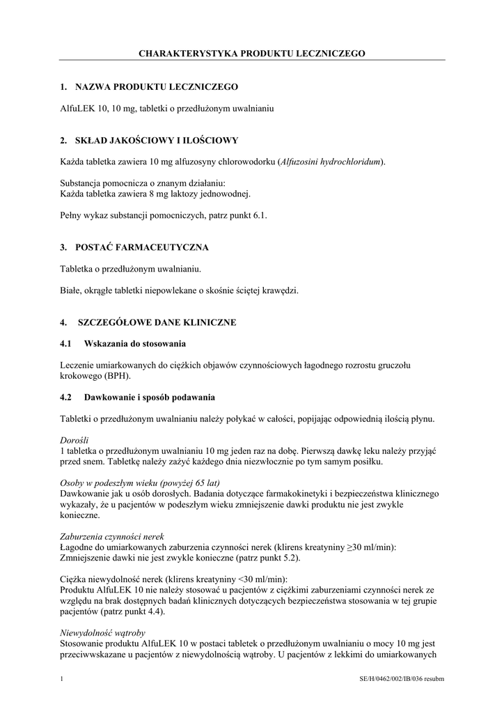 CHARAKTERYSTYKA PRODUKTU LECZNICZEGO 1. NAZWA PRODUKTU LECZNICZEGO AlfuLEK 10, 10 mg, tabletki o przedłużonym uwalnianiu 2. SKŁAD JAKOŚCIOWY I ILOŚCIOWY Każda tabletka zawiera 10 mg alfuzosyny chlorowodorku (Alfuzosini hydrochloridum). Substancja pomocnicza o znanym działaniu: Każda tabletka zawiera 8 mg laktozy jednowodnej. Pełny wykaz substancji pomocniczych, patrz punkt 6.1. 3. POSTAĆ FARMACEUTYCZNA Tabletka o przedłużonym uwalnianiu. Białe, okrągłe tabletki niepowlekane o skośnie ściętej krawędzi. 4. 4.1 SZCZEGÓŁOWE DANE KLINICZNE Wskazania do stosowania Leczenie umiarkowanych do ciężkich objawów czynnościowych łagodnego rozrostu gruczołu krokowego (BPH). 4.2 Dawkowanie i sposób podawania Tabletki o przedłużonym uwalnianiu należy połykać w całości, popijając odpowiednią ilością płynu. Dorośli 1 tabletka o przedłużonym uwalnianiu 10 mg jeden raz na dobę. Pierwszą dawkę leku należy przyjąć przed snem. Tabletkę należy zażyć każdego dnia niezwłocznie po tym samym posiłku. Osoby w podeszłym wieku (powyżej 65 lat) Dawkowanie jak u osób dorosłych. Badania dotyczące farmakokinetyki i bezpieczeństwa klinicznego wykazały, że u pacjentów w podeszłym wieku zmniejszenie dawki produktu nie jest zwykle konieczne. Zaburzenia czynności nerek Łagodne do umiarkowanych zaburzenia czynności nerek (klirens kreatyniny ≥30 ml/min): Zmniejszenie dawki nie jest zwykle konieczne (patrz punkt 5.2). Ciężka niewydolność nerek (klirens kreatyniny <30 ml/min): Produktu AlfuLEK 10 nie należy stosować u pacjentów z ciężkimi zaburzeniami czynności nerek ze względu na brak dostępnych badań klinicznych dotyczących bezpieczeństwa stosowania w tej grupie pacjentów (patrz punkt 4.4). Niewydolność wątroby Stosowanie produktu AlfuLEK 10 w postaci tabletek o przedłużonym uwalnianiu o mocy 10 mg jest przeciwwskazane u pacjentów z niewydolnością wątroby. U pacjentów z lekkimi do umiarkowanych 1 SE/H/0462/002/IB/036 resubm zaburzeniami czynności wątroby można stosować produkty lecznicze o małej zawartości alfuzosyny chlorowodorku (zgodnie z odpowiednimi zaleceniami dotyczącymi dawkowania w tej grupie pacjentów). Dzieci i młodzież Nie wykazano skuteczności alfuzosyny u dzieci w wieku od 2 do 16 lat (patrz punkt 5.1), dlatego jej stosowanie u dzieci i młodzieży nie jest wskazane. 4.3 4.4 Przeciwwskazania Nadwrażliwość na alfuzosynę, inne chinazoliny (np. terazosynę, doksazosynę, prazosynę) lub na którąkolwiek substancję pomocniczą wymienioną w punkcie 6.1. Stany przebiegające z hipotonią ortostatyczną. Niewydolność wątroby. Stosowanie jednocześnie z innymi lekami blokującymi receptory alfa-1-adrenergiczne. Specjalne ostrzeżenia i środki ostrożności dotyczące stosowania Produktu AlfuLEK 10 nie należy podawać pacjentom z ciężkimi zaburzeniami czynności nerek (klirens kreatyniny <30 ml/min), gdyż brak dostępnych badań klinicznych dotyczących bezpieczeństwa stosowania w tej grupie pacjentów. AlfuLEK 10 należy stosować ostrożnie u pacjentów otrzymujących leki przeciwnadciśnieniowe lub azotany. Należy systematycznie kontrolować ciśnienie tętnicze krwi, zwłaszcza na początku leczenia. U niektórych pacjentów w ciągu kilku godzin po podaniu preparatu może wystąpić niedociśnienie ortostatyczne, z objawami lub bez objawów (zawroty głowy, uczucie zmęczenia, pocenie się). Działanie to jest przemijające, występuje na początku leczenia i zwykle nie jest przeszkodą w jego kontynuowaniu. Pacjenta należy ostrzec o możliwości wystąpienia takich objawów i zalecić pozycję leżącą aż do ich całkowitego ustąpienia. W okresie po wprowadzeniu alfuzosyny do obrotu notowano znaczące zmniejszenie ciśnienia tętniczego u pacjentów z czynnikami ryzyka (tj. choroby serca i (lub) jednoczesne przyjmowanie leku przeciwnadciśnieniowego). Ryzyko niedociśnienia tętniczego i związanych z nim działań niepożądanych może być większe u osób w podeszłym wieku. Należy zachować ostrożność podczas stosowania alfuzosyny u pacjentów, u których wystąpiło znaczne niedociśnienie tętnicze w odpowiedzi na inne leki blokujące receptory alfa-1-adrenergiczne. Leczenie pacjentów z nadwrażliwością na inne leki blokujące receptory alfa-1-adrenergiczne należy rozpoczynać stopniowo. Podobnie, jak wszystkie leki blokujące receptory alfa-1-adrenergiczne, alfuzosynę należy stosować ostrożnie pacjentów z ostrą niewydolnością serca. U pacjentów z chorobami serca należy kontynuować leczenie niewydolności wieńcowej, biorąc pod uwagę fakt, że jednoczesne podawanie azotanów i alfuzosyny może zwiększyć ryzyko niedociśnienia tętniczego. W przypadku nawrotu lub nasilenia dławicy piersiowej należy przerwać leczenie alfuzosyną. W celu wykluczenia obecności innych chorób, które mogą powodować podobne objawy do łagodnego rozrostu gruczołu krokowego, przed rozpoczęciem leczenia alfuzosyną pacjentów należy zbadać. Pacjentom należy zalecić połykanie tabletki w całości. Należy unikać innego sposobu przyjmowania leku, takiego jak kruszenie, sproszkowanie lub żucie tabletki. Nieprawidłowe przyjmowanie leku może prowadzić do niepożądanego uwalniania i wchłaniania substancji czynnej, a w konsekwencji do 2 SE/H/0462/002/IB/036 resubm ryzyka wczesnych działań niepożądanych. U niektórych pacjentów w trakcie lub po leczeniu lekami alfa-1-adrenolitycznymi, obserwowano podczas chirurgicznego leczenia zaćmy wystąpienie śródoperacyjnego zespołu wiotkiej tęczówki (ang. Intraoperative Floppy Iris Syndrome – IFIS, odmiana zespołu małej źrenicy). Wprawdzie wydaje się, że ryzyko takiego zdarzenia podczas leczenia alfuzosyną jest znikome, jednak przed zabiegiem należy poinformować operującego okulistę o przyjmowaniu w przeszłości lub obecnie leku alfa-1adrenolitycznego, gdyż IFIS może prowadzić do nasilenia powikłań związanych