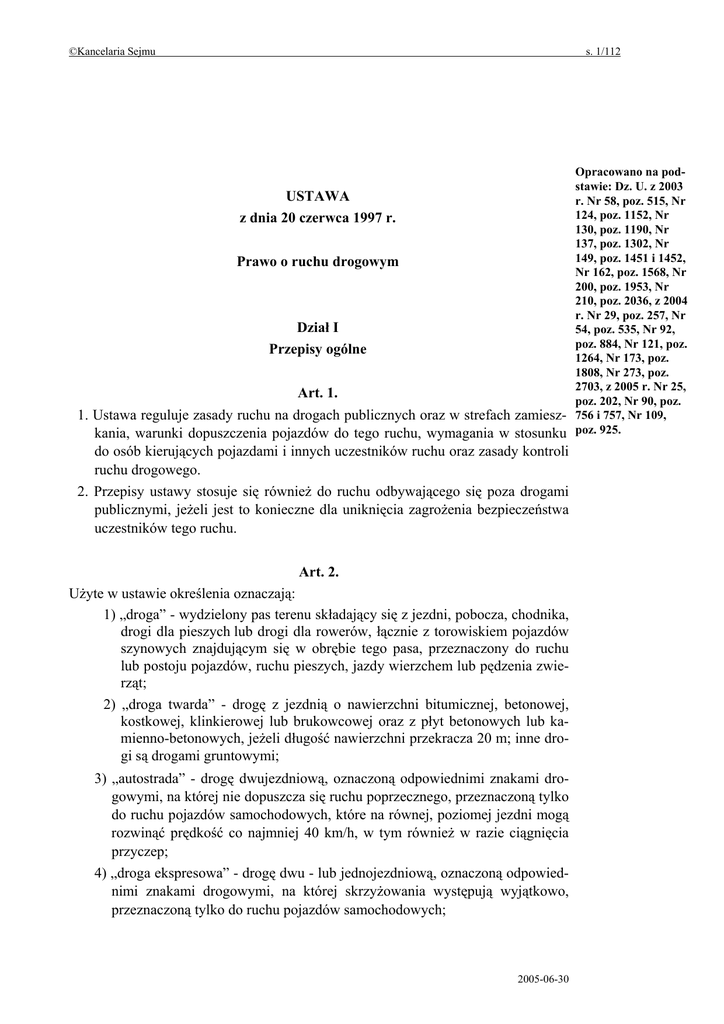©Kancelaria Sejmu s. 1/112 Opracowano na podstawie: Dz. U. z 2003 USTAWA r. Nr 58, poz. 515, Nr 124, poz. 1152, Nr z dnia 20 czerwca 1997 r. 130, poz. 1190, Nr 137, poz. 1302, Nr 149, poz. 1451 i 1452, Prawo o ruchu drogowym Nr 162, poz. 1568, Nr 200, poz. 1953, Nr 210, poz. 2036, z 2004 r. Nr 29, poz. 257, Nr Dział I 54, poz. 535, Nr 92, poz. 884, Nr 121, poz. Przepisy ogólne 1264, Nr 173, poz. 1808, Nr 273, poz. 2703, z 2005 r. Nr 25, Art. 1. poz. 202, Nr 90, poz. 1. Ustawa reguluje zasady ruchu na drogach publicznych oraz w strefach zamiesz- 756 i 757, Nr 109, kania, warunki dopuszczenia pojazdów do tego ruchu, wymagania w stosunku poz. 925. do osób kierujących pojazdami i innych uczestników ruchu oraz zasady kontroli ruchu drogowego. 2. Przepisy ustawy stosuje się również do ruchu odbywającego się poza drogami publicznymi, jeżeli jest to konieczne dla uniknięcia zagrożenia bezpieczeństwa uczestników tego ruchu. Art. 2. Użyte w ustawie określenia oznaczają: 1) „droga” - wydzielony pas terenu składający się z jezdni, pobocza, chodnika, drogi dla pieszych lub drogi dla rowerów, łącznie z torowiskiem pojazdów szynowych znajdującym się w obrębie tego pasa, przeznaczony do ruchu lub postoju pojazdów, ruchu pieszych, jazdy wierzchem lub pędzenia zwierząt; 2) „droga twarda” - drogę z jezdnią o nawierzchni bitumicznej, betonowej, kostkowej, klinkierowej lub brukowcowej oraz z płyt betonowych lub kamienno-betonowych, jeżeli długość nawierzchni przekracza 20 m; inne drogi są drogami gruntowymi; 3) „autostrada” - drogę dwujezdniową, oznaczoną odpowiednimi znakami drogowymi, na której nie dopuszcza się ruchu poprzecznego, przeznaczoną tylko do ruchu pojazdów samochodowych, które na równej, poziomej jezdni mogą rozwinąć prędkość co najmniej 40 km/h, w tym również w razie ciągnięcia przyczep; 4) „droga ekspresowa” - drogę dwu - lub jednojezdniową, oznaczoną odpowiednimi znakami drogowymi, na której skrzyżowania występują wyjątkowo, przeznaczoną tylko do ruchu pojazdów samochodowych; 2005-06-30 ©Kancelaria Sejmu s. 2/112 5) „droga dla rowerów” - drogę lub jej część przeznaczoną do ruchu rowerów jednośladowych, oznaczoną odpowiednimi znakami drogowymi; 6) „jezdnia” - część drogi przeznaczoną do ruchu pojazdów; określenie to nie dotyczy torowisk wydzielonych z jezdni; 7) „pas ruchu” - każdy z podłużnych pasów jezdni wystarczający do ruchu jednego rzędu pojazdów wielośladowych, oznaczony lub nieoznaczony znakami drogowymi; 8) „pobocze” - część drogi przyległą do jezdni, która może być przeznaczona do ruchu pieszych lub niektórych pojazdów, postoju pojazdów, jazdy wierzchem lub pędzenia zwierząt; 9) „chodnik” - część drogi przeznaczoną do ruchu pieszych; 10) „skrzyżowanie” - przecięcie się w jednym poziomie dróg mających jezdnię, ich połączenie lub rozwidlenie, łącznie z powierzchniami utworzonymi przez takie przecięcia, połączenia lub rozwidlenia; określenie to nie dotyczy przecięcia, połączenia lub rozwidlenia drogi twardej z drogą gruntową lub stanowiącą dojazd do obiektu znajdującego się przy drodze; 11) „przejście dla pieszych” - powierzchnię jezdni, drogi dla rowerów lub torowiska przeznaczoną do przechodzenia przez pieszych, oznaczoną odpowiednimi znakami drogowymi; 12) „przejazd dla rowerzystów” - powierzchnię jezdni lub torowiska przeznaczoną do przejeżdżania przez rowerzystów, oznaczoną odpowiednimi znakami drogowymi; 13) „przystanek” - miejsce zatrzymywania się pojazdów transportu publicznego, oznaczone odpowiednimi znakami drogowymi; 14) „tunel” - budowlę na drodze, oznaczoną odpowiednimi znakami drogowymi; 15) „obszar zabudowany” - obszar oznaczony odpowiednimi znakami drogowymi; 16) „strefa zamieszkania” - obszar obejmujący drogi publiczne lub inne drogi, na którym obowiązują szczególne zasady ruchu drogowego, a wjazdy i wyjazdy oznaczone są odpowiednimi znakami drogowymi; 17) „uczestnik ruchu” - pieszego, kierującego, a także inne osoby przebywające w pojeździe lub na pojeździe znajdującym się na drodze; 18) „pieszy” - osobę znajdującą się poza pojazdem na drodze i niewykonującą na niej robót lub czynności przewidzianych odrębnymi przepisami; za pieszego uważa się również osobę prowadzącą, ciągnącą lub pchającą rower, motorower, motocykl, wózek dziecięcy, podręczny lub inwalidzki, osobę poruszającą się w wózku inwalidzkim, a także osobę w wieku do 10 lat kierującą rowerem pod opieką osoby dorosłej; 19) „kolumna pieszych” - zorganizowaną grupę pieszych prowadzoną przez kierownika lub dowódcę; 20) „kierujący” - osobę, która kieruje pojazdem lub zespołem pojazdów, a także osobę, która prowadzi kolumnę pieszych, jedzie wierzchem albo pędzi zwierzęta pojedynczo lub w stadzie; 21) „kierowca” - osobę uprawnioną do kierowania pojazdem silnikowym; 22) „szczególna ostrożność” - ostrożność polegającą na zwiększeniu uwagi i dostosowaniu zachowania uczestnika ruchu do warunków i sytuacji zmieniają2005-06-30 ©Kancelaria Sejmu s. 3/112 cych się na drodze, w stopniu umożliwiającym odpowiednio szybkie reagowanie; 23) „ustąpienie pierwszeństwa” - powstrzymanie się od ruchu, jeżeli ruch mógłby zmusić innego kierującego do zmiany kierunku lub pasa ruchu albo istotnej zmiany prędkości, a pieszego - do zatrzymania się, zwolnienia lub przyspieszenia kroku; 24) „ruch kierowany” - ruch otwierany i zamykany za pomocą sygnalizacji świetlnej albo przez uprawnioną osobę; 25) „niedostateczna widoczność” - widoczność występującą od zmierzchu do świtu, a także w warunkach zmniejszonej przejrzystości powietrza od świtu do zmierzchu; 26) „wymijanie” - przejeżdżanie (przechodzenie) obok pojazdu lub uczestnika ruchu poruszającego się w przeciwnym kierunku; 27) „o
