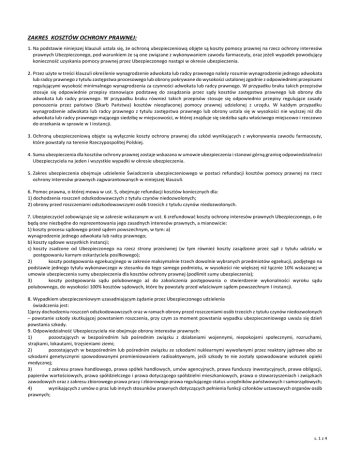 ZAKRES KOSZTÓW OCHRONY PRAWNEJ: 1. Na podstawie niniejszej klauzuli ustala się, że ochroną ubezpieczeniową objęte są koszty pomocy prawnej na rzecz ochrony interesów prawnych Ubezpieczonego, pod warunkiem że są one związane z wykonywaniem zawodu farmaceuty, oraz jeżeli wypadek powodujący konieczność uzyskania pomocy prawnej przez Ubezpieczonego nastąpi w okresie ubezpieczenia. 2. Przez użyte w treści klauzuli określenie wynagrodzenie adwokata lub radcy prawnego należy rozumie wynagrodzenie jednego adwokata lub radcy prawnego z tytułu zastępstwa procesowego lub obrony pokrywane do wysokości ustalonej zgodnie z odpowiednimi przepisami regulującymi wysokość minimalnego wynagrodzenia za czynności adwokata lub radcy prawnego. W przypadku braku takich przepisów stosuje się odpowiednie przepisy stanowiące podstawę do zasądzania przez sądy kosztów zastępstwa prawnego lub obrony dla adwokata lub radcy prawnego. W przypadku braku również takich przepisów stosuje się odpowiednio przepisy regulujące zasady ponoszenia przez państwo (Skarb Państwa) kosztów nieopłaconej pomocy prawnej udzielonej z urzędu. W każdym przypadku wynagrodzenie adwokata lub radcy prawnego z tytułu zastępstwa prawnego lub obrony ustala się w wysokości nie wyższej niż dla adwokata lub radcy prawnego mającego siedzibę w miejscowości, w której znajduje się siedziba sądu właściwego miejscowo i rzeczowo do orzekania w sprawie w I instancji. 3. Ochroną ubezpieczeniową objęte są wyłącznie koszty ochrony prawnej dla szkód wynikających z wykonywania zawodu farmaceuty, które powstały na terenie Rzeczypospolitej Polskiej. 4. Suma ubezpieczenia dla kosztów ochrony prawnej zostaje wskazana w umowie ubezpieczenia i stanowi górną granicę odpowiedzialności Ubezpieczyciela na jeden i wszystkie wypadki w okresie ubezpieczenia. 5. Zakres ubezpieczenia obejmuje udzielenie Świadczenia ubezpieczeniowego w postaci refundacji kosztów pomocy prawnej na rzecz ochrony interesów prawnych zagwarantowanych w niniejszej klauzuli. 6. Pomoc prawna, o której mowa w ust. 5, obejmuje refundacji kosztów koniecznych dla: 1) dochodzenia roszczeń odszkodowawczych z tytułu czynów niedozwolonych; 2) obrony przed roszczeniami odszkodowawczymi osób trzecich z tytułu czynów niedozwolonych. 7. Ubezpieczyciel zobowiązuje się w zakresie wskazanym w ust. 6 zrefundować koszty ochrony interesów prawnych Ubezpieczonego, o ile będą one niezbędne do reprezentowania jego zasadnych interesów prawnych, a mianowicie: 1) koszty procesu sądowego przed sądem powszechnym, w tym: a) wynagrodzenie jednego adwokata lub radcy prawnego; b) koszty sądowe wszystkich instancji; c) koszty zsadzone od Ubezpieczonego na rzecz strony przeciwnej (w tym również koszty zasądzone przez sąd z tytułu udziału w postępowaniu karnym oskarżyciela posiłkowego); 2) koszty postępowania egzekucyjnego w zakresie maksymalnie trzech dowolnie wybranych przedmiotów egzekucji, podjętego na podstawie jednego tytułu wykonawczego w stosunku do tego samego podmiotu, w wysokości nie większej niż łącznie 10% wskazanej w umowie ubezpieczenia sumy ubezpieczenia dla kosztów ochrony prawnej (podlimit sumy ubezpieczenia); 3) koszty postępowania sądu polubownego aż do zakończenia postępowania o stwierdzenie wykonalności wyroku sądu polubownego, do wysokości 100% kosztów sądowych, które by powstały przed właściwym sądem powszechnym I instancji. 8. Wypadkiem ubezpieczeniowym uzasadniającym żądanie przez Ubezpieczonego udzielenia świadczenia jest: 1)przy dochodzeniu roszczeń odszkodowawczych oraz w ramach obrony przed roszczeniami osób trzecich z tytułu czynów niedozwolonych – powstanie szkody skutkującej powstaniem roszczenia, przy czym za moment powstania wypadku ubezpieczeniowego uważa się dzień powstania szkody. 9. Odpowiedzialność Ubezpieczyciela nie obejmuje obrony interesów prawnych: 1) pozostających w bezpośrednim lub pośrednim związku z działaniami wojennymi, niepokojami społecznymi, rozruchami, strajkami, lokautami, trzęsieniami ziemi; 2) pozostających w bezpośrednim lub pośrednim związku ze szkodami nuklearnymi wywołanymi przez reaktory jądrowe albo ze szkodami genetycznymi spowodowanymi promieniowaniem radioaktywnym, jeśli szkody te nie zostały spowodowane wskutek opieki medycznej; 3) z zakresu prawa handlowego, prawa spółek handlowych, umów agencyjnych, prawa funduszy inwestycyjnych, prawa obligacji, papierów wartościowych, prawa spółdzielczego i prawa dotyczącego spółdzielni mieszkaniowych, prawa o stowarzyszeniach i związkach zawodowych oraz z zakresu zbiorowego prawa pracy i zbiorowego prawa regulującego status urzędników państwowych i samorządowych; 4) wynikających z umów o prac lub innych stosunków prawnych dotyczących pełnienia funkcji członków ustawowych organów osób prawnych; s. 1 z 4 5) z zakresu prawa patentowego, autorskiego, znaków towarowych, pozostałego prawa własności intelektualnej i przemysłowej, prawa ochrony konkurencji (antymonopolowego) oraz prawa dotyczącego zasad konkurencji; 6) pozostającymi w związku z grą i zakładem oraz transakcjami terminowymi i spekulacyjnymi; 7) z umów poręczenia i przejęcia długów; 8) z zakresu prawa budowlanego oraz pozostających w związku z: a) nabyciem albo zbyciem nieruchomości przeznaczonej pod zabudowę; b) planowaniem, projektowaniem lub budową budynku albo części budynku, które są własnością lub znajdują się w posiadaniu Ubezpieczonego albo też Ubezpieczony zamierza je nabyć lub objąć w posiadanie; c) przebudową nieruchomości, budynku lub części budynku, jeżeli do jej dokonania konieczne jest uzyskanie jakichkolwiek zezwoleń lub pozwoleń, a nieruchomość, budynek lub część budynku są własnością lub znajdują się w posiadaniu Ubezpieczonego albo też Ubezpieczony zamierza je nabyć lub objąć w posiadanie; d) finansowaniem przedsięwz