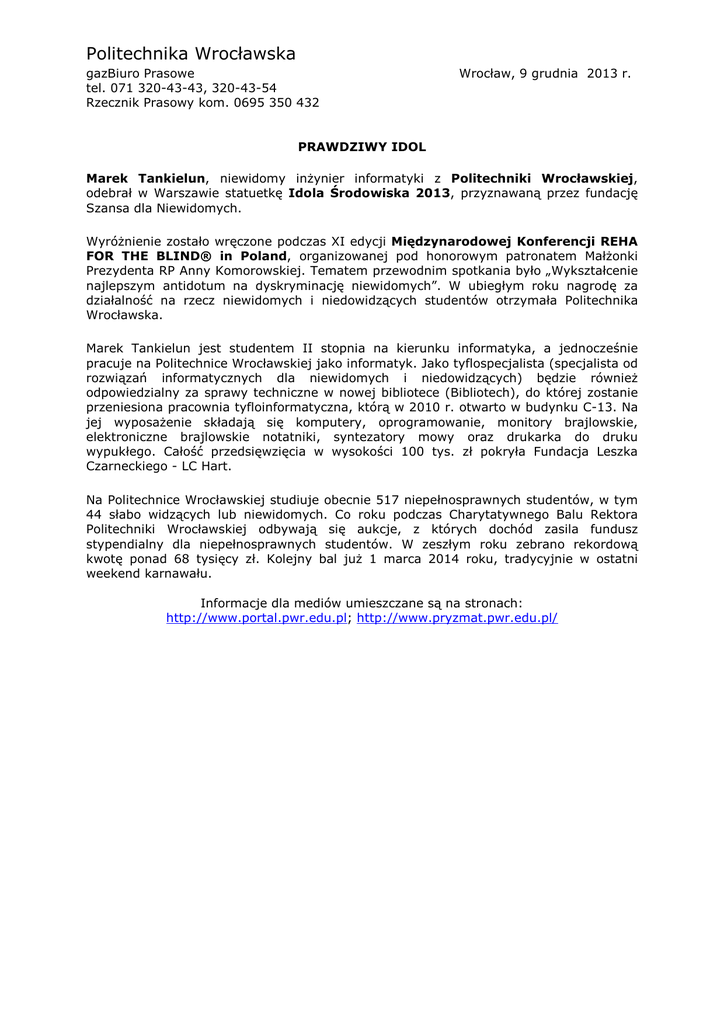 Politechnika Wrocławska gazBiuro Prasowe tel. 071 320-43-43, 320-43-54 Rzecznik Prasowy kom. 0695 350 432 Wrocław, 9 grudnia 2013 r. PRAWDZIWY IDOL Marek Tankielun, niewidomy inżynier informatyki z Politechniki Wrocławskiej, odebrał w Warszawie statuetkę Idola Środowiska 2013, przyznawaną przez fundację Szansa dla Niewidomych. Wyróżnienie zostało wręczone podczas XI edycji Międzynarodowej Konferencji REHA FOR THE BLIND® in Poland, organizowanej pod honorowym patronatem Małżonki Prezydenta RP Anny Komorowskiej. Tematem przewodnim spotkania było „Wykształcenie najlepszym antidotum na dyskryminację niewidomych”. W ubiegłym roku nagrodę za działalność na rzecz niewidomych i niedowidzących studentów otrzymała Politechnika Wrocławska. Marek Tankielun jest studentem II stopnia na kierunku informatyka, a jednocześnie pracuje na Politechnice Wrocławskiej jako informatyk. Jako tyflospecjalista (specjalista od rozwiązań informatycznych dla niewidomych i niedowidzących) będzie również odpowiedzialny za sprawy techniczne w nowej bibliotece (Bibliotech), do której zostanie przeniesiona pracownia tyfloinformatyczna, którą w 2010 r. otwarto w budynku C-13. Na jej wyposażenie składają się komputery, oprogramowanie, monitory brajlowskie, elektroniczne brajlowskie notatniki, syntezatory mowy oraz drukarka do druku wypukłego. Całość przedsięwzięcia w wysokości 100 tys. zł pokryła Fundacja Leszka Czarneckiego - LC Hart. Na Politechnice Wrocławskiej studiuje obecnie 517 niepełnosprawnych studentów, w tym 44 słabo widzących lub niewidomych. Co roku podczas Charytatywnego Balu Rektora Politechniki Wrocławskiej odbywają się aukcje, z których dochód zasila fundusz stypendialny dla niepełnosprawnych studentów. W zeszłym roku zebrano rekordową kwotę ponad 68 tysięcy zł. Kolejny bal już 1 marca 2014 roku, tradycyjnie w ostatni weekend karnawału. Informacje dla mediów umieszczane są na stronach: http://www.portal.pwr.edu.pl; http://www.pryzmat.pwr.edu.pl/