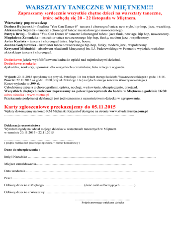 WARSZTATY TANECZNE W MIĘTNEM!!! Zapraszamy serdecznie wszystkie chętne dzieci na warsztaty taneczne, które odbędą się 20 - 22 listopada w Miętnem. Warsztaty poprowadzą: Dariusz Bujnowski – finalista "You Can Dance 6" tancerz i choreograf tańca: new style, hip-hop, jazz, waacking. Aleksandra Szpinda - tancerz i choreograf tańca: musicalowego i nowoczesnego. Patryk Brdej - finalista "You Can Dance 8" tancerz i choreograf tańca: jazz funk, new age, hip hop, nowoczesny. Magdalena Zawadzka - instruktor tańca nowoczesnego hip-hop, funky, modern jazz , współczesny. Artur Kuriata – tancerz i choreograf tańca: hip hop, house. Joanna Gołębiowska - instruktor tańca nowoczesnego hip-hop, funky, modern jazz , współczesny. Krzysztof Michalski - absolwent Akademii Muzycznej im. I.J. Paderewskiego w Poznaniu wydziału wokalnoaktorskiego tancerz i choreograf. Dodatkowo jedzie wykfalifikowana kadra do opieki nad najmłodszymi dziećmi. Dodatkowe atrakcje: dyskoteka, konkursy, upominki dla wszystkich uczestników, foto relacja z wyjazdu. Wyjazd: 20.11.2015 spotykamy się przy ul. Petofiego 1A (na tyłach starego kościoła Wawrzyszewskiego) o godz. 16:15. Powrót: 22.11.2015 ok godz. 19:00 przy ul. Petofiego 1A ( na tyłach starego kościoła Wawrzyszewskiego ) Koszt wyjazdu to 399 zł. Całodzienne zajęcia z choreografami, opieka, noclegi, wyżywienie, ubezpieczenie, przejazd. Wszystkich chętnych rodziców zapraszamy na pokaz i poczęstunek do hotelu w Miętnem o godzinie 16:30 adres ośrodka - www.mietne.pl Przekazanie podpisanej deklaracji jest jednoznaczne z uczestnictwem dziecka w zgrupowaniu. Karty zgłoszeniowe przekazujemy do 05.11.2015 Wpłaty dokonujemy na konto KM Michalski Krzysztof dostępne na stronie www.vivalamusica.com.pl ………………………………………………………………………………………………….. Deklaracja uczestnictwa Wyrażam zgodę na udział mojego dziecka w warsztatach tanecznych w Miętnem w terminie 20.11.2015 - 22.11.2015 ……………………………………………………. ( podpis rodzica lub prawnego opiekuna + numer kontaktowy ) Dane do ubezpieczenia : Imię i Nazwisko ………………………………………………………………………………………………… Miejsce zameldowania…..……………………………………………………………………. Data urodzenia …..…………………………………………………………………………………………….. Pesel…………………………………………………………………………………………… Odbiorę dziecko z Miętnego …………………………… .(ilość osób odbierających………….) Odbiorę dziecko z Warszawy ……………………........................ ………………………………………… Podpis prawnego opiekuna dziecka