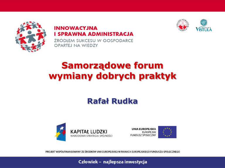Samorządowe forum wymiany dobrych praktyk Rafał Rudka Elementy realizacji zadania 1. Konferencja inauguracyjna 2. Fora wymiany dobrych praktyk i promocji 3. 4. 5. 6. dialogu pomiędzy JST, a organizacjami JST Konkurs promujący innowacje w samorządzie Baza dobrych praktyk Publikacja promocyjna Konferencja podsumowująca Fora wymiany dobrych praktyk i promocji dialogu pomiędzy JST, a organizacjami JST W ramach projektu zorganizujemy 12 spotkań regionalnych poświęconych wymianie dobrych praktyk i promocji dialogu pomiędzy JST, a organizacjami JST. Każdy z samorządów uczestniczących w projekcie będzie gospodarzem jednego spotkania (przy współpracy i jednocześnie współuczestnictwie innych JST i organizacji JST). Podczas spotkań samorządy będą prezentowały swoje dobre praktyki. Forma: spotkania, jako warsztaty promocji dobrych praktyk, a także pomysłów na ich adaptację Konkurs Samorządowy Lider Zarządzania Związek Powiatów Polskich wspólnie ze Związkiem Miast Polskich oraz Związkiem Gmin Wiejskich od 2007 roku co rocznie realizuje konkurs o nazwie Samorządowy Lider Zarządzania Celem konkursu jest poprawa jakości usług świadczonych obywatelom przez administrację samorządową i podległe jej podmioty poprzez: wyłonienie JST, które wdrożyły w ostatnich latach nowoczesne, innowacyjne rozwiązanie zarządcze, zintegrowane z innymi obszarami lub narzędziami zarządzania strategicznego, upowszechnienie nagrodzonych i wyróżnionych rozwiązań wśród innych JST w Polsce. Konkurs promujący innowacje w samorządzie W 2013 roku ogłosimy nabór do konkursu promującego innowacje w samorządzie Pod koniec 2013 roku wyłonimy zwycięzców Nagrodą w konkursie będą wyróżnienia i dyplomy oraz realizacja filmu promującego innowacyjną i dobrą praktykę. Zwycięskie dobre praktyki, poza promocją w ramach strony internetowej projektu (www.innowacyjna.zpp.pl), zostaną także zamieszczone na stronie internetowej www.dobrepraktyki.pl (będącej największą biblioteką dobrych wdrożeń funkcjonujących w samorządach), a także będą promowane na ogólnopolskim samorządowym portalu informacyjnym – Dziennik Warto Wiedzieć (www.wartowiedziec.org). Baza dobrych praktyk Elementami projektowej Bazy dobrych praktyk będą: Baza dobrych praktyk – zlokalizowana pod adresem: www.dobrepraktyki.pl źródło danych: konkurs, realizacje omawiane na spotkaniach regionalnych, inne – powstałe w ramach projektu Baza wiedzy prawnej – www.innowacyjna.zpp.pl źródło danych: odpowiedzi na pytania powstałe w ramach wdrażania projektu (doradztwo), działania realizatorów projektu Pytania proszę kierować na adres: [email protected] Telewizyjna baza dobrych praktyk – portal szkoleniowo-edukacyjny promujący dobre praktyki w JST utworzony w ramach telewizji internetowej – http://powiat.tv-t.pl/ źródło danych: realizacje filmowe innowacyjnych rozwiązań www.innowacyjna.zpp.pl – funkcja centralna – przekierowującą Harmonogram realizacji zadania Publikacja promocyjna i konferencja podsumowująca Na zakończenie naszych działań planujemy wydanie publikacji promującej wszystkie dobre praktyki opisane w ramach projektu Zwieńczeniem tego zadania będzie konferencja podsumowująca zaplanowana na ostatni kwartał realizacji projektu (II kw. 2015 roku) Dziękuję za uwagę Rafał Rudka