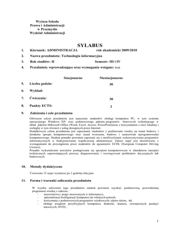 WyŜsza Szkoła Prawa i Administracji w Przemyślu Wydział Administracji SYLABUS 1. Kierunek: ADMINISTRACJA rok akademicki 2009/2010 2. Nazwa przedmiotu: Technologia informacyjna 3. Rok studiów: II 4. Przedmioty wprowadzające oraz wymagania wstępne: brak Semestr: III i IV Stacjonarne Niestacjonarne 5. Liczba godzin: 6. Wykład: 7. Ćwiczenia: 30 8. Punkty ECTS: 2 9. ZałoŜenia i cele przedmiotu 30 Głównym celem przedmiotu jest nauczenie studentów obsługi komputera PC, w tym systemu operacyjnego Windows /XP/ oraz podstawowego pakietu programów biurowych wchodzącego w skład pakietu Mikrosoft Office (Word, Excel, Access, PowerPoint)oraz z korzystaniem z sieci lokalnej i rozległej w tym równieŜ z usług dostępnych przez Internet. Dodatkowym celem przedmiotu jest zapoznanie studentów z podstawami wiedzy na temat budowy i działania sprzętu komputerowego oraz zasad tworzenia, budowy i zastosowań oprogramowania komputerowego. Student ponadto powinien zapoznać się z moŜliwościami wykorzystywania programów informatycznych w funkcjonowaniu współczesnej administracji. Zakres zajęć jest skorelowany z wymaganiami do przystąpienia przez studentów do egzaminów ECDL (European Computer Driving Licence). Ponadto wykształcenie nawyków posługiwania się sprzętem komputerowym w charakterze narzędzi technicznych usprawniających procesy diagnozowania i rozwiązywani problemów decyzyjnych lub badawczych. . 10. Metody dydaktyczne Ćwiczenia 15 zajęć wymiarze po 2 godziny lekcyjne 11. Forma i warunki zaliczenia przedmiotu W wyniku zaliczenia tego przedmiotu student powinien uzyskać, podstawową, przewidzianą programem wiedzę z zakresu: nazewnictwa i pojęć stosowanych w informatyce, optymalizacji konfiguracji komputera do własnych potrzeb, korzystania z podstawowych programów uŜytkowych; edytor tekstu, itd. obsługi urządzeń peryferyjnych komputera; drukarki, skanera, zewnętrznych pamięci masowych, DVD) , 1 12. Lp. I II III IV V Treści programowe Tematyka zajęć Temat: Zajęcia organizacyjne. Podstawowe pojęcia i określenia stosowane w informatyce. Problemy: Podział roku na grupy ćwiczeniowe z uwzględnieniem stopnia zaawansowania w posługiwaniu się komputerem. Przydział stanowisk pracy. Przedstawienie regulaminu pracy w pracowni oraz zasad bezpieczeństwa i higieny pracy przy sprzęcie informatycznym. Omówienie programu nauczania i zasad zaliczenia przedmiotu. Wyjaśnienie pojęć: informacja i informatyka. Jednostki zapisu informacji cyfrowe: wektor informacji (bajt, rekord, pole rekordu, zbiór, pole rekordu, zbiór, plik, katalog). System liczbowe. Definicja komputera, system komputerowy, architektura współczesnego komputera. Pamięci dyskowe. Organizacja zapisu na dysku. Twardy dysk. Pamięć RAM i ROM. BIOS Podstawowe pojęcia i określenia stosowane w informatyce. Rola i zadania systemu operacyjnego komputera, budowa systemu. Rodzaje i charakterystyka systemów operacyjnych. Prawo autorskie,. Temat: Urządzenia peryferyjne komputera. Środowisko WINDOWS i praca w nim. Problemy: Rodzaje urządzeń peryferyjnych (klawiatura, monitor, mysz, drukarka stacja dyskietek, skaner, CD-ROM itd. ) Zasady działania i zastosowanie. Graficzny system komunikacji komputera z uŜytkownikiem. Funkcje ikon i okien systemie WINDOWS. Zasady posługiwania się myszką. Praca w oknach. Zarządzanie plikami (kopiowanie, przenoszenie, kasowanie, wyszukiwanie, kosz). Temat: pliki i foldery – tworzenie, kopiowanie, usuwanie, zapisywanie, wyszukiwanie, uruchamianie programów formatowanie dysków, technika „przyciągnij i upuść’ Temat: Elektroniczna edycja tekstów. Problemy: Podstawowe funkcje i budowa edytora WORD. Wprowadzanie tekstu (znaki polskie, przemieszczanie się w obrębie tekstu i strony. Edycja tekstu. Zapisywanie dokumentu na dysku. Definiowanie układu strony. Odstępy między liniami (interlinia) , wcięcia. Funkcje akapitu. Odtwarzanie tekstu z pamięci dyskowej. Temat: Edytor tekstu WORD. Wstawianie obiektów zewnętrznych. Liczba godzin stacjonarne wykład ćwiczenia Liczba godzin niestacjonarne wykład ćwiczenia 2 2 2 2 2 Problemy: Umieszczanie symboli i grafiki w dokumencie. Formatowanie wstawionych obiektów. Wyszukiwanie i zamiana podanego ciągu znaków. Wstawianie numerów stron. Opcje druku. Podgląd wydruku. Drukowa nie tekstu. Przypisy. RóŜne rodzaje, wstawianie, edycja, kasowanie, numerowanie ręczne i automatyczne, formatowanie przypisów. Style. Definiowanie i formatowanie dokumentów z wykorzystaniem opcji style. VI VII VIII IX X XI XII Temat: Edytor WORD – praca z tabelami. Problemy: Projektowanie, skalowanie i wklejanie tabel. Formatowanie do potrzeb uŜytkownik. Temat: Kolokwium Problemy: Sformatowanie zadanego tekstu według podanego wzorca. Wstawienie tabeli i przeformatowanie jej zgodnie z zadanymi parametrami Temat: Edytor WORD – korespondencja seryjna. Problemy: Wiązanie dokumentu WORD z róŜnymi źródłami danych. Tworzenie dokumentu głównego korespondencji seryjnej. Generowanie automatycznych dokumentów zgodnie ze wzorcem. Zastosowanie instrukcji warunkowych. Kody pól (korekta korespondenci seryjnej). Temat: edytor wzorów matematycznych Uruchomienie edytora tekstów Microsoft Word. Uruchomienie edytora wzorów matematycznych Wprowadzanie róŜnych, coraz trudniejszych wzorów matematycznych. Edycja i poprawianie wzorów Temat: procesor tekstu Word jako edytor stron www Uruchomienie edytora tekstów Microsoft Word Wprowadzenie tekstu ćwiczeniowego Sformatowanie tekstu, dodanie grafiki, wypełnień tła Zapis dokumentu jako dokument html Przeglądanie zapisanego dokumentu w przeglądarce Microsoft Internet Explorer Temat: konspekt dokumentu - spis treści Uruchomienie edytora tekstów Microsoft Word Wprowadzenie tekstu ćwiczeniowego Formatowanie nagłówków Widok konspektu, wybór poziomów nagłówków prezentowanych na widoku konspektu Tworzenie spisu treści Temat: tworzenie grafiki oraz uatrakcyjnianie 